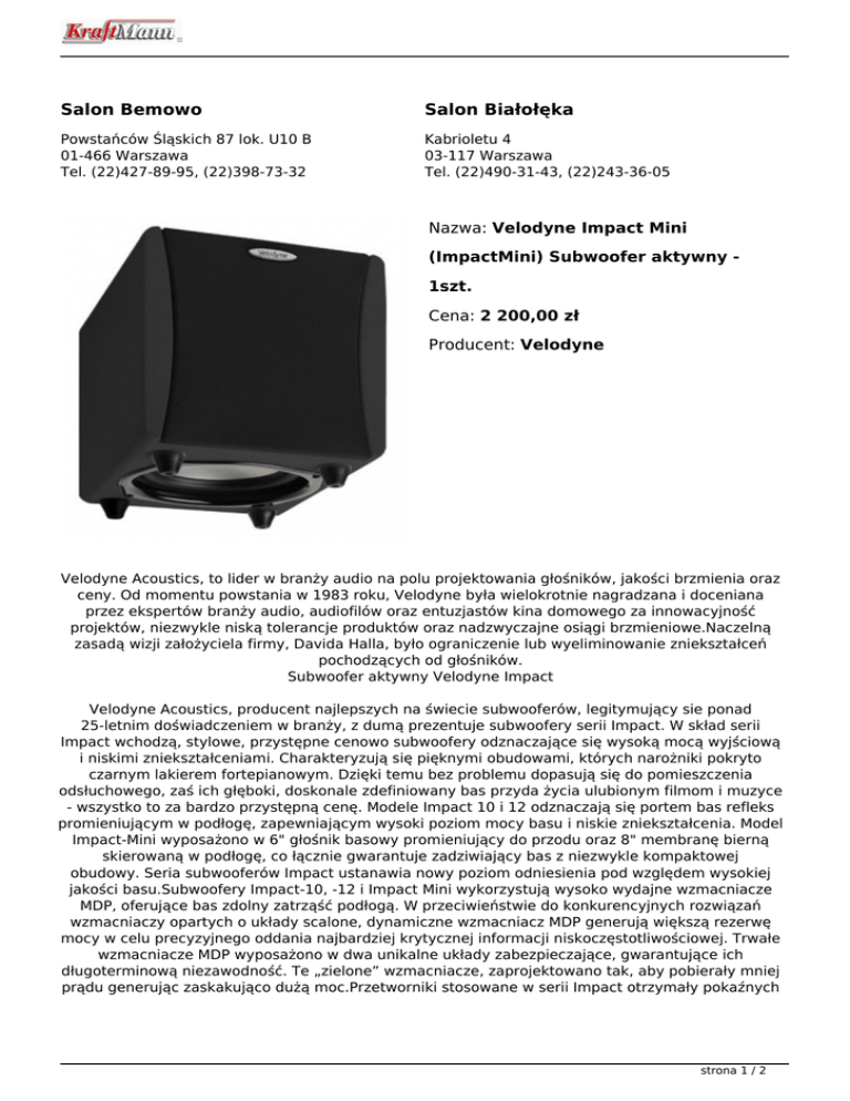 Salon Bemowo Salon Białołęka Powstańców Śląskich 87 lok. U10 B 01-466 Warszawa Tel. (22)427-89-95, (22)398-73-32 Kabrioletu 4 03-117 Warszawa Tel. (22)490-31-43, (22)243-36-05 Nazwa: Velodyne Impact Mini (ImpactMini) Subwoofer aktywny 1szt. Cena: 2 200,00 zł Producent: Velodyne Velodyne Acoustics, to lider w branży audio na polu projektowania głośników, jakości brzmienia oraz ceny. Od momentu powstania w 1983 roku, Velodyne była wielokrotnie nagradzana i doceniana przez ekspertów branży audio, audiofilów oraz entuzjastów kina domowego za innowacyjność projektów, niezwykle niską tolerancje produktów oraz nadzwyczajne osiągi brzmieniowe.Naczelną zasadą wizji założyciela firmy, Davida Halla, było ograniczenie lub wyeliminowanie zniekształceń pochodzących od głośników. Subwoofer aktywny Velodyne Impact Velodyne Acoustics, producent najlepszych na świecie subwooferów, legitymujący sie ponad 25-letnim doświadczeniem w branży, z dumą prezentuje subwoofery serii Impact. W skład serii Impact wchodzą, stylowe, przystępne cenowo subwoofery odznaczające się wysoką mocą wyjściową i niskimi zniekształceniami. Charakteryzują się pięknymi obudowami, których narożniki pokryto czarnym lakierem fortepianowym. Dzięki temu bez problemu dopasują się do pomieszczenia odsłuchowego, zaś ich głęboki, doskonale zdefiniowany bas przyda życia ulubionym filmom i muzyce - wszystko to za bardzo przystępną cenę. Modele Impact 10 i 12 odznaczają się portem bas refleks promieniującym w podłogę, zapewniającym wysoki poziom mocy basu i niskie zniekształcenia. Model Impact-Mini wyposażono w 6" głośnik basowy promieniujący do przodu oraz 8" membranę bierną skierowaną w podłogę, co łącznie gwarantuje zadziwiający bas z niezwykle kompaktowej obudowy. Seria subwooferów Impact ustanawia nowy poziom odniesienia pod względem wysokiej jakości basu.Subwoofery Impact-10, -12 i Impact Mini wykorzystują wysoko wydajne wzmacniacze MDP, oferujące bas zdolny zatrząść podłogą. W przeciwieństwie do konkurencyjnych rozwiązań wzmacniaczy opartych o układy scalone, dynamiczne wzmacniacz MDP generują większą rezerwę mocy w celu precyzyjnego oddania najbardziej krytycznej informacji niskoczęstotliwościowej. Trwałe wzmacniacze MDP wyposażono w dwa unikalne układy zabezpieczające, gwarantujące ich długoterminową niezawodność. Te „zielone” wzmacniacze, zaprojektowano tak, aby pobierały mniej prądu generując zaskakująco dużą moc.Przetworniki stosowane w serii Impact otrzymały pokaźnych strona 1 / 2 rozmiarów układy magnetyczne i 2” miedziane cewki, aby idealnie współpracowały ze wzmacniaczami MDP, maksymalizując tym samym moc i rozciągnięcie basu każdego subwoofera. Przetworniki Impact, odznaczające się dużym wychyleniem membrany i zdolnością do oddawania dużej mocy, sprawiają że subwoofery te mogą grać niżej i głośniej niż produkty konkurencyjne w zbliżonej cenie. Potężne układy magnetyczne i drogie cewki głośników szybciej odprowadzają ciepło, co dodatkowo zwiększa i tak niezwykłą już niezawodność tych produktów.Subwoofery Velodyne zawsze były znane z dokładności, generując ułamek zniekształceń w porównaniu do produktów konkurencji. Wyposażone w promieniujący w podłogę port bas-refleks modele Impact-10 i Impact 12 charakteryzują się potężnym basem a zarazem niskim szumem turbulencyjnym powietrza uchodzącego przez port, co przekłada się na poprawę precyzji, muzykalności i uderzenia dźwięku.Inżynierski klejnot, model Impact-Mini wykorzystuje bardzo lekką 6.5” membranę aluminiową i promieniującą w podłogę membranę pasywną do wytworzenia zaskakująco niskiego i potężnego basu, jak na tak umiarkowaną cenę. Aluminiowa membrana w kształcie misy, przyczynia się do ograniczenia powstawania fal stojących i maksymalizacji potęgi dźwięku. Niezwykle małe wymiary obudowy (28 x 25.4 x 30,5 cm) sprawiają, że subwoofer posiada niesamowitą zdolność do kamuflażu w otoczeniu. Jest na tyle mały, że z łatwością może być schowany, lecz estetyczna obudowa i elementy dekoracyjne pokryte czarnym lakierem na wysoki połysk, sprawiają, że będzie on pasował do każdego wystroju pomieszczenia.Cechy:Wzmacniacze MDP odznaczające się większym zapasem dynamiki w celu zagwarantowania większego uderzenia basuWysokiej klasy przetworniki o długim skoku membranyMiedziane cewki o średnicy 2"sPromieniujące w podłogę porty bas refleks (Impact-10 i -12) i promieniujący w podłogę membrana bierna (Impact-Mini) dla zapewnienia większej mocy wyjściowej i mniejszych zniekształceń.Regulowana, wysokiej klasy zwrotnica, umożliwiająca dopasowanie subwoofera do posiadanych głośników głównychMałe obudowy, przyjazne dla otoczenia.Układ auto on/off przyczyniający się do oszczędności energii.Regulacja fazy w celu zmaksymalizowania osiągów basu i lepszego dopasowania do posiadanych zestawów głośnikowych Impact Mini - Specyfikacja: Subwoofer aktywny do kina domowego o mocy 180 W RMS Wzmacniacz: Klasa D, moc RMS 180 W, moc szczytowa: 300 W Głośnik basowy: 6,5” (16,5 cm) aktywny; 8” (20,3 cm) pasywny Zwrotnica górnoprzepustowa: PełnopasmowaZwrotnica dolno-przepustowa: 50 Hz - 200 HzFaza: 0º - 180ºPasmo przenoszenia: 38 - 140 Hz (+/- 3dB) Cewka 2” - miedziana Auto On/OffUkład magnetyczny: 1,8 kgPozłacane wejścia, wyjściaZdejmowana maskownicaObudowa wentylowana basrefleksWymiary: 28,4 x 25,4 x 32 cmWaga: 8,4 kg Dostępne kolory: czarny jesion, biały Wejścia: Liniowe RCA, LFE, głośnikowe Wyjścia: Stereo, lewe i prawe, głośnikowe Towar jest fabrycznie nowy w oryginalnym opakowaniu. Pochodzi od oficjalnego Polskiego dystrybutora i jest objęty 24 miesięczną gwarancją. Cena za sztukę. strona 2 / 2 Powered by TCPDF (www.tcpdf.org)