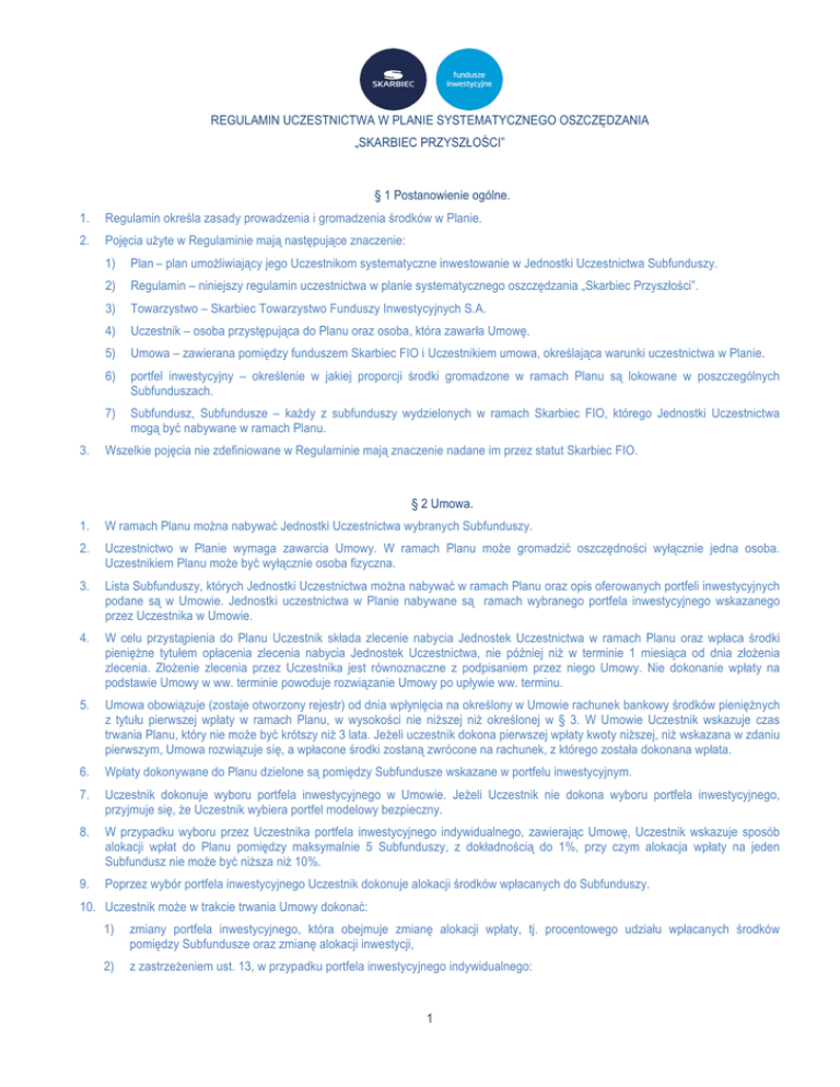 REGULAMIN UCZESTNICTWA W PLANIE SYSTEMATYCZNEGO OSZCZĘDZANIA „SKARBIEC PRZYSZŁOŚCI” § 1 Postanowienie ogólne. 1. Regulamin określa zasady prowadzenia i gromadzenia środków w Planie. 2. Pojęcia użyte w Regulaminie mają następujące znaczenie: 3. 1) Plan – plan umożliwiający jego Uczestnikom systematyczne inwestowanie w Jednostki Uczestnictwa Subfunduszy. 2) Regulamin – niniejszy regulamin uczestnictwa w planie systematycznego oszczędzania „Skarbiec Przyszłości”. 3) Towarzystwo – Skarbiec Towarzystwo Funduszy Inwestycyjnych S.A. 4) Uczestnik – osoba przystępująca do Planu oraz osoba, która zawarła Umowę. 5) Umowa – zawierana pomiędzy funduszem Skarbiec FIO i Uczestnikiem umowa, określająca warunki uczestnictwa w Planie. 6) portfel inwestycyjny – określenie w jakiej proporcji środki gromadzone w ramach Planu są lokowane w poszczególnych Subfunduszach. 7) Subfundusz, Subfundusze – każdy z subfunduszy wydzielonych w ramach Skarbiec FIO, którego Jednostki Uczestnictwa mogą być nabywane w ramach Planu. Wszelkie pojęcia nie zdefiniowane w Regulaminie mają znaczenie nadane im przez statut Skarbiec FIO. § 2 Umowa. 1. W ramach Planu można nabywać Jednostki Uczestnictwa wybranych Subfunduszy. 2. Uczestnictwo w Planie wymaga zawarcia Umowy. W ramach Planu może gromadzić oszczędności wyłącznie jedna osoba. Uczestnikiem Planu może być wyłącznie osoba fizyczna. 3. Lista Subfunduszy, których Jednostki Uczestnictwa można nabywać w ramach Planu oraz opis oferowanych portfeli inwestycyjnych podane są w Umowie. Jednostki uczestnictwa w Planie nabywane są ramach wybranego portfela inwestycyjnego wskazanego przez Uczestnika w Umowie. 4. W celu przystąpienia do Planu Uczestnik składa zlecenie nabycia Jednostek Uczestnictwa w ramach Planu oraz wpłaca środki pieniężne tytułem opłacenia zlecenia nabycia Jednostek Uczestnictwa, nie później niż w terminie 1 miesiąca od dnia złożenia zlecenia. Złożenie zlecenia przez Uczestnika jest równoznaczne z podpisaniem przez niego Umowy. Nie dokonanie wpłaty na podstawie Umowy w ww. terminie powoduje rozwiązanie Umowy po upływie ww. terminu. 5. Umowa obowiązuje (zostaje otworzony rejestr) od dnia wpłynięcia na określony w Umowie rachunek bankowy środków pieniężnych z tytułu pierwszej wpłaty w ramach Planu, w wysokości nie niższej niż określonej w § 3. W Umowie Uczestnik wskazuje czas trwania Planu, który nie może być krótszy niż 3 lata. Jeżeli uczestnik dokona pierwszej wpłaty kwoty niższej, niż wskazana w zdaniu pierwszym, Umowa rozwiązuje się, a wpłacone środki zostaną zwrócone na rachunek, z którego została dokonana wpłata. 6. Wpłaty dokonywane do Planu dzielone są pomiędzy Subfundusze wskazane w portfelu inwestycyjnym. 7. Uczestnik dokonuje wyboru portfela inwestycyjnego w Umowie. Jeżeli Uczestnik nie dokona wyboru portfela inwestycyjnego, przyjmuje się, że Uczestnik wybiera portfel modelowy bezpieczny. 8. W przypadku wyboru przez Uczestnika portfela inwestycyjnego indywidualnego, zawierając Umowę, Uczestnik wskazuje sposób alokacji wpłat do Planu pomiędzy maksymalnie 5 Subfunduszy, z dokładnością do 1%, przy czym alokacja wpłaty na jeden Subfundusz nie może być niższa niż 10%. 9. Poprzez wybór portfela inwestycyjnego Uczestnik dokonuje alokacji środków wpłacanych do Subfunduszy. 10. Uczestnik może w trakcie trwania Umowy dokonać: 1) zmiany portfela inwestycyjnego, która obejmuje zmianę alokacji wpłaty, tj. procentowego udziału wpłacanych środków pomiędzy Subfundusze oraz zmianę alokacji inwestycji, 2) z zastrzeżeniem ust. 13, w przypadku portfela inwestycyjnego indywidualnego: 1 REGULAMIN UCZESTNICTWA W PLANIE SYSTEMATYCZNEGO OSZCZĘDZANIA „SKARBIEC PRZYSZŁOŚCI” a) zmiany alokacji wpłaty tj. procentowego udziału wpłacanych środków pomiędzy Subfundusze, b) zamiany już nabytych Jednostek Uczestnictwa pomiędzy Subfunduszami. 11. Zmiana portfela inwestycyjnego oraz zmiana alokacji wpłaty w ramach portfela inwestycyjnego indywidualnego, o których mowa w ust. 10, wymaga zmiany Umowy, w trybie jednostronnego oświadczenia Uczestnika. 12. Zmiana portfela inwestycyjnego odbywa się poprzez dokonanie zamiany Jednostek Uczestnictwa zarejestrowanych w ramach Planu w Subfunduszach na Jednostki Uczestnictwa w Subfunduszach wybranych w ramach nowego portfela inwestycyjnego. 13. Uczestnik może dokonać zamiany Jednostek Uczestnictwa w ramach portfela inwestycyjnego indywidualnego poprzez złożenie zlecenia zamiany, przy czym dwanaście zleceń zamiany w każdym roku trwania umowy jest realizowanych bezpłatnie. Każde kolejne zlecenie zamiany Jednostek Uczestnictwa (począwszy od 13) w danym roku trwania umowy będzie obciążone opłatą manipulacyjną w wysokości 50 zł. 14. W przypadku likwidacji Subfunduszu wchodzącego w skład portfela inwestycyjnego, zmianie ulegnie alokacja inwestycji tj. procentowego udziału poszczególnych Subfunduszy w portfelu z jednoczesną zmianą alokacji wpłacanych środków pomiędzy Subfundusze w taki sposób, że wszystkie kolejne wpłaty na Plan oraz posiadane przez Uczestnika w ramach Planu Jednostki Uczestnictwa w Subfunduszach zostaną podzielone proporcjonalnie do udziału pozostałych w Planie Subfunduszy, przy czym zmiana alokacji wpłacanych środków będzie obowiązywać od dnia rozpoczęcia likwidacji Subfunduszu, natomiast zmiana alokacji inwestycji zostanie dokonana po zakończeniu likwidacji Subfunduszu. Jeżeli zlikwidowany Subfundusz był jedynym wybranym przez Uczestnika elementem portfela inwestycyjnego, wpłata zostanie zaewidencjonowana na Subfundusz SKARBIEC - III FILAR wydzielony w ramach Skarbiec FIO. 15. Uczestnik może po otrzymaniu powiadomienia o likwidacji Subfunduszu, dokonać bezpłatnej zmiany portfela inwestycyjnego lub zmiany alokacji inwestycji według własnego wyboru. 16. W przypadku połączenia Subfunduszy, wpłata dokonywana do Subfu