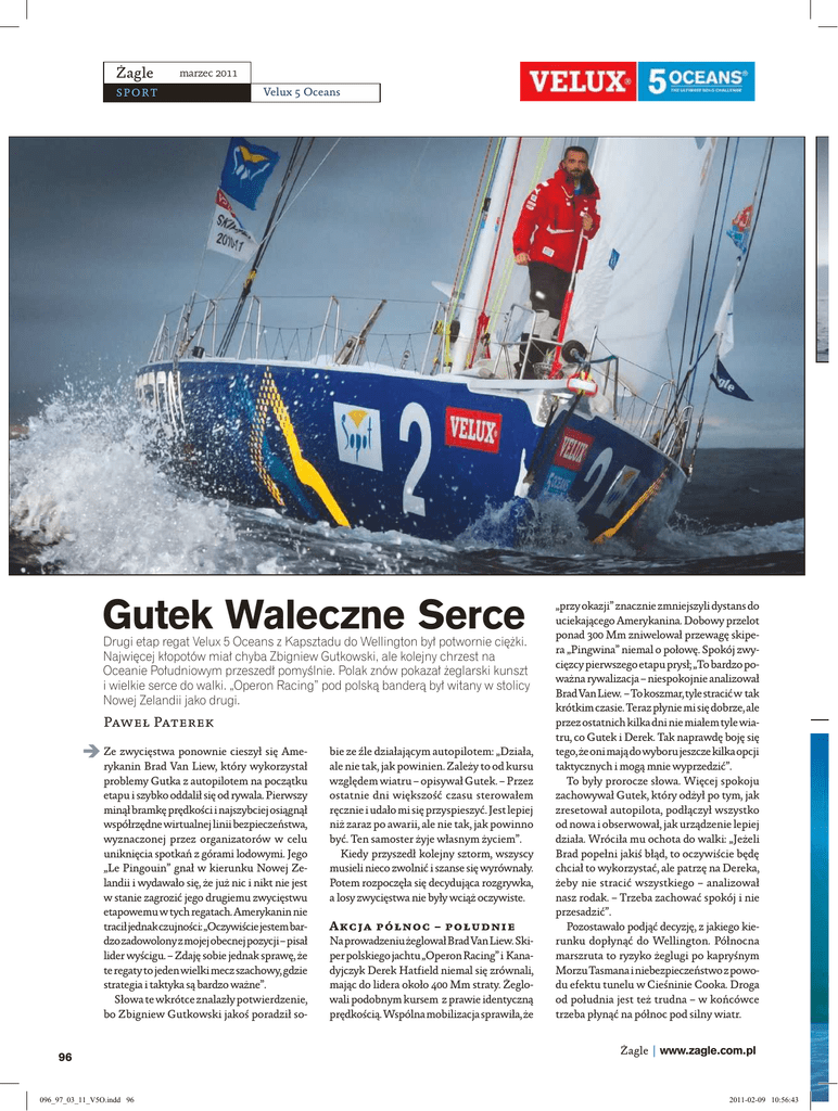 Żagle marzec 2011 sport Velux 5 Oceans Gutek Waleczne Serce Drugi etap regat Velux 5 Oceans z Kapsztadu do Wellington był potwornie ciężki. Najwięcej kłopotów miał chyba Zbigniew Gutkowski, ale kolejny chrzest na Oceanie Południowym przeszedł pomyślnie. Polak znów pokazał żeglarski kunszt i wielkie serce do walki. „Operon Racing” pod polską banderą był witany w stolicy Nowej Zelandii jako drugi. Paweł Paterek Ze zwycięstwa ponownie cieszył się Amerykanin Brad Van Liew, który wykorzystał problemy Gutka z autopilotem na początku etapu i szybko oddalił się od rywala. Pierwszy minął bramkę prędkości i najszybciej osiągnął współrzędne wirtualnej linii bezpieczeństwa, wyznaczonej przez organizatorów w celu uniknięcia spotkań z górami lodowymi. Jego „Le Pingouin” gnał w kierunku Nowej Zelandii i wydawało się, że już nic i nikt nie jest w stanie zagrozić jego drugiemu zwycięstwu etapowemu w tych regatach. Amerykanin nie tracił jednak czujności: „Oczywiście jestem bardzo zadowolony z mojej obecnej pozycji – pisał lider wyścigu. – Zdaję sobie jednak sprawę, że te regaty to jeden wielki mecz szachowy, gdzie strategia i taktyka są bardzo ważne”. Słowa te wkrótce znalazły potwierdzenie, bo Zbigniew Gutkowski jakoś poradził so96 096_97_03_11_V5O.indd 96 bie ze źle działającym autopilotem: „Działa, ale nie tak, jak powinien. Zależy to od kursu względem wiatru – opisywał Gutek. – Przez ostatnie dni większość czasu sterowałem ręcznie i udało mi się przyspieszyć. Jest lepiej niż zaraz po awarii, ale nie tak, jak powinno być. Ten samoster żyje własnym życiem”. Kiedy przyszedł kolejny sztorm, wszyscy musieli nieco zwolnić i szanse się wyrównały. Potem rozpoczęła się decydująca rozgrywka, a losy zwycięstwa nie były wciąż oczywiste. Akcja północ – południe Na prowadzeniu żeglował Brad Van Liew. Skiper polskiego jachtu „Operon Racing” i Kanadyjczyk Derek Hatfield niemal się zrównali, mając do lidera około 400 Mm straty. Żeglowali podobnym kursem z prawie identyczną prędkością. Wspólna mobilizacja sprawiła, że „przy okazji” znacznie zmniejszyli dystans do uciekającego Amerykanina. Dobowy przelot ponad 300 Mm zniwelował przewagę skipera „Pingwina” niemal o połowę. Spokój zwycięzcy pierwszego etapu prysł; „To bardzo poważna rywalizacja – niespokojnie analizował Brad Van Liew. – To koszmar, tyle stracić w tak krótkim czasie. Teraz płynie mi się dobrze, ale przez ostatnich kilka dni nie miałem tyle wiatru, co Gutek i Derek. Tak naprawdę boję się tego, że oni mają do wyboru jeszcze kilka opcji taktycznych i mogą mnie wyprzedzić”. To były prorocze słowa. Więcej spokoju zachowywał Gutek, który odżył po tym, jak zresetował autopilota, podłączył wszystko od nowa i obserwował, jak urządzenie lepiej działa. Wróciła mu ochota do walki: „Jeżeli Brad popełni jakiś błąd, to oczywiście będę chciał to wykorzystać, ale patrzę na Dereka, żeby nie stracić wszystkiego – analizował nasz rodak. – Trzeba zachować spokój i nie przesadzić”. Pozostawało podjąć decyzję, z jakiego kierunku dopłynąć do Wellington. Północna marszruta to ryzyko żeglugi po kapryśnym Morzu Tasmana i niebezpieczeństwo z powodu efektu tunelu w Cieśninie Cooka. Droga od południa jest też trudna – w końcówce trzeba płynąć na północ pod silny wiatr. Żagle | www.zagle.com.pl 2011-02-09 10:56:43