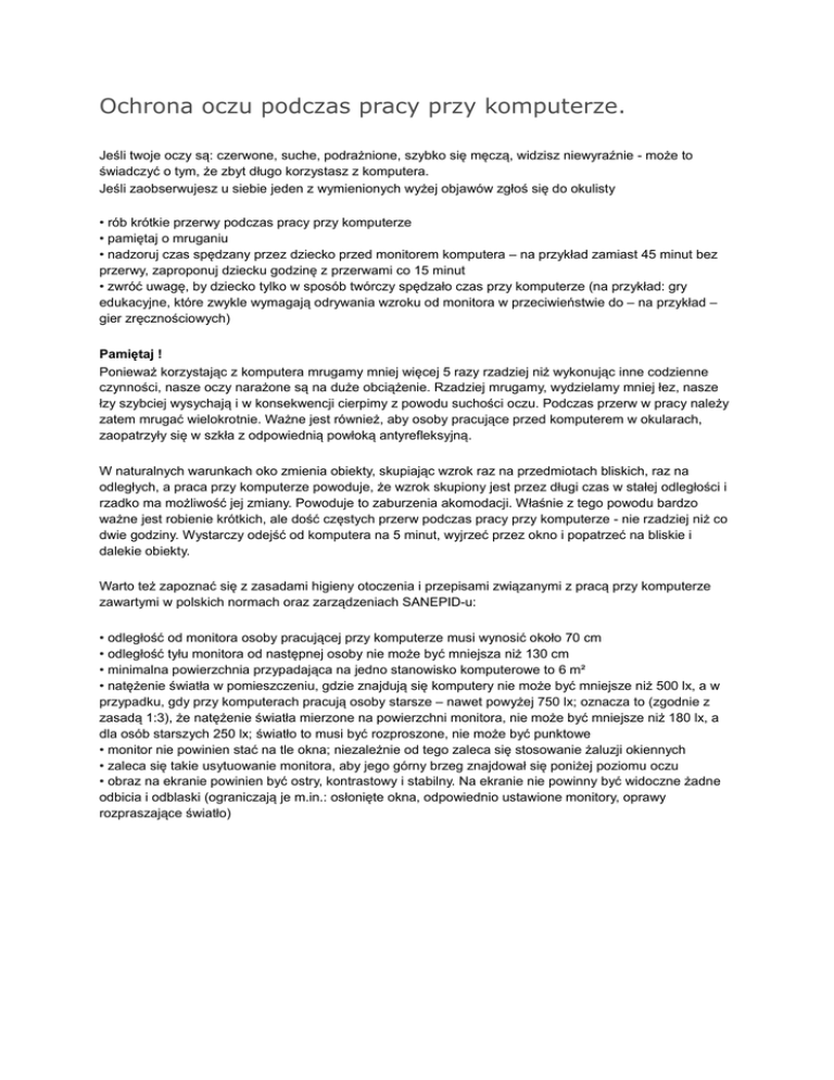 Ochrona oczu podczas pracy przy komputerze. Jeśli twoje oczy są: czerwone, suche, podrażnione, szybko się męczą, widzisz niewyraźnie - może to świadczyć o tym, że zbyt długo korzystasz z komputera. Jeśli zaobserwujesz u siebie jeden z wymienionych wyżej objawów zgłoś się do okulisty • rób krótkie przerwy podczas pracy przy komputerze • pamiętaj o mruganiu • nadzoruj czas spędzany przez dziecko przed monitorem komputera – na przykład zamiast 45 minut bez przerwy, zaproponuj dziecku godzinę z przerwami co 15 minut • zwróć uwagę, by dziecko tylko w sposób twórczy spędzało czas przy komputerze (na przykład: gry edukacyjne, które zwykle wymagają odrywania wzroku od monitora w przeciwieństwie do – na przykład – gier zręcznościowych) Pamiętaj ! Ponieważ korzystając z komputera mrugamy mniej więcej 5 razy rzadziej niż wykonując inne codzienne czynności, nasze oczy narażone są na duże obciążenie. Rzadziej mrugamy, wydzielamy mniej łez, nasze łzy szybciej wysychają i w konsekwencji cierpimy z powodu suchości oczu. Podczas przerw w pracy należy zatem mrugać wielokrotnie. Ważne jest również, aby osoby pracujące przed komputerem w okularach, zaopatrzyły się w szkła z odpowiednią powłoką antyrefleksyjną. W naturalnych warunkach oko zmienia obiekty, skupiając wzrok raz na przedmiotach bliskich, raz na odległych, a praca przy komputerze powoduje, że wzrok skupiony jest przez długi czas w stałej odległości i rzadko ma możliwość jej zmiany. Powoduje to zaburzenia akomodacji. Właśnie z tego powodu bardzo ważne jest robienie krótkich, ale dość częstych przerw podczas pracy przy komputerze - nie rzadziej niż co dwie godziny. Wystarczy odejść od komputera na 5 minut, wyjrzeć przez okno i popatrzeć na bliskie i dalekie obiekty. Warto też zapoznać się z zasadami higieny otoczenia i przepisami związanymi z pracą przy komputerze zawartymi w polskich normach oraz zarządzeniach SANEPID-u: • odległość od monitora osoby pracującej przy komputerze musi wynosić około 70 cm • odległość tyłu monitora od następnej osoby nie może być mniejsza niż 130 cm • minimalna powierzchnia przypadająca na jedno stanowisko komputerowe to 6 m² • natężenie światła w pomieszczeniu, gdzie znajdują się komputery nie może być mniejsze niż 500 lx, a w przypadku, gdy przy komputerach pracują osoby starsze – nawet powyżej 750 lx; oznacza to (zgodnie z zasadą 1:3), że natężenie światła mierzone na powierzchni monitora, nie może być mniejsze niż 180 lx, a dla osób starszych 250 lx; światło to musi być rozproszone, nie może być punktowe • monitor nie powinien stać na tle okna; niezależnie od tego zaleca się stosowanie żaluzji okiennych • zaleca się takie usytuowanie monitora, aby jego górny brzeg znajdował się poniżej poziomu oczu • obraz na ekranie powinien być ostry, kontrastowy i stabilny. Na ekranie nie powinny być widoczne żadne odbicia i odblaski (ograniczają je m.in.: osłonięte okna, odpowiednio ustawione monitory, oprawy rozpraszające światło)