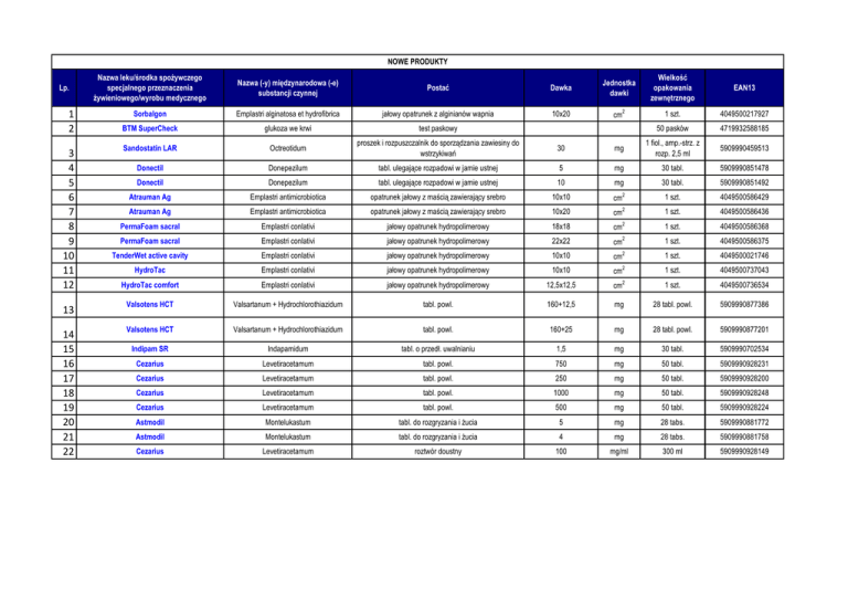 NOWE PRODUKTY Lp. 1 2 3 4 5 6 7 8 9 10 11 12 13 14 15 16 17 18 19 20 21 22 Nazwa leku/środka spożywczego specjalnego przeznaczenia żywieniowego/wyrobu medycznego Nazwa (-y) międzynarodowa (-e) substancji czynnej Postać Dawka Jednostka dawki Wielkość opakowania zewnętrznego EAN13 Sorbalgon Emplastri alginatosa et hydrofibrica jałowy opatrunek z alginianów wapnia 10x20 cm2 1 szt. 4049500217927 BTM SuperCheck glukoza we krwi test paskowy 50 pasków 4719932588185 Sandostatin LAR Octreotidum proszek i rozpuszczalnik do sporządzania zawiesiny do wstrzykiwań Donectil Donepezilum Donectil Donepezilum Atrauman Ag Emplastri antimicrobiotica 30 mg 1 fiol., amp.-strz. z rozp. 2,5 ml 5909990459513 tabl. ulegające rozpadowi w jamie ustnej 5 mg 30 tabl. 5909990851478 tabl. ulegające rozpadowi w jamie ustnej 10 mg 30 tabl. 5909990851492 cm 2 1 szt. 4049500586429 cm 2 1 szt. 4049500586436 cm 2 1 szt. 4049500586368 cm 2 1 szt. 4049500586375 2 opatrunek jałowy z maścią zawierający srebro 10x10 Atrauman Ag Emplastri antimicrobiotica opatrunek jałowy z maścią zawierający srebro 10x20 PermaFoam sacral Emplastri conlativi jałowy opatrunek hydropolimerowy 18x18 PermaFoam sacral Emplastri conlativi jałowy opatrunek hydropolimerowy 22x22 TenderWet active cavity Emplastri conlativi jałowy opatrunek hydropolimerowy 10x10 cm 1 szt. 4049500021746 HydroTac Emplastri conlativi jałowy opatrunek hydropolimerowy 10x10 cm2 1 szt. 4049500737043 2 1 szt. 4049500736534 HydroTac comfort Emplastri conlativi jałowy opatrunek hydropolimerowy 12,5x12,5 cm Valsotens HCT Valsartanum + Hydrochlorothiazidum tabl. powl. 160+12,5 mg 28 tabl. powl. 5909990877386 Valsotens HCT Valsartanum + Hydrochlorothiazidum tabl. powl. 160+25 mg 28 tabl. powl. 5909990877201 Indipam SR Indapamidum tabl. o przedł. uwalnianiu 1,5 mg 30 tabl. 5909990702534 Cezarius Levetiracetamum tabl. powl. 750 mg 50 tabl. 5909990928231 Cezarius Levetiracetamum tabl. powl. 250 mg 50 tabl. 5909990928200 Cezarius Levetiracetamum tabl. powl. 1000 mg 50 tabl. 5909990928248 Cezarius Levetiracetamum tabl. powl. 500 mg 50 tabl. 5909990928224 Astmodil Montelukastum tabl. do rozgryzania i żucia 5 mg 28 tabs. 5909990881772 Astmodil Montelukastum tabl. do rozgryzania i żucia 4 mg 28 tabs. 5909990881758 Cezarius Levetiracetamum roztwór doustny 100 mg/ml 300 ml 5909990928149 Pollinex Tree Alergeny pyłków roślin zawiesina do wstrzykiwań dawki do leczenia podstawowego: 600 SU/ml, 1600 SU/ml, 4000 SU/ml; SU/ml 3 fiolki po 1 ml ( fiolka nr 1- 600 SU/ml, fiolka nr 2 1600 SU/ml, fiolka nr 3- 4000 SU/ml )+ 5 strzykawek jednorazowego użytku + 5 igieł jednorazowego użytku 5909990687411 SU/ml 1 fiolka po 1,5 ml ( fiolka nr 3- 4000 SU/ml )+ 3 strzykawki jednorazowego użytku + 3 igły jednorazowego użytku 5909990684823 SU/ml 3 fiolki po 1 ml ( fiolka nr 1- 600 SU/ml, fiolka nr 2 1600 SU/ml, fiolka nr 3- 4000 SU/ml )+ 5 strzykawek jednorazowego użytku + 5 igieł jednorazowego użytku 5909990684816 5909990687428 5909990895977 23 Pollinex+Rye Alergeny pyłków roślin zawiesina do wstrzykiwań dawki do leczenia podtrzymującego: 4000 SU/ml 24 Pollinex+Rye Alergeny pyłków roślin zawiesina do wstrzykiwań dawki do leczenia podstawowego: 600 SU/ml, 1600 SU/ml, 4000 SU/ml; 25 26 27 Pollinex Tree Alergeny pyłków roślin zawiesina do wstrzykiwań dawki do leczenia podtrzymującego: 4000 SU/ml SU/ml 1 fiolka po 1,5 ml ( fiolka nr 3- 4000 SU/ml )+ 3 strzykawki jednorazowego użytku + 3 igły jednorazowego użytku Megastril Megestroli acetas zawiesina doustna 40 mg/ml 240 ml 28 29 30 31 32 33 34 35 36 37 38 39 40 41 42 43 44 45 46 47 48 49 50 51 Zinnat Cefuroximum tabl. powl. 250 mg 10 tabl. 5909997198606 Zinnat Cefuroximum tabl. powl. 500 mg 10 tabl. 5909997198378 Augmentin Amoxicillinum + Acidum clavulanicum tabl. powl. 500+125 mg 14 tabl. 5909997200576 Vermox Mebendazolum tabl. 100 mg 6 tabl. 5909997012339 Solu-Medrol Methylprednisolonum proszek i rozpuszczalnik do sporządzania roztworu do wstrzykiwań 1000 mg 1 fiolka z proszkiem, 1 fiolka z rozpuszczalnikiem 5909990236817 Aglan 15 Meloxicamum tabl. 15 mg 20 tabl. 5909990224883 Solu-Medrol Methylprednisolonum proszek i rozpuszczalnik do sporządzania roztworu do wstrzykiwań 500 mg 1 fiolka z proszkiem, 1 fiolka z rozpuszczalnikiem 5909990236718 Tezeo Telmisartanum tabl. 80 mg 28 tabl. 5909990818150 Tezeo Telmisartanum tabl. 40 mg 28 tabl. 5909990818082 Aglan 15 Meloxicamum tabl. 15 mg 30 tabl. 5909990610006 Aglan 15 Meloxicamum tabl. 15 mg 10 tabl. 5909990224876 Helicid Forte Omeprazolum kaps. dojel. twarde 40 mg 28 kaps. 5909990921324 5909990764280 Nivenol Clopidogrelum tabl. powl. 75 mg 28 tabl. (2 blist.po 14 szt.) Alermed Cetirizini dihydrochloridum tabl. powl. 10 mg 30 tabl. (3 blist.po 10 szt.) 5909990910793 GLUCOCARD Vital Test Strip glukoza we krwi test paskowy 50 pasków 5028939000101 Pantoprazole Arrow Pantoprazolum tabl. dojel. 40 mg 28 tabl. 5909990867066 Meloxicam Arrow 15 mg Meloxicamum tabl. 15 mg 10 tabl. 5909990637034 Meloxicam Arrow 15 mg Meloxicamum tabl. 15 mg 20 tabl. 5909990042401 Meloxicam Arrow 15 mg Meloxicamum tabl. 15 mg 30 tabl. 5909990042425 Indapamide SR Arrow Indapamidum tabl. o przedłużonym uwalnianiu 1,5 mg 30 tabl. 5909990223077 Simvastatin 40 mg tabletki powlekane Simvastatinum tabl. powl. 40 mg 28 tabl. 5909990037575 Pantoprazole Arrow Pantoprazolum tabl. dojel. 20 mg 28 tabl. 5909990866793 Ramipril Pfizer Ramiprilum tabl. 5 mg 28 tabl. 5909990796601 Ramipril Pfizer Ramiprilum tabl. 10 mg 28 tabl. 5909990796649 52 53 54 55 56 57 58 59 60 61 62 63 64 65 66 67 68 69 70 71 72 73 74 75 76 77 78 79 80 81 82 83 Losartan Pfizer Losartanum tabl. powl. 50 mg 30 tabl. 5909990809790 5909990729685 Losacor HCT Losartanum + Hydrochlorothiazidum tabl. powl. 50+12,5 mg 28 tabl. (4 blist.po 7 szt.) Sortabax HCT Losartanum + Hydrochlorothiazidum tabl. powl. 0,05+0,0125 g 28 tabl. 5909990806195 Sortabax HCT Losartanum + Hydrochlorothiazidum tabl. powl. 100+25 mg 28 tabl. 5909990806201 D