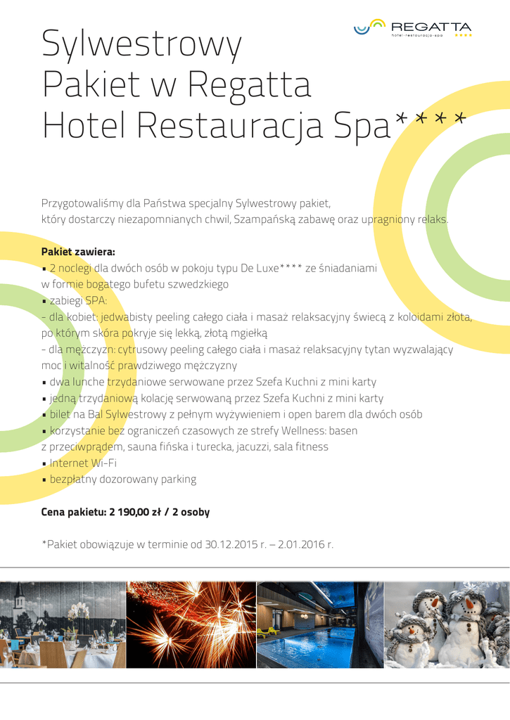 Sylwestrowy Pakiet w Regatta Hotel Restauracja Spa**** Przygotowaliśmy dla Państwa specjalny Sylwestrowy pakiet, który dostarczy niezapomnianych chwil, Szampańską zabawę oraz upragniony relaks. Pakiet zawiera: • 2 noclegi dla dwóch osób w pokoju typu De Luxe**** ze śniadaniami w formie bogatego bufetu szwedzkiego • zabiegi SPA: - dla kobiet: jedwabisty peeling całego ciała i masaż relaksacyjny świecą z koloidami złota, po którym skóra pokryje się lekką, złotą mgiełką - dla mężczyzn: cytrusowy peeling całego ciała i masaż relaksacyjny tytan wyzwalający moc i witalność prawdziwego mężczyzny • dwa lunche trzydaniowe serwowane przez Szefa Kuchni z mini karty • jedną trzydaniową kolację serwowaną przez Szefa Kuchni z mini karty • bilet na Bal Sylwestrowy z pełnym wyżywieniem i open barem dla dwóch osób • korzystanie bez ograniczeń czasowych ze strefy Wellness: basen z przeciwprądem, sauna fińska i turecka, jacuzzi, sala fitness • Internet Wi-Fi • bezpłatny dozorowany parking Cena pakietu: 2 190,00 zł / 2 osoby *Pakiet obowiązuje w terminie od 30.12.2015 r. – 2.01.2016 r.