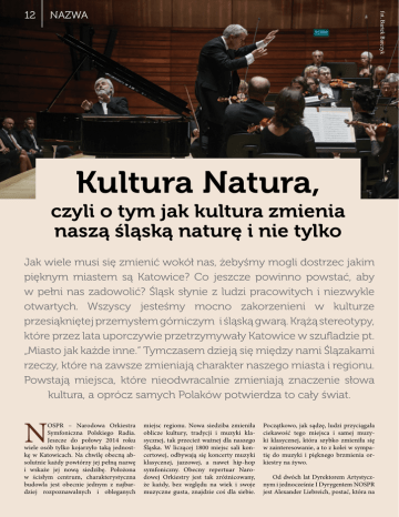 NAZWA fot. Bartek Barczyk 12 Kultura Natura, czyli o tym jak kultura zmienia naszą śląską naturę i nie tylko Jak wiele musi się zmienić wokół nas, żebyśmy mogli dostrzec jakim pięknym miastem są Katowice? Co jeszcze powinno powstać, aby w pełni nas zadowolić? Śląsk słynie z ludzi pracowitych i niezwykle otwartych. Wszyscy jesteśmy mocno zakorzenieni w kulturze przesiąkniętej przemysłem górniczym i śląską gwarą. Krążą stereotypy, które przez lata uporczywie przetrzymywały Katowice w szufladzie pt. „Miasto jak każde inne.” Tymczasem dzieją się między nami Ślązakami rzeczy, które na zawsze zmieniają charakter naszego miasta i regionu. Powstają miejsca, które nieodwracalnie zmieniają znaczenie słowa kultura, a oprócz samych Polaków potwierdza to cały świat. N OSPR – Narodowa Orkiestra Symfoniczna Polskiego Radia. Jeszcze do połowy 2014 roku wiele osób tylko kojarzyło taką jednostkę w Katowicach. Na chwilę obecną absolutnie każdy powtórzy jej pełną nazwę i wskaże jej nową siedzibę. Położona w ścisłym centrum, charakterystyczna budowla jest obecnie jednym z najbardziej rozpoznawalnych i obleganych miejsc regionu. Nowa siedziba zmieniła oblicze kultury, tradycji i muzyki klasycznej, tak przecież ważnej dla naszego Śląska. W liczącej 1800 miejsc sali koncertowej, odbywają się koncerty muzyki klasycznej, jazzowej, a nawet hip-hop symfoniczny. Obecny repertuar Narodowej Orkiestry jest tak zróżnicowany, że każdy, bez względu na wiek i swoje muzyczne gusta, znajdzie coś dla siebie. Początkowo, jak sądzę, ludzi przyciągała ciekawość tego miejsca i samej muzyki klasycznej, która szybko zmieniła się w zainteresowanie, a to z kolei w sympatię do muzyki i pięknego brzmienia orkiestry na żywo. Od dwóch lat Dyrektorem Artystycznym i jednocześnie I Dyrygentem NOSPR jest Alexander Liebreich, postać, która na NAZWA 13 NOSPR bardzo cenię sobie naszą współpracę z Akademią Muzyczną. To również wspaniałe miejsce, które kształci młode pokolenie bardzo świadomych i wrażliwych muzyków. Dlatego również i tam będzie odbywał się festiwal Kultura Natura. Za granicą coraz więcej słychać o NOSPR i Katowicach, o miejscach tych mówi się z szacunkiem. Dla kogo dedykowany jest festiwal? fot. Bartek Barczyk światowej arenie muzyki klasycznej jest uosobieniem perfekcji, innowacyjności i absolutnego braku ograniczeń w interpretacji i wykonaniu utworów. Alexander Liebreich zapytany o potencjał, który daje orkiestrze nowa siedziba, nie kryje swojego zafascynowania rozwojem i historią orkiestry. Polska od zawsze miała głęboko zakorzenioną tradycję muzyczną. Nawet podczas zimnej wojny Polacy reprezentowali wyjątkowy poziom twórczości, na co dowodem jest chociażby Festiwal „Warszawska Jesień”. Wydarzenie to było czymś w rodzaju „okna wystawowego” dla polskich muzyków, którzy prezentowali na nim dzieła znanych kompozytorów z XX wieku oraz awangardy lat sześćdziesiątych. Był to zdecydowanie burzliwy okres w historii, jednak po 1989 roku wiele w Polsce się zmieniło. Sytuacja społeczno-polityczna kraju ustabilizowała się i przyszedł czas na obranie konkretnego kierunku rozwoju muzyki klasycznej. Powstało kilka sal koncertowych m.in. w Szczecinie, Wrocławiu, Krakowie i Katowicach. Obecna katowicka sala jest jedną z trzech wymienianych przez New York Times najlepszych sal koncertowych na świecie tuż obok Lucerny i nowej sali Filharmonii w Paryżu. Dlaczego więc nie stolica, tylko właśnie Katowice zostały Pana miejscem pracy? Ponieważ Katowice to miasto o wielu twarzach. Rozwój infrastruktury i ośrodków kulturalnych nabrał niesamowitego tem- pa. To miasto, w którym ludzie są otwarci na zmiany, a przy tym mocno stąpają po ziemi. Region ten głęboko osadzony jest w realiach przemysłu górniczego. Ludzi łączą tu wyjątkowe więzi, a siła i energia, która od nich bije jest zdecydowanie silniejsza niż w stolicach lub mega-miastach. W powstanie nowej siedziby zostało zaangażowane całe miasto z Prezydentem Piotrem Uszokiem na czele, a także architekt, pracownicy i oczywiście orkiestra. Miasto żyło tym przedsięwzięciem. Czy to właśnie dlatego, że udało się Panu poczuć wyjątkowy klimat Śląska podjął Pan decyzję o zorganizowaniu pierwszego w Polsce i na świecie festiwalu muzycznego Kultura Natura? Zgadza się! Dokładnie obserwuję to, co się tutaj dzieje. Miasto z każdą moją wizytą w Polsce pozytywnie mnie zaskakuje jakąś nowością, ponadto oprócz siedziby Festiwal jest dla wszystkich miłośników muzyki. Przez jedenaście dni festiwalu zostaną zaprezentowane różne utwory muzyki symfonicznej, jazz oraz muzyka kameralna. Jako dyrektor artystyczny festiwalu mogłem zaprosić największe sławy świata muzyki, które swoją grą uświetnią festiwal m.in. pianiści ANDRÁS SCHIFF, legenda jazzu STEFANO BOLLANI, muzycy z LONDON SINFONIETTA, Monachijska Orkiestra Kameralna Rias Kammerchor i wiele innych. Będzie to niesamowite wydarzenie o tyle też, że oprócz wspaniałej sali koncertowej planujemy również koncert na powietrzu, tuż przy siedzibie NOSPR w uroczej scenerii parku i dawnej kopalni. Ta krótka rozmowa z Dyrektorem NOSPR pozwoliła mi spojrzeć na otaczające mnie miasto z zupełnie innej perspektywy. Zmiany tworzą nowe ramy kultury, co daje nam - mieszkańcom wiele więcej możliwości niż dotychczas. Świat nie pozostawia bez echa naszych działań i odwdzięcza się zainteresowaniem. Możemy być dumni z tego, co mamy na naszym śląskim podwórku, bo mówi o nas cały świat. Rozmawiała: Joanna Dybała fot. Bartek Barczyk
