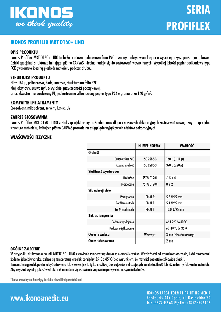 SERIA PROFIFLEX IKONOS PROFIFLEX MRT D160+ LINO OPIS PRODUKTU Ikonos Profiflex MRT D160+ LINO to biała, matowa, polimerowa folia PVC z wodnym akrylowym klejem o wysokiej przyczepności początkowej. Dzięki specjalnej strukturze imitującej płótno CANVAS, idealne nadaje się do zastosowań wewnętrznych. Wysokiej jakości papier podkładowy typu PCK gwarantuje idealną płaskość materiału podczas druku.. STRUKTURA PRODUKTU Film: 160 μ, polimerowa, biała, matowa, strukturalna folia PVC, Klej: akrylowy, usuwalny*, o wysokiej przyczepności początkowej, Liner: dwustronnie powlekany PE, jednostronnie silikonowany papier typu PCK o gramaturze 140 g/m2. Kompatybilne atramenty Eco-solvent, mild solvent, solvent, Latex, UV ZAKRES STOSOWANIA Ikonos Profiflex MRT D160+ LINO został zaprojektowany do średnio oraz długo okresowych dekoracyjnych zastosowań wewnętrznych. Specjalna struktura materiału, imitująca płótno CANVAS pozwala na osiągnięcie wyjątkowych efektów dekoracyjnych. WŁAŚCIWOŚCI FIZYCZNE NUMER NORMY WARTOŚĆ Grubość Grubość folii PVC ISO 2286-3 160 μ (± 10 μ) Łączna grubość ISO 2286-3 370 μ (±20 μ) Wzdłużne ASTM D1204 -1% ± 4 Poprzeczne ASTM D1204 0±2 Początkowa FINAT 9 5,7 N/25 mm Po 20 minutach FINAT 1 5,3 N/25 mm Po 24 godzinach FINAT 1 10,0 N/25 mm Stabilność wymiarowa Si³a adhezji kleju Zakres temperatur Podczas wyklejania od 15 OC do 40 OC Podczas użytkowania od -10 OC do 35 OC Okres trwałości Okres składowania Wewnątrz 3 lata (niezadrukowany) 2 lata Ogólne zalecenie W przypadku drukowania na folii MRT D160+ LINO ustawienia temperatury druku są niezwykle ważne. W zależności od warunków otoczenia, ilości atramentu i żądanej jakości wydruku, zaleca się temperaturę grzałek pomiędzy 35 °C a 45 °C (pod warunkiem, że materiał pozostaje całkowicie płaski). Temperatura grzałek powinna być ustawiona tak wysoko, jak to tylko możliwe, bez objawów wykazujących na niestabilność lub różne formy falowania materiału. Aby uzyskać wysoką jakość wydruku rekomenduje się ustawienia zapewniające wysokie nasycenie kolorów. * Łatwo usuwalny do 3 miesięcy bez lub z niewielkimi pozostałościami www.ikonosmedia.eu IKONOS LARGE FORMAT PRINTING MEDIA Polska, 45-446 Opole, ul. Gosławicka 2D Tel.: +48 77 455 63 19 / Fax: +48 77 455 63 17 Okres trwałości Dane dotyczą ekspozycji pionowej niezadrukowanego/ nieprzetworzonego produktu. Trwałość zewnętrzna odnosi się do klimatu umiarkowanego Europy Środkowej. Jeśli produkt jest narażony na działanie ekstremalnych warunków pogodowych, takich jak silne nasłonecznienie, wysoka wilgotność lub intensywne promieniowanie UV może ulegać przyspieszonej degradacji. Folia PVC może również ulegać osłabieniu w obszarach o znacznym stopniu zanieczyszczenia i regionach położonych na znacznych wysokościach. Przechowywanie i przetwarzanie Zalecane warunki przechowywania: 50% wilgotności względnej, 20 OC, w oryginalnym opakowaniu. Klient powinien zawsze przechowywać rolki wraz z etykietą, zawierającą informacje o rodzaju produktu, wymiarach rolki i numerze partii. Wszelkie skargi i wnioski reklamacyjne są przyjmowane wyłącznie wraz z informacją o numerze partii. Podczas okresu przechowywania krawędzie monomerowej folii PVC mogą ulegać procesowi kurczenia. W celu uzyskania wysokiej jakości wydruków/dobrych wyników przetwarzania zalecamy zaaklimatyzować rolki w pomieszczeniu, w którym zostaną one zadrukowane/przetworzone na min. 24 godziny przed zadrukowaniem/przetwarzaniem. Duże wahania temperatury i wilgotności pomiędzy pomieszczeniem oraz materiałem mają wpływ na zjawisko falowania materiału i jakość druku. Jeśli materiał został zadrukowany, atrament musi być całkowicie suchy przed dalszą obróbką materiału np. laminowaniem lub aplika- cją. Pozostałości rozpuszczalników mogą wywołać zmianę charakterystyki produktu. Powierzchnia na którą aplikowany jest produkt musi być wolna od kurzu, tłuszczu, smaru i innych substancji, które mogą negatywnie wpływać na siłę adhezji materiału do tej powierzchni. Ze względu na szeroki wachlarz możliwych zastosowań, klient powinien każdorazowo przed użyciem sprawdzić czy wybrany przez niego materiał odpowiada w pełni jego potrzebom. Zalecamy klientom przeprowadzenie własnych testów przed każdą aplikacją. Ważna uwaga Informacje zawarte w niniejszej publikacji są oparte na naszej wiedzy oraz doświadczeniu praktycznym i mogą ulec zmianie bez uprzedniego powiadomienia. Wszystkie informacje zawsze reprezentują średnią, minimalną lub maksymalną wartość i powinny być traktowane jako takie. Ze względu na szeroki wachlarz możliwych zastosowań (różnorodność podłoży), klient powinien każdorazowo przed użyciem sprawdzić czy wybrany przez niego materiał odpowiada w pełni jego potrzebom (w tym przyczepność do wybranego podłoża). Zalecamy klientom przeprowadzenie własnych testów przed każdą aplikacją. Prezentowanie dane służą wyłącznie jako źródło informacji i nie stanowią podstawy jakiejkolwiek gwarancji. Wszystkie prezentowane informacje odnoszą się do niezadrukowanych / nieprzetworzonych produktów Ikonos. Charakterystyka produktu może ulec zmianie po zadruku / przetworzeniu. Z tego powodu wszystkie zadrukowane / przetworzone produkty Ikonos nie są objęte gwarancją. Ograniczona odpowiedzialność producenta odnosi się tylko do kosztów wadliwego materiału, który został zakupiony przez klienta. Agenci, przedstawiciele oraz sprzedawcy nie są uprawnieni do udzielania jakichkolwiek gwarancji, poświadczeń, poręczeń i oświadczeń innych niż zamieszczone w tej karcie technicznej. Ikonos nie ponosi odpowiedzialności za ewentualne uszkodzenia podłoży, powierzchni lub maszyn wynikające ze stosowania lub usuwania produktów Ikonos, jak również nie ponosi odpowiedzialności za jakiekolwiek inne szkody powstałe podczas proces