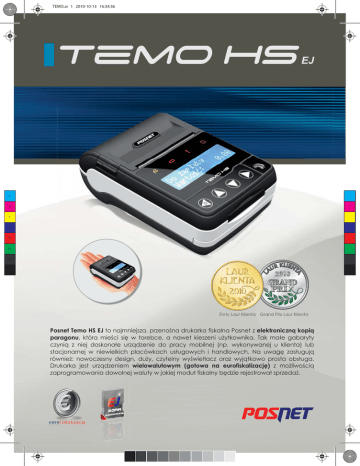 TEMO.ai 1 2010-10-13 16:34:36 C M Y CM MY CY CMY K Posnet Temo HS EJ to najmniejsza, przenośna drukarka fiskalna Posnet z elektroniczną kopią paragonu, która mieści się w torebce, a nawet kieszeni użytkownika. Tak małe gabaryty czynią z niej doskonałe urządzenie do pracy mobilnej (np. wykonywanej u klienta) lub stacjonarnej w niewielkich placówkach usługowych i handlowych. Na uwagę zasługują również: nowoczesny design, duży, czytelny wyświetlacz oraz wyjątkowo prosta obsługa. Drukarka jest urządzeniem wielowalutowym (gotowa na eurofiskalizację) z możliwością zaprogramowania dowolnej waluty w jakiej moduł fiskalny będzie rejestrował sprzedaż. TEMO back.ai 1 2010-10-13 16:31:25 liczba PLU nazwa towaru stawki VAT 100 000 40 znaków 7 (A...G) wyświetlacz operatora wyświetlacz klienta wspólny z wyświetlaczem klienta alfanumeryczny LCD 2 x 16 znaków typ ilość znaków w wierszu szerokość papieru szybkość wydruku długość rolki termiczny, “easy load” 40 57 mm 22 linii/s 14 m typ karta microSD/microSDHC C M komunikacja z PC 1 x USB 1 x Bluetooth (opcja) zasilacz zewnętrzny wbudowany akumulator 230V AC/10-15V DC/1A zapewniający wydruk min. 6000 linii wymiary waga 86 x 46 x 128 mm (szer. x wys. x dł.) ~380 g (z papierem) Y CM MY CY CMY K • kopia elektroniczna paragonu z możliwością zdalnej archiwizacji (EJ) ”) • zmiana waluty ewidencyjnej („eurofiskalizacja”) • drukowanie faktur VAT (FV) aragonie • dodatkowa linia opisu dla każdej pozycji na paragonie umer systemowy) • wydruk kodów kreskowych na paragonach (numer ojalnościowych • formatki wydruków m.in. do obsługi systemów lojalnościowych i rabatowych • system raportów i wydruków umożliwiający obsługę transakcji elektronicznych • przypominanie o obowiązkowym przeglądzie okresowym