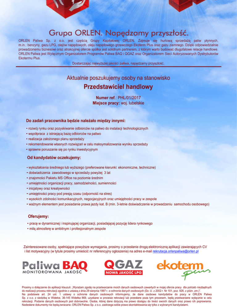 ORLEN Paliwa Sp. z o.o. jest częścią Grupy Kapitałowej ORLEN. Zajmuje się hurtową sprzedażą paliw płynnych, m.in.: benzyny, gazu LPG, olejów napędowych, oleju napędowego grzewczego Ekoterm Plus oraz gazu ziemnego. Dzięki odpowiedzialnie prowadzonemu biznesowi oraz atrakcyjnej ofercie spółka jest solidnym partnerem, z którym warto budować długofalowe relacje handlowe. ORLEN Paliwa jest Wyłącznym Organizatorem Programów Paliwa BAQ i QGAZ oraz Organizatorem Sieci Autoryzowanych Dystrybutorów Ekotermu Plus. Dostarczając najwyższej jakości paliwa, napędzamy przyszłość. Aktualnie poszukujemy osoby na stanowisko Przedstawiciel handlowy Numer ref.: PHL/01/2017 Miejsce pracy: woj. lubelskie Do zadań pracownika będzie należało między innymi: • rozwój rynku oraz pozyskiwanie odbiorców na paliwo do instalacji technologicznych • współpraca z istniejącą bazą odbiorców na paliwo • realizacja założonego planu sprzedaży • rekomendowanie własnych rozwiązań w celu maksymalizowania wyniku sprzedaży • sprawne poruszanie się po rynku inwestycyjnym Od kandydatów oczekujemy: • wykształcenia średniego lub wyższego (preferowane kierunki: ekonomiczne, techniczne) • doświadczenia zawodowego w sprzedaży powyżej 3 lat • znajomości Pakietu MS Office na poziomie średnim • umiejętności organizacji pracy, samodzielności, sumienności • inicjatywy oraz kreatywności • umiejętności pracy pod presją czasu (odporność na stres) • wysokich zdolności komunikacyjnych, negocjacyjnych oraz umiejętności pracy w zespole • ważnym elementem jest posiadanie prawa jazdy kat. B (min. 3-letnie doświadczenie w prowadzeniu samochodu osobowego) Oferujemy: • pracę w dynamicznej i inspirującej organizacji, posiadającej pozycję lidera rynkowego • miłą atmosferę w ambitnym i profesjonalnym zespole Zainteresowane osoby, spełniające powyższe wymagania, prosimy o przesłanie drogą elektroniczną aplikacji zawierających CV i list motywacyjny (w tytule prosimy umieścić nr referencyjny ogłoszenia) na adres e-mail [email protected] Prosimy o dołączenie do aplikacji klauzuli: „Wyrażam zgodę na przetwarzanie moich danych osobowych zawartych w mojej ofercie pracy dla potrzeb niezbędnych do realizacji procesu rekrutacji zgodnie z ustawą z dnia 29 sierpnia 1997 r. o ochronie danych osobowych (Dz. U. z 2002 r. Nr 101, poz. 926, z późn. zm.)”. Na podstawie art. 24 ust. 1 ustawy o ochronie danych osobowych informujemy, że dane osobowe kandydatów do pracy w ORLEN Paliwa Sp. z o.o. z siedzibą w Widełce, 36-145 Widełka 869, uzyskane w procesie rekrutacji lub przesłane poza tym procesem, będą przetwarzane wyłącznie w celu rekrutacji. Podanie danych osobowych jest dobrowolne. Osoba, której dane dotyczą ma prawo dostępu do treści swoich danych oraz prawo ich poprawiania. Nadesłane dokumenty nie będą zwracane. ORLEN Paliwa Sp. z o.o. zastrzega sobie prawo skontaktowania się tylko z wybranymi kandydatami.