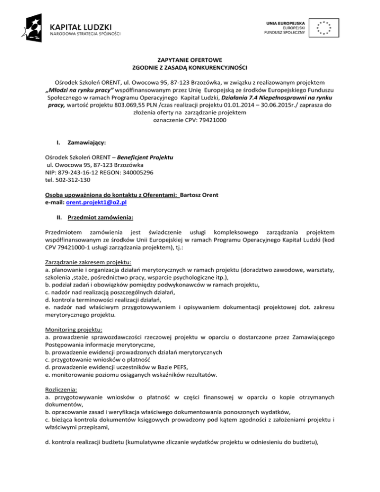 ZAPYTANIE OFERTOWE ZGODNIE Z ZASADĄ KONKURENCYJNOŚCI Ośrodek Szkoleń ORENT, ul. Owocowa 95, 87-123 Brzozówka, w związku z realizowanym projektem „Młodzi na rynku pracy” współfinansowanym przez Unię Europejską ze środków Europejskiego Funduszu Społecznego w ramach Programu Operacyjnego Kapitał Ludzki, Działania 7.4 Niepełnosprawni na rynku pracy, wartość projektu 803.069,55 PLN /czas realizacji projektu 01.01.2014 – 30.06.2015r./ zaprasza do złożenia oferty na zarządzanie projektem oznaczenie CPV: 79421000 I. Zamawiający: Ośrodek Szkoleń ORENT – Beneficjent Projektu ul. Owocowa 95, 87-123 Brzozówka NIP: 879-243-16-12 REGON: 340005296 tel. 502-312-130 Osoba upoważniona do kontaktu z Oferentami: Bartosz Orent e-mail: [email protected] II. Przedmiot zamówienia: Przedmiotem zamówienia jest świadczenie usługi kompleksowego zarządzania projektem współfinansowanym ze środków Unii Europejskiej w ramach Programu Operacyjnego Kapitał Ludzki (kod CPV 79421000-1 usługi zarządzania projektem), tj.: Zarządzanie zakresem projektu: a. planowanie i organizacja działań merytorycznych w ramach projektu (doradztwo zawodowe, warsztaty, szkolenia ,staże, pośrednictwo pracy, wsparcie psychologiczne itp.), b. podział zadań i obowiązków pomiędzy podwykonawców w ramach projektu, c. nadzór nad realizacją poszczególnych działań, d. kontrola terminowości realizacji działań, e. nadzór nad właściwym przygotowywaniem i opisywaniem dokumentacji projektowej dot. zakresu merytorycznego projektu. Monitoring projektu: a. prowadzenie sprawozdawczości rzeczowej projektu w oparciu o dostarczone przez Zamawiającego Postępowania informacje merytoryczne, b. prowadzenie ewidencji prowadzonych działań merytorycznych c. przygotowanie wniosków o płatność d. prowadzenie ewidencji uczestników w Bazie PEFS, e. monitorowanie poziomu osiąganych wskaźników rezultatów. Rozliczenia: a. przygotowywanie wniosków o płatność w części finansowej w oparciu o kopie otrzymanych dokumentów, b. opracowanie zasad i weryfikacja właściwego dokumentowania ponoszonych wydatków, c. bieżąca kontrola dokumentów księgowych prowadzony pod kątem zgodności z założeniami projektu i właściwymi przepisami, d. kontrola realizacji budżetu (kumulatywne zliczanie wydatków projektu w odniesieniu do budżetu), e. wnioskowanie o zmiany budżetowe – przygotowywanie dokumentacji, f. kontrola poziomu wniesionego i rozliczonego wkładu prywatnego w gotówce i wynagrodzeniach, g. opracowywanie przepływów finansowych w projekcie wraz z harmonogramami przekazywania poszczególnych transz dotacji. Inne: a. przygotowanie i prowadzenie dokumentacji związanej z ochroną danych osobowych, b. dokumentowanie zmian w projekcie, c. udział w kontrolach ROPS i innych instytucji kontrolnych, d. prowadzenie korespondencji z ROPS w imieniu Zamawiającego, e. realizacja działań promocyjnych, f. udział w Grupie Sterującej (przedstawiciele Zamawiającego i Wykonawcy), która min. raz na kwartał będzie spotykać się w celu omawiania postępów realizacji projektu i wspólnego podejmowania decyzji dotyczących realizacji projektu, Ważne !!!!! Zakres wykluczenia podmiotów z udziału w niniejszym zamówieniu (zgodnie z zasadą konkurencyjności określoną w zasadach finansowania Programem Operacyjnym Kapitał Ludzki, wersja z dnia 24.12.2012r., Rozdział 2 Kwalifikowalność wydatków w ramach PO KL, pkt. 2.2.7.2 Zasada konkurencyjności). Z niniejszego zamówienia wykluczone zostają podmioty powiązane z Zamawiającym osobowo lub kapitałowo. Przez powiązania kapitałowe lub osobowe rozumie się wzajemne powiązania między Zamawiającym lub osobami upoważnionymi do zaciągania zobowiązań w imieniu Zamawiającego lub osobami wykonującymi w imieniu Zamawiającego czynności związanych z przygotowaniem i przeprowadzeniem procedury wyboru wykonawcy a wykonawcą, polegające w szczególności na: a) uczestniczeniu w spółce jako wspólnik spółki cywilnej lub spółki osobowej; b) posiadaniu co najmniej 10% udziałów lub akcji; c) pełnieniu funkcji członka organu nadzorczego lub zarządzającego, prokurenta, pełnomocnika; d) pozostawaniu w związku małżeńskim, w stosunku pokrewieństwa lub powinowactwa w linii prostej, pokrewieństwa lub powinowactwa w linii bocznej do drugiego stopnia lub w stosunku przysposobienia, opieki lub kurateli. III. Kryteria Dostępu 1. Wykonawca musi posiadać niezbędną wiedzę i doświadczenie oraz dysponować potencjałem technicznym i osobami zdolnymi do prawidłowego wykonywania zamówienia. 2. Wykonawca znajduje się w sytuacji ekonomicznej i finansowej zapewniającej wykonanie usługi. IV. Miejsce realizacji zamówienia: Siedzibą Biura Projektu jest miasto Toruń: Rynek Nowomiejski 25 w terminie: 01.01.2014 – 30.06.2015r. Zaznacza się, że nie będą zwracane koszty dojazdu do siedziby Zamawiającego. V. Podstawowe Kryteria Oceny Ofert: 1. Cena oferty - 100 pkt. VI. Wymagane oświadczenia i dokumenty Oferent jest zobowiązany do złożenia: - oferty cenowej w ujęciu kosztu w podziale na miesiąc oraz ogółem na cały okres realizacji projektu, -kserokopii aktualnego (tj. wystawionego nie wcześniej niż 3 miesiące przed upływem terminu składania ofert) odpisu z właściwego rejestru / zaświadczenia o wpisie do ewidencji działalności gospodarczej, - oświadczenia, że oferent zapewni odpowiednio doświadczoną, wykształconą i wykwalifikowaną kadrę zarządzającą projektem. W skład zespołu (min. 3 osobowego) muszą wchodzić osoby, które posiadają: wiedzę i praktyczne doświadczenia w zakresie metodologii zarządzania projektami , praktyczną znajomość aplikacji niezbędnych do realizacji i rozliczania projektu w ramach PO KL, komunikatywność i umiejętności pracy w zespole, umiejętność redagowania pism, doświadczenie organizacyjne w kierowaniu zespołami, współpracy z podmiotami zewnętrznymi, - wykazu 