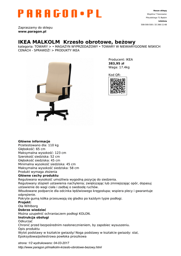 Nasze sklepy Wspólna 7 Sosnowiec Piłsudskiego 71 Będzin Infolinia 508-500-500 / 32 266-11-66 Zapraszamy do sklepu www.paragon.pl IKEA MALKOLM Krzesło obrotowe, beżowy kategoria: TOWARY > • MAGAZYN WYPRZEDAŻOWY • TOWARY W NIEWIARYGODNIE NISKICH CENACH - SPRAWDŹ! > PRODUKTY IKEA Producent: IKEA 383,95 zł Waga: 17.4kg Kod QR: Główne informacje Przetestowano dla: 110 kg Głębokość: 65 cm Maksymalna wysokość: 123 cm Szerokość siedziska: 52 cm Głębokość siedziska: 45 cm Minimalna wysokość siedziska: 45 cm Maksymalna wysokość siedziska: 58 cm Produkt wymaga złożenia Główne cechy produktu Regulowana wysokość umożliwia wygodną pozycję do siedzenia. Regulowany stopień ustawienia nachylenia; zwiększając lub zmniejszając opór, dopasuj ustawienie do wagi ciała i zadbaj o swobodę ruchów. Wbudowane podparcie dla odcinka lędźwiowego kręgosłupa; wspiera plecy i gwarantuje odprężenie. Pokryte gumą kółka przesuwają się gładko po każdym typie podłogi. Projekt: Ola Wihlborg Dobrze wiedzieć Można uzupełnić ochraniaczem podłogi KOLON. Instrukcja obsługi Odkurzać Chronić przed bezpośrednim nasłonecznieniem, by zapobiec wysuszeniu. Opis produktu Wylot podstawy w kształcie gwiazdy/ Noga podstawy w kształcie gwiazdy: stal, Epoksydowa/poliestrowa powłoka proszkowa strona: 1/2 wydrukowano: 04-03-2017 http://www.paragon.pl/malkolm-krzeslo-obrotowe-bezowy.html Części ze sztucznej skóry: 25% bawełna, 75% poliester, 100% poliuretan Wypełnienie siedziska/ Wypełnienie oparcia: Pianka poliuretanowa 35kg/m3 Skład łączny: 100% bawełna strona: 2/2 wydrukowano: 04-03-2017 http://www.paragon.pl/malkolm-krzeslo-obrotowe-bezowy.html