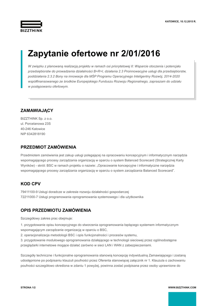 KATOWICE, 10.12.2015 R. Zapytanie ofertowe nr 2/01/2016 W związku z planowaną realizacją projektu w ramach osi priorytetowej II: Wsparcie otoczenia i potencjału przedsiębiorstw do prowadzenia działalności B+R+I, działania 2.3 Proinnowacyjne usługi dla przedsiębiorstw, poddziałania 2.3.2 Bony na innowacje dla MŚP Programu Operacyjnego Inteligentny Rozwój, 2014-2020 współfinansowanego ze środków Europejskiego Funduszu Rozwoju Regionalnego, zapraszam do udziału w postępowaniu ofertowym. ZAMAWIAJĄCY BIZZTHINK Sp. z o.o. ul. Porcelanowa 23S 40-246 Katowice NIP 6342818190 PRZEDMIOT ZAMÓWIENIA Przedmiotem zamówienia jest zakup usługi polegającej na opracowaniu koncepcyjnym i informatycznym narzędzia wspomagającego procesy zarządzania organizacją w oparciu o system Balanced Scorecard (Strategicznej Karty Wyników) - skrót: BSC w ramach projektu o nazwie: „Opracowanie koncepcyjne i informatyczne narzędzia wspomagającego procesy zarządzania organizacją w oparciu o system zarządzania Balanced Scorecard”. KOD CPV 79411100-9 Usługi doradcze w zakresie rozwoju działalności gospodarczej 72211000-7 Usługi programowania oprogramowania systemowego i dla użytkownika OPIS PRZEDMIOTU ZAMÓWIENIA Szczegółowy zakres prac obejmuje: 1. przygotowanie opisu koncepcyjnego do stworzenia oprogramowania będącego systemem informatycznym wspomagającym zarządzanie organizacją w oparciu o BSC, 2. operacjonalizacja metodologii BSC i opis funkcjonalności i procesów systemu, 3. przygotowanie modułowego oprogramowania działającego w technologii sieciowej przez ogólnodostępne przeglądarki internetowe mogące działać zarówno w sieci LAN i WAN z zabezpieczeniami. Szczegóły techniczne i funkcjonalne oprogramowania stanowią koncepcję indywidualną Zamawiającego i zostaną udostępnione po podpisaniu klauzuli poufności przez Oferenta stanowiącej załącznik nr 1. Klauzula o zachowaniu poufności szczegółowo określona w zdaniu 1 powyżej, powinna zostać podpisana przez osoby uprawnione do STRONA 1/2 WWW.BIZZTHINK.COM - lub na adres korespondencyjny do siedziby firmy: BIZZTHINK Sp. z o.o. ul. Porcelanowa 23S 40-246 Katowice WARUNKI UDZIAŁU W POSTĘPOWANIU OFERTOWYM Oferent nie może być powiązany z Zamawiającym osobowo lub kapitałowo. Przez powiązania kapitałowe lub osobowe rozumie się wzajemne powiązania między Zamawiającym, a podmiotem składającym ofertę, polegające na: - uczestniczeniu w spółce jako wspólnik spółki cywilnej lub spółki osobowej, - posiadaniu udziałów lub co najmniej 5% akcji, - pełnieniu funkcji członka organu nadzorczego lub zarządzającego, prokurenta, pełnomocnika, - pozostawaniu w takim stosunku prawnym lub faktycznym, który może budzić uzasadnione wątpliwości, co do bezstronności w wyborze Oferenta, w szczególności pozostawanie w związku małżeńskim, w stosunku pokrewieństwa lub powinowactwa w linii prostej, pokrewieństwa lub powinowactwa w linii bocznej do drugiego stopnia lub w stosunku przysposobienia, opieki lub kurateli. Oferent musi posiadać potencjał techniczny i osobowy oraz wiedzę do prawidłowej realizacji usługi będącej przedmiotem niniejszego postępowania ofertowego. Spełnienie powyższych warunków weryfikowane będzie poprzez oświadczenia przedkładane przez oferentów, stanowiące element wzoru oferty - załącznika nr 2 do niniejszego zapytania ofertowego. TERMIN ZWIĄZANIA OFERTĄ 120 dni od dnia zakończenia naboru ofert KRYTERIA OCENY Cena – 60% ( maks. 60 punktów) Liczba punktów w kryterium „cena” będzie przyznawana według poniższego wzoru: Cena oferty brutto= Cena oferty brutto najniższej /cena oferty brutto badanej x 60 pkt SIEDZIBA ZAMAWIAJĄCEGO W FORMIE ELEKTRONICZNEJ BIZZTHINK Sp. z o.o. Podpisane przez upoważnione osoby i przeskanowane na adres: ul. Porcelanowa 23S [email protected] 40-246 Katowice OSOBA DO KONTAKTU ZAŁĄCZNIKI Bartłomiej Bugiel 1) Wzór zobowiązania do zachowania poufności [email protected] 2) Wzór formularza ofertowego +48 32 308 77 33 +48 796 775 977 STRONA 2/2 WWW.BIZZTHINK.COM