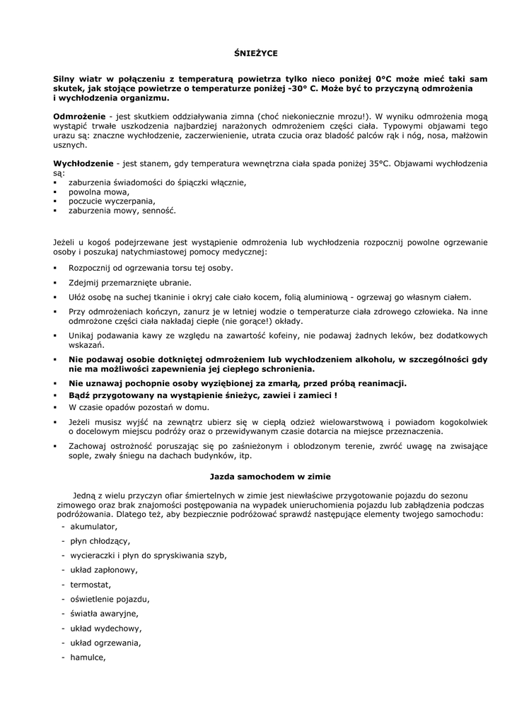 ŚNIEŻYCE Silny wiatr w połączeniu z temperaturą powietrza tylko nieco poniżej 0°C może mieć taki sam skutek, jak stojące powietrze o temperaturze poniżej -30° C. Może być to przyczyną odmrożenia i wychłodzenia organizmu. Odmrożenie - jest skutkiem oddziaływania zimna (choć niekoniecznie mrozu!). W wyniku odmrożenia mogą wystąpić trwałe uszkodzenia najbardziej narażonych odmrożeniem części ciała. Typowymi objawami tego urazu są: znaczne wychłodzenie, zaczerwienienie, utrata czucia oraz bladość palców rąk i nóg, nosa, małżowin usznych. Wychłodzenie - jest stanem, gdy temperatura wewnętrzna ciała spada poniżej 35°C. Objawami wychłodzenia są: zaburzenia świadomości do śpiączki włącznie, powolna mowa, poczucie wyczerpania, zaburzenia mowy, senność. Jeżeli u kogoś podejrzewane jest wystąpienie odmrożenia lub wychłodzenia rozpocznij powolne ogrzewanie osoby i poszukaj natychmiastowej pomocy medycznej: Rozpocznij od ogrzewania torsu tej osoby. Zdejmij przemarznięte ubranie. Ułóż osobę na suchej tkaninie i okryj całe ciało kocem, folią aluminiową - ogrzewaj go własnym ciałem. Przy odmrożeniach kończyn, zanurz je w letniej wodzie o temperaturze ciała zdrowego człowieka. Na inne odmrożone części ciała nakładaj ciepłe (nie gorące!) okłady. Unikaj podawania kawy ze względu na zawartość kofeiny, nie podawaj żadnych leków, bez dodatkowych wskazań. Nie podawaj osobie dotkniętej odmrożeniem lub wychłodzeniem alkoholu, w szczególności gdy nie ma możliwości zapewnienia jej ciepłego schronienia. Nie uznawaj pochopnie osoby wyziębionej za zmarłą, przed próbą reanimacji. Bądź przygotowany na wystąpienie śnieżyc, zawiei i zamieci ! W czasie opadów pozostań w domu. Jeżeli musisz wyjść na zewnątrz ubierz się w ciepłą odzież wielowarstwową i powiadom kogokolwiek o docelowym miejscu podróży oraz o przewidywanym czasie dotarcia na miejsce przeznaczenia. Zachowaj ostrożność poruszając się po zaśnieżonym i oblodzonym terenie, zwróć uwagę na zwisające sople, zwały śniegu na dachach budynków, itp. Jazda samochodem w zimie Jedną z wielu przyczyn ofiar śmiertelnych w zimie jest niewłaściwe przygotowanie pojazdu do sezonu zimowego oraz brak znajomości postępowania na wypadek unieruchomienia pojazdu lub zabłądzenia podczas podróżowania. Dlatego też, aby bezpiecznie podróżować sprawdź następujące elementy twojego samochodu: - akumulator, - płyn chłodzący, - wycieraczki i płyn do spryskiwania szyb, - układ zapłonowy, - termostat, - oświetlenie pojazdu, - światła awaryjne, - układ wydechowy, - układ ogrzewania, - hamulce, - odmrażacz, - poziom oleju (jeśli jest taka potrzeba, wymień na olej zimowy). Załóż zimowe opony i upewnij się, czy mają odpowiedni bieżnik. Uniwersalne opony radialne zazwyczaj nadają się do większości warunków zimowych. Jednakże, przepisy w niektórych krajach wymagają stosowania opon z łańcuchami lub opon śniegowych z kolcami. Miej przygotowaną skrobaczkę do szyb oraz narzędzie do usuwania śniegu. Utrzymuj co najmniej połowę pojemności zbiornika paliwa w czasie zimy. Starannie planuj długie podróże. Słuchaj komunikatów radiowych o aktualnych warunkach drogowych. Podróżuj w ciągu dnia i jeśli to możliwe, w towarzystwie przynajmniej jednej osoby. W czasie burzy śniegowej staraj się korzystać z komunikacji publicznej. Ubieraj się ciepło. Noś odzież wielowarstwową, lekko dopasowaną. Na czas dłuższej podróży przygotuj wysokoenergetyczne, suche pożywienie oraz kilka butelek wody. Miej w swoim samochodzie: migające światło przenośne z zapasowymi bateriami, apteczkę pierwszej pomocy oraz niezbędne leki, śpiwór lub koc, folię aluminiową, torby plastikowe (do celów sanitarnych), zapałki, małą łopatkę - saperkę, podręczne narzędzia - szczypce uniwersalne, klucz nastawny, śrubokręt itp., przewody do rozruchu silnika, linkę holowniczą, łańcuchy lub siatki do opon, jaskrawo kolorową tkaninę do użycia, jako flagi sygnalizacyjnej. Jeśli utknąłeś w drodze: Pozostań w samochodzie. Nie szukaj sam pomocy, chyba, że pomoc jest widoczna w odległości 100 m. Umocuj na antenie lub dachu samochodu jaskrawą część ubrania (najlepiej koloru czerwonego) tak, aby widoczna była dla ratowników. Użyj wszelkich dostępnych środków do poprawienia izolacji samochodu. Uruchamiaj silnik co godzinę na 10 minut. W czasie pracy silnika włącz ogrzewanie oraz zewnętrzne światła samochodu. Zachowaj ostrożność z uwagi na trujące działanie tlenku węgla w spalinach. Utrzymuj rurę wydechową wolną od śniegu oraz dla wentylacji lekko uchyl okna. Zwracaj uwagę na oznaki odmrożeń lub wychłodzenia organizmu. Wykonuj lekkie ćwiczenia dla utrzymania krążenia krwi. Od czasu do czasu klaskaj w dłonie, wykonuj wymachy ramionami. Staraj się nie przebywać w jednej pozycji zbyt długo. Jeśli w samochodzie jest więcej niż jedna osoba, należy spać kolejno, na zmianę. Dla utrzymania ciepła osoby powinny zgromadzić się koło siebie. Unikaj zbędnego lub nadmiernego wysiłku. Zimne otoczenie powoduje dodatkowe obciążenie dla serca. Nadmierny wysiłek, taki jak odgarnianie śniegu albo pchanie samochodu może spowodować zdrowotne dolegliwości.