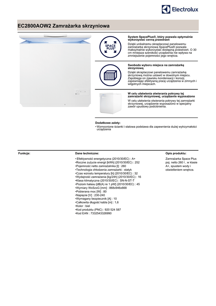 EC2800AOW2 Zamrażarka skrzyniowa System SpacePlus®, który pozwala optymalnie wykorzystać cenną przestrzeń Dzięki unikalnemu skraplaczowi panelowemu zamrażarka skrzyniowa SpacePlus® pozwala maksymalnie wykorzystać dostępną przestrzeń. O 30 cm mniejsza szerokość urządzenia nie wpływa na zmniejszenie pojemności jego wnętrza. Swoboda wyboru miejsca na zamrażarkę skrzyniową Dzięki skraplaczowi panelowemu zamrażarkę skrzyniową można ustawić w dowolnym miejscu. Zapobiega on zjawisku kondensacji i korozji, zapewniając efektywną pracę urządzenia w zimnych i wilgotnych miejscach. W celu ułatwienia otwierania pokrywy tej zamrażarki skrzyniowej, urządzenie wyposażono W celu ułatwienia otwierania pokrywy tej zamrażarki skrzyniowej, urządzenie wyposażono w specjalny zawór upustowy podciśnienia. Dodatkowe zalety: • Wzmocnione ścianki i stalowa podstawa dla zapewnienia dużej wytrzymałości urządzenia Funkcje: Dane techniczne: Opis produktu: • Efektywność energetyczna (2010/30/EC) : A+ •Roczne zużycie energii [kWh] (2010/30/EC) : 252 •Pojemność netto zamrażalnika [l] : 260 •Technologia chłodzenia zamrażarki : statyk •Czas wzrostu temperatury [h] (2010/30/EC) : 32 •Wydajność zamrażania [kg/24h] (2010/30/EC) : 16 •Klasa klimatyczna (2010/30/EC) : SN-N-ST-T •Poziom hałasu [dB(A) re 1 pW] (2010/30/EC) : 45 •Wymiary WxSzxG [mm] : 868x946x668 •Pobierana moc [W] : 80 •Napięcie [V] : 230-240 •Wymagany bezpiecznik [A] : 10 •Całkowita długość kabla [m] : 1,6 •Kolor : biel •Kod produktu (PNC) : 920 524 587 •Kod EAN : 7332543326990 Zamrażarka Space Plus poj. netto 260 l , w klasie A+, spustem wody i oświetleniem wnętrza.