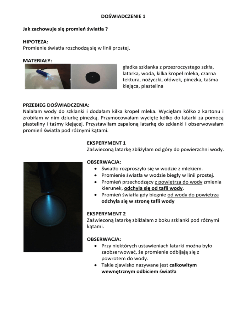 DOŚWIADCZENIE 1 Jak zachowuje się promień światła ? HIPOTEZA: Promienie światła rozchodzą się w linii prostej. MATERIAŁY: gładka szklanka z przezroczystego szkła, latarka, woda, kilka kropel mleka, czarna tektura, nożyczki, ołówek, pinezka, taśma klejąca, plastelina PRZEBIEG DOŚWIADCZENIA: Nalałam wody do szklanki i dodałam kilka kropel mleka. Wycięłam kółko z kartonu i zrobiłam w nim dziurkę pinezką. Przymocowałam wycięte kółko do latarki za pomocą plasteliny i taśmy klejącej. Przystawiłam zapaloną latarkę do szklanki i obserwowałam promień światła pod różnymi kątami. EKSPERYMENT 1 Zaświeconą latarkę zbliżyłam od góry do powierzchni wody. OBSERWACJA: Światło rozproszyło się w wodzie z mlekiem. Promienie światła w wodzie biegły w linii prostej. Promień przechodzący z powietrza do wody zmienia kierunek, odchyla się od tafli wody. Promień światła gdy biegnie od wody do powietrza odchyla się w stronę tafli wody EKSPERYMENT 2 Zaświeconą latarkę zbliżałam z boku szklanki pod różnymi kątami. OBSERWACJA: Przy niektórych ustawieniach latarki można było zaobserwować, że promienie odbijają się z powrotem do wody. Takie zjawisko nazywane jest całkowitym wewnętrznym odbiciem światła