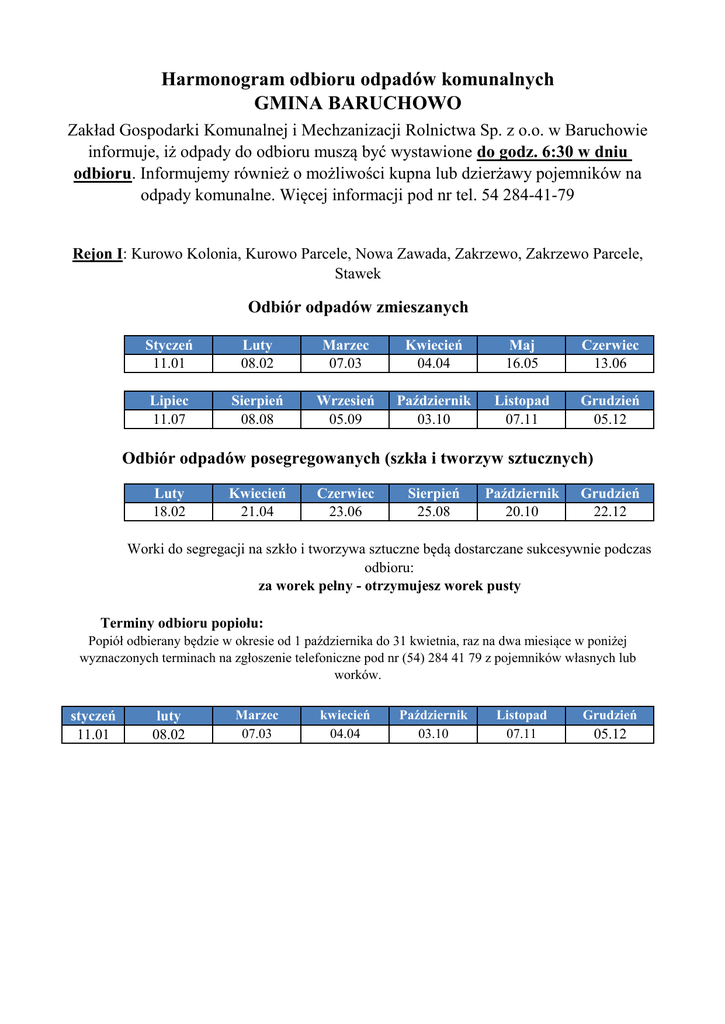 Harmonogram odbioru odpadów komunalnych GMINA BARUCHOWO Zakład Gospodarki Komunalnej i Mechzanizacji Rolnictwa Sp. z o.o. w Baruchowie informuje, iż odpady do odbioru muszą być wystawione do godz. 6:30 w dniu odbioru. Informujemy również o możliwości kupna lub dzierżawy pojemników na odpady komunalne. Więcej informacji pod nr tel. 54 284-41-79 Rejon I: Kurowo Kolonia, Kurowo Parcele, Nowa Zawada, Zakrzewo, Zakrzewo Parcele, Stawek Odbiór odpadów zmieszanych Styczeń 11.01 Luty 08.02 Marzec 07.03 Kwiecień 04.04 Maj 16.05 Czerwiec 13.06 Lipiec 11.07 Sierpień 08.08 Wrzesień 05.09 Październik 03.10 Listopad 07.11 Grudzień 05.12 Odbiór odpadów posegregowanych (szkła i tworzyw sztucznych) Luty 18.02 Kwiecień 21.04 Czerwiec 23.06 Sierpień 25.08 Październik 20.10 Grudzień 22.12 Worki do segregacji na szkło i tworzywa sztuczne będą dostarczane sukcesywnie podczas odbioru: za worek pełny - otrzymujesz worek pusty Terminy odbioru popiołu: Popiół odbierany będzie w okresie od 1 października do 31 kwietnia, raz na dwa miesiące w poniżej wyznaczonych terminach na zgłoszenie telefoniczne pod nr (54) 284 41 79 z pojemników własnych lub worków. styczeń 11.01 luty 08.02 Marzec 07.03 kwiecień 04.04 Październik 03.10 Listopad 07.11 Grudzień 05.12 Harmonogram odbioru odpadów komunalnych GMINA BARUCHOWO Zakład Gospodarki Komunalnej i Mechzanizacji Rolnictwa Sp. z o.o. w Baruchowie informuje, iż odpady do odbioru muszą być wystawione do godz. 6:30 w dniu odbioru. Informujemy również o możliwości kupna lub dzierżawy pojemników na odpady komunalne. Więcej informacji pod nr tel. 54 284-41-79 Rejon II: Czarne, Czarne Nadleśnictwo, Dębowo, Justynkowo, Okna, Patrowo, Patrówek, Radziszewo, Trzebowo, Zawada Piaski, Grodno, Boża Wola Odbiór odpadów zmieszanych Styczeń 11.01 Luty 08.02 Marzec 07.03 Kwiecień 04.04 Maj 16.05 Czerwiec 13.06 Lipiec 11.07 Sierpień 08.08 Wrzesień 05.09 Październik 03.10 Listopad Grudzień 05.12 07.11 Odbiór odpadów posegregowanych (szkła i tworzyw sztucznych) Luty 19.02 Kwiecień 22.04 Czerwiec 24..06 Sierpień 26.08 Październik 20.10 Grudzień 23.12 Worki do segregacji na szkło i tworzywa sztuczne będą dostarczane sukcesywnie podczas odbioru: za worek pełny - otrzymujesz worek pusty Terminy odbioru popiołu: Popiół odbierany będzie w okresie od 1 października do 31 kwietnia, raz na dwa miesiące w poniżej wyznaczonych terminach na zgłoszenie telefoniczne pod nr (54) 284 41 79 z pojemników własnych lub worków. Styczeń 11.01 luty 08.02 Marzec 07.03 kwiecień 04.04 Październik 03.10 Listopad 07.11 Grudzień 05.12 Harmonogram odbioru odpadów komunalnych GMINA BARUCHOWO Zakład Gospodarki Komunalnej i Mechzanizacji Rolnictwa Sp. z o.o. w Baruchowie informuje, iż odpady do odbioru muszą być wystawione do godz. 6:30 w dniu odbioru. Informujemy również o możliwości kupna lub dzierżawy pojemników na odpady komunalne. Więcej informacji pod nr tel. 54 284-41-79 Rejon III: Goreń, Goren Nowy, Goreń Duży, Kłótno, Lubaty, Niedźwiedź, Skrzynki, Telążna Kanał Odbiór odpadów zmieszanych Styczeń 11.01 Luty 08.02 Marzec 07.03 Kwiecień 04.04 Maj 16.05 Czerwiec 13.06 Lipiec 11.07 Sierpień 08.08 Wrzesień 05.09 Październik 03.10 Listopad Grudzień 05.12 07.11 Odbiór odpadów posegregowanych (szkła i tworzyw sztucznych) Luty 18.02 Kwiecień 22.04 Czerwiec 24..06 Sierpień 26.08 Październik 20.10 Grudzień 23.12 Worki do segregacji na szkło i tworzywa sztuczne będą dostarczane sukcesywnie podczas odbioru: za worek pełny - otrzymujesz worek pusty Terminy odbioru popiołu: Popiół odbierany będzie w okresie od 1 października do 31 kwietnia, raz na dwa miesiące w poniżej wyznaczonych terminach na zgłoszenie telefoniczne pod nr (54) 284 41 79 z pojemników własnych lub worków. styczeń 11.01 Luty 08.02 Marzec Kwiecień 07.03 04.04 Październik 03.10 Listopad 07.11 Grudzień 05.12 Harmonogram odbioru odpadów komunalnych GMINA BARUCHOWO Zakład Gospodarki Komunalnej i Mechzanizacji Rolnictwa Sp. z o.o. w Baruchowie informuje, iż odpady do odbioru muszą być wystawione do godz. 6:30 w dniu odbioru. Informujemy również o możliwości kupna lub dzierżawy pojemników na odpady komunalne. Więcej informacji pod nr tel. 54 284-41-79 Rejon IV: Baruchowo, Świątkowice Odbiór odpadów zmieszanych Styczeń 11.01 Luty 08.02 Marzec 07.03 Kwiecień 04.04 Maj 16.05 Czerwiec 13.06 Lipiec 11.07 Sierpień 08.08 Wrzesień 05.09 Październik 03.10 Listopad Grudzień 05.12 07.11 Odbiór odpadów posegregowanych (szkła i tworzyw sztucznych) Luty 18.02 Kwiecień 21.04 Czerwiec 23.06 Sierpień 25.08 Październik 20.10 Grudzień 22.12 Worki do segregacji na szkło i tworzywa sztuczne będą dostarczane sukcesywnie podczas odbioru: za worek pełny - otrzymujesz worek pusty Terminy odbioru popiołu: Popiół odbierany będzie w okresie od 1 października do 31 kwietnia, raz w miesiącu w poniżej wyznaczonych terminach na zgłoszenie telefoniczne pod nr (54) 284 41 79 z pojemników własnych lub worków. Styczeń 11.01 Luty 08.02 Marzec 07.03 Kwiecień 04.04 Październik 03.10 Listopad Grudzień 07.11 05.12
