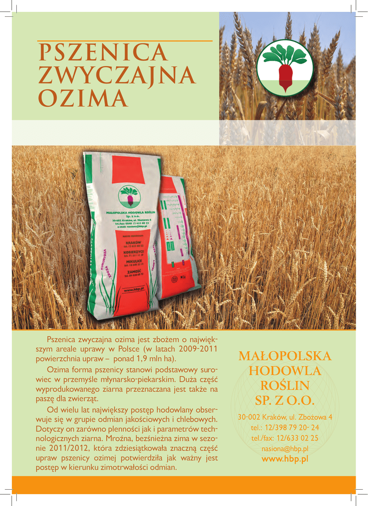 PSZENICA ZWYCZAJNA OZIMA Pszenica zwyczajna ozima jest zbożem o największym areale uprawy w Polsce (w latach 2009-2011 powierzchnia upraw – ponad 1,9 mln ha). Ozima forma pszenicy stanowi podstawowy surowiec w przemyśle młynarsko-piekarskim. Duża część wyprodukowanego ziarna przeznaczana jest także na paszę dla zwierząt. Od wielu lat największy postęp hodowlany obserwuje się w grupie odmian jakościowych i chlebowych. Dotyczy on zarówno plenności jak i parametrów technologicznych ziarna. Mroźna, bezśnieżna zima w sezonie 2011/2012, która zdziesiątkowała znaczną część upraw pszenicy ozimej potwierdziła jak ważny jest postęp w kierunku zimotrwałości odmian. ODMIANY JAKOŚCIOWE GRUPA A NATULA Bardzo wysokie parametry technologiczne ziarna i mniejsze wymagania agrotechniczne. Wyjątkowe możliwości przystosowania się do zróżnicowanych warunków klimatyczno-glebowych. • termin kłoszenia średnio wczesny, dojrzewania średni • wysoka mrozoodporność (5 w skali 9-stopniowej) • bardzo wysokie, stabilne plony na terenie całego kraju na obu poziomach agrotechniki; dobrze plonuje również na glebach słabszych (IVa, IVb) • odmiana o bardzo dobrej zdolności krzewienia • bardzo dobra odporność na choroby grzybowe, głównie na mączniaka prawdziwego i rdzę brunatną • rośliny średniej wysokości o małej skłonności do wylegania i porastania w kłosie • ziarno czerwone, grube o wysokiej MTZ i rewelacyjnych parametrach jakościowych; korzystne parametry utrzymują się również w gorszych latach • bardzo wysoka zawartość białka i silnego glutenu • odmiana tolerancyjna na zakwaszenie gleby, możliwa uprawa również na glebach słabszych • posiada doskonałe własciwości adaptacyjne do różnych warunków klimatyczno-glebowych; zarejestrowana na Białorusi, Ukrainie, w Rosji; z powodzeniem uprawiana w Czechach, na Litwie i w Turcji • nie reaguje obniżką plonu na opóźniony siew NORMA WYSIEWU 350-400 ziaren/m2, 165-190 kg/ha Plonowanie pszenicy ozimej Natula na tle wzorca w latach 2010–2012 w q/ha (dane COBORU) 92,9 88,5 90 88,1 88,1 84,6 81,2 81,3 77,9 77,9 80 73,8 73,1 69,6 70 2010 2011 a1 2012 wzorzec 2010 Natula 2 2011 a2 2012 GRUPA A ODMIANY JAKOŚCIOWE KOHELIA Bardzo grube, dorodne ziarno. • termin kłoszenia i dojrzewania średni • bardzo dobra plenność we wszystkich rejonach uprawy pszenicy w Polsce • rośliny średniej wysokości • bardzo wysoka mrozoodporność (5 w skali 9-stopniowej) • odporność na choroby przeciętna • ziarno grube (wysoka MTZ), szkliste, o dobrym wyrównaniu NORMA WYSIEWU 380-400 ziaren/m2, 180-200 kg/ha MUZA Jakość, plenność, mrozoodporność, tolerancja na zakwaszenie gleby. • odmiana średnio wczesna • rośliny średniej wysokości o sztywnej słomie i bardzo dużej odporności na wyleganie • wysoka mrozoodporność i zimotrwałość • tolerancyjna na zakwaszenie gleby • dobra odporność na choroby • ziarno czerwone, bardzo dobrze wyrównane • duża odporność na porastanie ziarna w kłosie • bardzo dobre parametry technologiczne ziarna: wysoka zawartość białka i glutenu, wysoka liczba opadania NORMA WYSIEWU 380-400 ziaren/m2, 180-190 kg/ha TURNIA Bardzo dobra odporność na choroby kłosa. • termin kłoszenia średni, dojrzewania dość późny • odmiana intensywna, wysokoplenna • rośliny wysokie o długim, dorodnym kłosie • odporność na choroby zróżnicowana; bardzo dobra odporność na choroby kłosa • ziarno czerwone, bardzo grube (wysoka MTZ), nie porasta w kłosie • dobre parametry jakościowe ziarna: wysoka zawartość glutenu o bardzo dobrej jakości, wysoka liczba opadania (nawet w niekorzystnych latach) • zalecany optymalny termin siewu • odmiana zarejestrowana i z powodzeniem uprawiana na Białorusi NORMA WYSIEWU 380-400 ziaren/m2, 200-210 kg/ha 3 ODMIANY CHLEBOWE GRUPA B KOBIERA Rewelacyjna mrozoodporność. • odmiana średnio wczesna, ogólnoużytkowa – na paszę i chleb • bezkonkurencyjna mrozoodporność (6 w skali 9-stopniowej) • rośliny średniej wysokości • odporność na choroby zróżnicowana, bardzo dobra na septoriozę plew i fuzariozę kłosów, słabsza na choroby podstawy źdźbła • odmiana odporna na wyleganie i porastanie w kłosie • ziarno szkliste, o wysokiej zawartości glutenu i wysokiej liczbie opadania NORMA WYSIEWU 380-400 ziaren/m2, 170-190 kg/ha WYMAGANIA KLIMATYCZNO-GLEBOWE Warunki siedliskowe takie jak nasłonecznienie, dostępność wody i składników pokarmowych kształtują parametry jakościowe ziarna pszenicy i decydują o ich przydatności. Uprawę pszenicy ozimej do celów konsumpcyjnych należy zlokalizować na glebach najlepszych (kompleks pszenny bardzo dobry, dobry i żytni bardzo dobry), zasobnych w składniki pokarmowe, o uregulowanych stosunkach wodnych i pH 6,5-7. Gwarantuje to uzyskanie surowca o wysokiej MTZ i dużej gęstości w stanie zsypnym. Nie zalecane są gleby lekkie, piaszczyste, podmokłe, zimne i kwaśne. Na glebach kwaśnych w pierwszej kolejności należy poprawić pH. Przy odczynie poniżej 5,5 rośliny mają ograniczoną możliwość pobierania fosforu, wapnia, magnezu, potasu i azotu. WYBÓR PRZEDPLONU Pszenica spośród roślin zbożowych ma największe wymagania co do przedplonu. Wadliwy wybór stanowiska powoduje obniżenie plonu nawet do 30%. Najbardziej odpowiednim przedplonem są: okopowe, strączkowe i oleiste. TERMIN I ILOŚĆ WYSIEWU Siew należy wykonać w optymalnym terminie agrotechnicznym dla danego rejonu kraju. Dla większości rejonów jest okres od 15 września do 20 października. Opóźniony siew zmniejsza intensywność krzewienia i powoduje słaby rozwój systemu korzeniowego, a co za tym idzie zwiększa ryzyko złego przezimowania roślin. Zalecana obsada w zależności od odmiany: 300-400 ziaren/m2, 160-230 kg/ha. W przypadku opóźnionego siewu zaleca się zwiększenie ilości wysiewu o 10%. 4 GRUPA C ODMIANY PASTEWNE 