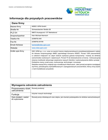 Industrie- und Handelskammer Südthüringen Informacje dla przyszłych pracowników Dane firmy Nazwa firmy NIDEC GPM GmbH Straße Nr. Schwarzbacher Straße 28 PLZ Ort 98673 Auengrund / OT Merbelsrod Ansprechpartner Herr Michael Harnisch Telefon-Nr. (036878) 640 Fax-Nr. (036878) 64195 Email-Adresse [email protected] Website www.nidec-gpm.com Krótki opis firmy .NI DEC GPM sp. z o.o. wraz ze swoimi trzema międzynarodowymi przedstawicielstwawmi należy do obszaru korporacyjnego AMEC japońskiego koncernu NIDEC. Ponad 1200 pracowników w czterech miejscach na całym świecie wytwarza gotowe komponenty i moduły do silników samochodów osobowych i ciężarowych. Ponad 75 lat doświadczenia w branży motoryzacyjnej stwarza możliwość aktywnego wspierania naszych klientów i wykorzystywania efektu synergii . Dokładnie znamy rynek pracy, konkurencję, technologie i innowacje. Siedziba naszej firmy znajduje się w środkowych Niemczech. Jako ponad przciętnie rozwijająca się firma, potrzebujemy wykwalifikowanych i zaangażowanych pracowników, którzy chcą razem z nami kształtować przyszłość. Wymagania odnośnie zatrudnienia Proponowany dział zatrudnienia Rozwój produkcji Funkcja Inżynier nowych technologii Opis działań i zadań do wykonania Rozwój pomp chłodzących oraz olejów, jak również podzespołów do silników samochodowych Profil pracownika Specjalista z kwalifikacjami Preferowane kwalifikacje Licencjat, magisterium, dyplom Wymagany staż pracy TAK X 2-3 lata Wymagane specjalności CAD-Systeme: CATIA/Siemens NX, ProEngineer/CREO lub UniGraphixs Znajomość języków(w załączniku) Europejskie poziomy kompetencji językowych, co najmniej: A1 □ A2 □ B1 □ B2 x C1 □ C2 □ Niemiecki A1 □ A2 □ B1 □ B2 x C1 □ C2 □ Angielski x Angielski komunikacyjny Obsługa komputera (zazwać programy) Prawo jazdy Oczekiwania w stosunku do pracowników MS Office TAK X Umiejętność samodzielnej pracy zespołowej Ramowe warunki zatrudnienia Plan pracy tygodniowej Stażysta Specjalista X Ilość dni pracy w tygodniu: 5 Ilość godzin pracy w tygodniu: 40 Dzienna ilość godzin pracy: 8 Praca w systemie zmianowym: NIE Praca w weekend: NIE Inne: Wyjazdy służbowe Dodatkowe informacje Przerwy na posiłek