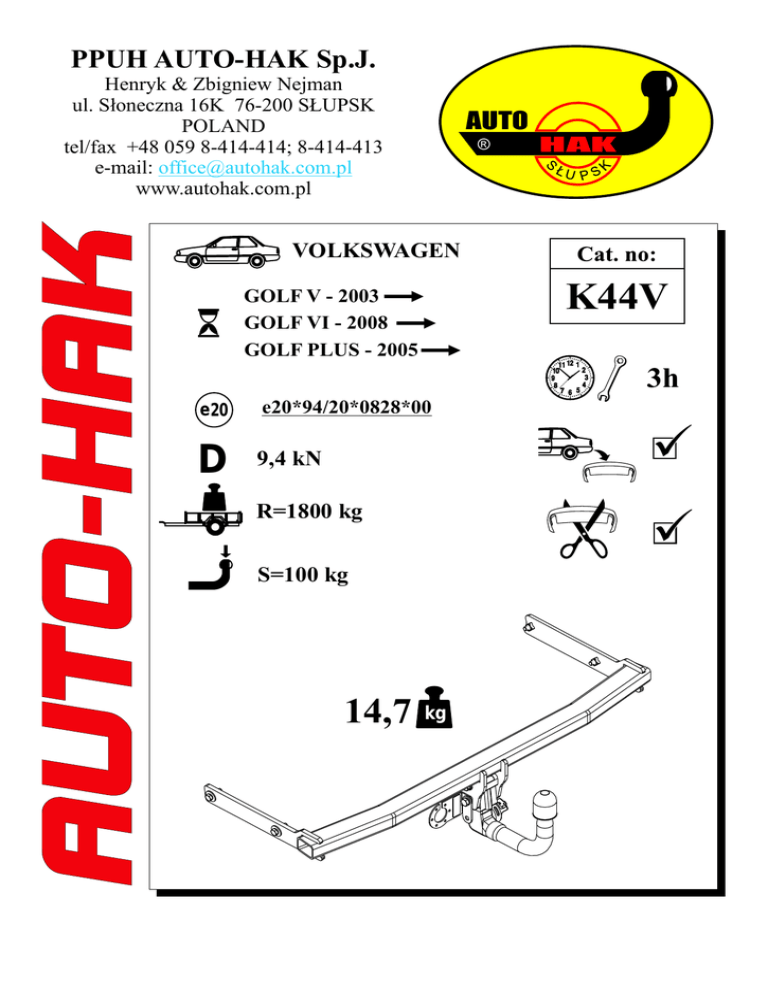 PPUH AUTO-HAK Sp.J. Henryk & Zbigniew Nejman ul. Słoneczna 16K 76-200 SŁUPSK POLAND tel/fax +48 059 8-414-414; 8-414-413 e-mail: [email protected] www.autohak.com.pl AUTO ® HAK VOLKSWAGEN K44V GOLF V - 2003 GOLF VI - 2008 GOLF PLUS - 2005 3h e 20 e20*94/20*0828*00 D 9,4 kN R=1800 kg S=100 kg 14,7 kg OD PRODUCENTA: PL Dziękujemy za wybór produkowanego przez naszą firmę zaczepu kulowego. Jego niezawodność została potwierdzona licznymi testami oraz opiniami zadowolonych klientów. Jednakże niezawodność zaczepów kulowych jest zależna również od prawidłowego montażu oraz prawidłowej eksploatacji. Z tego powodu prosimy Państwa o staranne przeczytanie niniejszej instrukcji montażu oraz przestrzeganie właściwych wskazówek. Zaczep należy zamontować w miejscach do tego celu przeznaczonych przez producenta samochodu. FROM MANUFACTURER: GB Thank you for buying our product. Their reliability has been confirmed in many tests. Reliability of towbar depends also on correct assembly and right operation. For this reasons we kindly ask to read carefully this instruction and apply to hints. The towbar should be install in points described by a car producer. VON DEM HERSTELLER: D Die Zuverlässigkeit der Anhängekupplung ist jedoch auch von der ordnungsgemäßen Montage und der richtigen Nutzung abhängig. Daher werden Sie gebeten, sorgfältig die folgende Montageanleitung zu lesen und sich an die entsprechenden Anweisungen zu halten. Die Anhängekupplung muss an den vom Fahrzeughersteller vorgeschriebenen Befestigungsstellen montiert werden. DE LA PART DU FABRICANT: F Merci d'avoir choisi le dispositif d'attelage à boule produit par notre société. Son fiabilité a été confirmée dans de nombreux tests et par les opinions des clients satisfaits. Toutefois, la fiabilité des dispositifs d'attelage à boule dépend aussi d'installation et d'exploitation correcte. Pour cette raison, nous vous demandons de lire attentivement cette instruction de montage et de respecter les conseils. Le dispositif d'attelage à boule doit être monté dans des emplacements prévus a ce but par le fabricant de voiture. FRA PRODUCENTEN: DK Tak fordi De har valgt vores anhængertræk. Dets pålidelighed er blevet bekræftet i mange undersøgelser samt af tilfredse kunder. Vores anhængertræks pålidelighed er også afhængig af korrekt montering og korrekt betjening. Af denne grund beder vi Dem at læse denne instruktion grundigt og overholde de korrekte anvisninger. DE PRODUCTOR: E Gracias por la elección del enganche de bola producido por nuestra empresa. Su fiabilidad fue confirmada por numerosos testos y opiniones de los clientes quienes estuvieron contentos. Sin embargo la fiabilidad de enganche de bola depende también de un montaje adecuado y su explotación adecuada. Por esa causa por favor leer atentamente la instrucción del montaje y observar adecuadas indicadoras. VAN DE FABRIKANT: NL Bedankt voor de aanschaf van onze kogeltrekhaak. Hoe betrouwbaar die is blijkt wel uit vele tests en meningen van tevreden klanten. Toch is de betrouwbaarheid van een kogeltrekhaak er mede van afhankelijk dat deze correct gemonteerd is en op de juiste manier wordt gebruikt. Daarom wordt u verzocht deze montagehandleiding zorgvuldig te lezen en de aanwijzingen te volgen. FRA PRODUSENTEN: N Takk for at dere har valgt kulefestet produsert av vårt firma. Driftssikkerheten på kulefestet har blitt bekreftet av flere tester og tilbakemeldinger fra fornøyde kunder. Allikevel er driftssikkerheten også avhengig av en korrekt montering og riktig bruk. Derfor ber vi dere om å lese denne monteringsinstruksen nøye og anbefaler at dere følger veiledningen. ETT BUDSKAP FRÅN TILLVERKAREN: S Vi skulle vilja tacka er för ert val och inköp. Våra dragkrokars pålitlighet har bevisats av olika tester samt referenser från nöjda kunder. Man får inte glömma att dragkrokars pålitlighet beror också på rätt installation och rätt bruk. Därför skulle vi vilja be att ni läser noga denna installationsanvisning och följer alla regler och tips som den anger. Dragkroken ska installeras i ett ställe som blivit påpekade av biltillverkaren. DAL FABBRICANTE: IT -2- Vi ringraziamo per aver scelto il gancio di traino a sfera prodotto dalla nostra azienda. La sua affidabilità è stata confermata da numerosi test e dalle opinioni positive dei clienti. Tuttavia, il perfetto funzionamento dei ganci di traino a sfera dipende anche dalla correttezza del montaggio e dall'utilizzo appropriato. Per questo motivo, Vi preghiamo di leggere attentamente le presenti istruzioni di montaggio e di attenervi alle indicazioni in esse contenute. Il gancio di traino deve essere montato nei punti predisposti a tal fine dal fabbricante del veicolo. PL GB D F Należy zagwarantować przestrzeń swobodną według załącznika VII, ilustracja 30 wytycznej 94/20/WE przy dopuszczalnym ciężarze całkowitym pojazdu. The clearance specified in appendix VII, diagram 30 of guideline 94/20/EC must be guaranteed at laden weight of the vehicle. Der Freiraum nach Anhang VII,Abbildung 30 der Richtlinie94/20/EG ist zu gewährleistenbei zulässigem Gesamtgewichtdes Fahrzeuges. L’ e s p a c e l i b r e d o i t ê t r e garanticonformément à l’annexe VII,illustration 30 de la directive94/20/CE pour poids total encharge autorisé du véhicule. A-A DK I overensstemmelse med bilag VII, figur 30 til retningslinie 94/20/EF for køretøjets tilladte totalvægt skal der garanteres en friplads. E Hay que garantizar un espacio suelto según archivo adjunto VII, ilustración 30 trazado 94/20/WE de peso admisible y total del vehículo. NL N Det skal sørges for fritt rom ifølge vedlegget VII, illustrasjon 30 retningslinjen 94/20/WE ved den tillatte totale vekten av fartøyet. S Man ska garantera ett fritt tillgängligt utrymme - se bilaga VII, diagram 30 enligt riktlinjer 94/20/WE vid ett fordons maximala belastning. IT B-B De in bijlage VII afbeelding 30 van richt