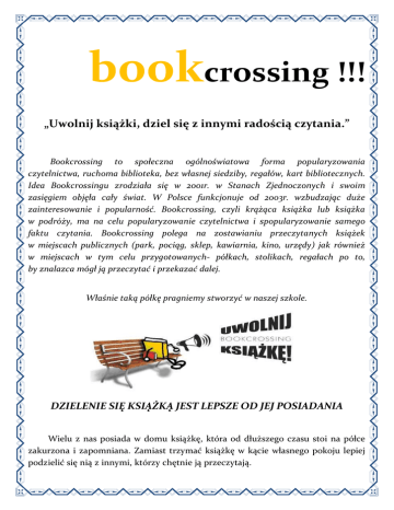 bookcrossing !!! „Uwolnij książki, dziel się z innymi radością czytania.” Bookcrossing to społeczna ogólnoświatowa forma popularyzowania czytelnictwa, ruchoma biblioteka, bez własnej siedziby, regałów, kart bibliotecznych. Idea Bookcrossingu zrodziała się w 2001r. w Stanach Zjednoczonych i swoim zasięgiem objęła cały świat. W Polsce funkcjonuje od 2003r. wzbudzając duże zainteresowanie i popularność. Bookcrossing, czyli krążąca książka lub książka w podróży, ma na celu popularyzowanie czytelnictwa i spopularyzowanie samego faktu czytania. Bookcrossing polega na zostawianiu przeczytanych książek w miejscach publicznych (park, pociąg, sklep, kawiarnia, kino, urzędy) jak również w miejscach w tym celu przygotowanych- półkach, stolikach, regałach po to, by znalazca mógł ją przeczytać i przekazać dalej. Właśnie taką półkę pragniemy stworzyć w naszej szkole. DZIELENIE SIĘ KSIĄŻKĄ JEST LEPSZE OD JEJ POSIADANIA Wielu z nas posiada w domu książkę, która od dłuższego czasu stoi na półce zakurzona i zapomniana. Zamiast trzymać książkę w kącie własnego pokoju lepiej podzielić się nią z innymi, którzy chętnie ją przeczytają. Jak będziemy organizować bookcrossing w naszej szkole: 1. Półka będzie znajdowała „BOOKCROSSING”. się na terenie szkoły z oznaczeniem 2. Na półce zostaną wyłożone książki, które uczniowie (za zgodą rodziców), rodzice, nauczyciele przyniosą do szkoły w celu jej przekazywania innym. Książki można przynosić nawet już dziś! 3. Książki należy przynosić do biblioteki szkolnej, gdzie zostaną oznaczone specjalną etykietą: 4. Oznaczone książki będą uwalniane przez cały rok szkolny. Każda osoba (uczeń, rodzic, nauczyciel, pracownik szkoły) zainteresowana przeczytaniem książki może ją zabrać do domu, przeczytać, a następnie przynieść do szkoły i zostawić innym do ponownego przeczytania. 5. Dbamy o wszystkie „uwalniane” książki. Organizator: BIBLIOTEKA SZKOLNA, SAMORZĄD UCZNIOWSKI Koordynator: RENATA WIŚNIEWSKA