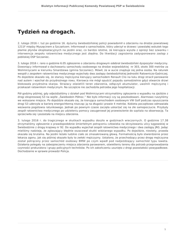 Biuletyn Informacji Publicznej Komendy Powiatowej PSP w Świebodzinie Tydzień na drogach. 2. lutego 2016 r. tuż po godzinie 16. dyżurny świebodzińskiej policji powiadomił o zdarzeniu na drodze powiatowej 1211F między Myszęcinem a Szczańcem. Informował o samochodzie, który uderzył w drzewo i powstałej wskutek tego plamie płynów eksploatacyjnych na jezdni oraz, co bardzo istotne, że kierująca wyszła z opresji bez szwanku i interwencja zespołu ratownictwa medycznego jest zbędna. Do likwidacji zagrożenia zadysponowano zastęp z pobliskiej OSP Szczaniec. 3. lutego 2016 r. rano o godzinie 6.05 zgłoszenie o zdarzeniu drogowym odebrał świebodziński dyspozytor medyczny. Dzwoniący informował o dachowaniu samochodu osobowego na drodze wojewódzkiej nr 303, około 300 metrów za Wolimirzycami w kierunku Smardzewa (gmina Szczaniec). Mówił, że w aucie znajduje się jedna osoba. Na ratunek wespół z zespołem ratownictwa medycznego wyjechały dwa zastępy świebodzińskiej Jednostki Ratowniczo-Gaśniczej. Po dojeździe okazało się, że starszy mężczyzna kierujący samochodem Renault Clio na łuku drogi stracił panowanie nad autem i wjechał do przydrożnego rowu. Kierowca nie mógł opuścić pojazdu samodzielnie gdyż otwarcie drzwi blokowała przydrożna skarpa. Strażacy oświetlili teren zdarzenia, odłączyli akumulator, uwolnili mężczyznę i przekazali ratownikom medycznym. Na szczęście nie zachodziła potrzeba jego hospitalizacji. Pół godziny później, gdy odjeżdżaliśmy z działań pod Wolimirzycami otrzymaliśmy zgłoszenie o wypadku na zjeździe z drogi ekspresowej S3 na węźle „Świebodzin Północ.” Nie było informacji czy są poszkodowani. Alarmowo ruszyliśmy we wskazane miejsce. Po dojeździe okazało się, że kierująca samochodem osobowym VW Golf podczas opuszczania drogi S3 uderzyła w barierę energochłonną niszcząc ją na długości prawie 4 metrów. Kobieta początkowo odmawiała wezwania pogotowia ratunkowego. Jednak po pewnym czasie zaczęła uskarżać się na złe samopoczucie. Przybyły zespół ratownictwa medycznego po udzieleniu pomocy zasugerował jej przewiezienie do szpitala na obserwację. Ta sprzeciwiła się i pozostała na miejscu zdarzenia. 3. lutego 2016 r. do tragicznego w skutkach wypadku doszło w godzinach wieczornych. O godzinie 17.38 otrzymaliśmy zgłoszenie o prawdopodobnie śmiertelnym potrąceniu człowieka na skrzyżowaniu ulicy Łęgowskiej w Świebodzinie z drogą krajową nr 92. Do wypadku wyjechał zespół ratownictwa medycznego i dwa zastępy JRG. Jadąc mieliśmy nadzieję, że zgłaszający błędnie oszacował skutki widzianego wypadku. Po dojeździe, niestety, prawda okazała się brutalna. Na jezdni leżało ludzkie ciało ze zmasakrowaną głową. Formalnością było stwierdzenie przez lekarza zgonu. Jak się później okazało były to zwłoki mężczyzny. Ustalono, że przechodzący przez drogę mężczyzna został potrącony przez samochód osobowy BMW po czym wpadł pod nadjeżdżający samochód typu laweta. Działania polegały na zabezpieczeniu miejsca zdarzenia parawanem, oświetleniu terenu dla potrzeb przeprowadzenia czynności prokuratora i grupy policyjnych techników. Po ich zakończeniu usunięto z drogi pozostałości powypadkowe. Dochodzenie w sprawie prowadzi Policja. 1