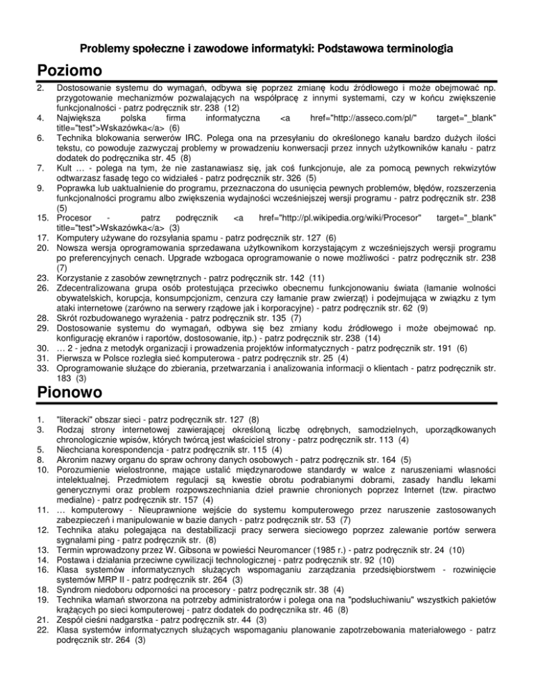 Problemy społeczne i zawodowe informatyki: Podstawowa terminologia Poziomo 2. 4. 6. 7. 9. 15. 17. 20. 23. 26. 28. 29. 30. 31. 33. Dostosowanie systemu do wymagań, odbywa się poprzez zmianę kodu źródłowego i moŜe obejmować np. przygotowanie mechanizmów pozwalających na współpracę z innymi systemami, czy w końcu zwiększenie funkcjonalności - patrz podręcznik str. 238 (12) Największa polska firma informatyczna <a href="http://asseco.com/pl/" target="_blank" title="test">Wskazówka</a> (6) Technika blokowania serwerów IRC. Polega ona na przesyłaniu do określonego kanału bardzo duŜych ilości tekstu, co powoduje zazwyczaj problemy w prowadzeniu konwersacji przez innych uŜytkowników kanału - patrz dodatek do podręcznika str. 45 (8) Kult … - polega na tym, Ŝe nie zastanawiasz się, jak coś funkcjonuje, ale za pomocą pewnych rekwizytów odtwarzasz fasadę tego co widziałeś - patrz podręcznik str. 326 (5) Poprawka lub uaktualnienie do programu, przeznaczona do usunięcia pewnych problemów, błędów, rozszerzenia funkcjonalności programu albo zwiększenia wydajności wcześniejszej wersji programu - patrz podręcznik str. 238 (5) Procesor patrz podręcznik <a href="http://pl.wikipedia.org/wiki/Procesor" target="_blank" title="test">Wskazówka</a> (3) Komputery uŜywane do rozsyłania spamu - patrz podręcznik str. 127 (6) Nowsza wersja oprogramowania sprzedawana uŜytkownikom korzystającym z wcześniejszych wersji programu po preferencyjnych cenach. Upgrade wzbogaca oprogramowanie o nowe moŜliwości - patrz podręcznik str. 238 (7) Korzystanie z zasobów zewnętrznych - patrz podręcznik str. 142 (11) Zdecentralizowana grupa osób protestująca przeciwko obecnemu funkcjonowaniu świata (łamanie wolności obywatelskich, korupcja, konsumpcjonizm, cenzura czy łamanie praw zwierząt) i podejmująca w związku z tym ataki internetowe (zarówno na serwery rządowe jak i korporacyjne) - patrz podręcznik str. 62 (9) Skrót rozbudowanego wyraŜenia - patrz podręcznik str. 135 (7) Dostosowanie systemu do wymagań, odbywa się bez zmiany kodu źródłowego i moŜe obejmować np. konfigurację ekranów i raportów, dostosowanie, itp.) - patrz podręcznik str. 238 (14) … 2 - jedna z metodyk organizacji i prowadzenia projektów informatycznych - patrz podręcznik str. 191 (6) Pierwsza w Polsce rozległa sieć komputerowa - patrz podręcznik str. 25 (4) Oprogramowanie słuŜące do zbierania, przetwarzania i analizowania informacji o klientach - patrz podręcznik str. 183 (3) Pionowo 1. 3. 5. 8. 10. 11. 12. 13. 14. 16. 18. 19. 21. 22. "literacki" obszar sieci - patrz podręcznik str. 127 (8) Rodzaj strony internetowej zawierającej określoną liczbę odrębnych, samodzielnych, uporządkowanych chronologicznie wpisów, których twórcą jest właściciel strony - patrz podręcznik str. 113 (4) Niechciana korespondencja - patrz podręcznik str. 115 (4) Akronim nazwy organu do spraw ochrony danych osobowych - patrz podręcznik str. 164 (5) Porozumienie wielostronne, mające ustalić międzynarodowe standardy w walce z naruszeniami własności intelektualnej. Przedmiotem regulacji są kwestie obrotu podrabianymi dobrami, zasady handlu lekami generycznymi oraz problem rozpowszechniania dzieł prawnie chronionych poprzez Internet (tzw. piractwo medialne) - patrz podręcznik str. 157 (4) … komputerowy - Nieuprawnione wejście do systemu komputerowego przez naruszenie zastosowanych zabezpieczeń i manipulowanie w bazie danych - patrz podręcznik str. 53 (7) Technika ataku polegająca na destabilizacji pracy serwera sieciowego poprzez zalewanie portów serwera sygnałami ping - patrz podręcznik str. (8) Termin wprowadzony przez W. Gibsona w powieści Neuromancer (1985 r.) - patrz podręcznik str. 24 (10) Postawa i działania przeciwne cywilizacji technologicznej - patrz podręcznik str. 92 (10) Klasa systemów informatycznych słuŜących wspomaganiu zarządzania przedsiębiorstwem - rozwinięcie systemów MRP II - patrz podręcznik str. 264 (3) Syndrom niedoboru odporności na procesory - patrz podręcznik str. 38 (4) Technika włamań stworzona na potrzeby administratorów i polega ona na "podsłuchiwaniu" wszystkich pakietów krąŜących po sieci komputerowej - patrz dodatek do podręcznika str. 46 (8) Zespół cieśni nadgarstka - patrz podręcznik str. 44 (3) Klasa systemów informatycznych słuŜących wspomaganiu planowanie zapotrzebowania materiałowego - patrz podręcznik str. 264 (3) 24. ZłoŜony ze znaków tekstowych wyraz nastroju, uŜywany przez uŜytkowników Internetu - patrz podręcznik str. 137 (8) 25. Programy, których moŜna uŜywać i rozpowszechniać za darmo bez ujawnienia kodu źródłowego. Nie wolno ich jednak sprzedawać, ani dokonywać w nich zmian, umieszczając wewnątrz na przykład własną reklamę. MoŜe być objęte prawami autorskimi lub nie - patrz podręcznik str. 273 (8) 26. Oprogramowanie, za którego uŜytkowanie jego autor nie pobiera opłaty. Zamiast tego program wyświetla banery reklamowe - patrz podręcznik str. 272 (6) 27. Rodzaj płatnego programu komputerowego, który jest rozpowszechniany bez opłat do sprawdzenia przez uŜytkowników. Po okresie próbnym (najczęściej po miesiącu) za taki program trzeba płacić - patrz podręcznik str. 274 (9) 32. Dostarczanie usług aplikacyjnych. Usługa ta obejmuje zdalne udostępnianie systemu informatycznego <a href="http://pl.wikipedia.org/wiki/Application_Service_Provider" target="_blank" title="test">Wskazówka</a> (3)