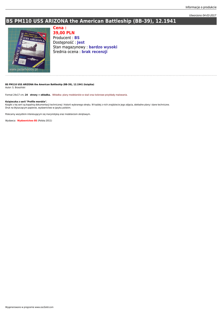 Informacje o produkcie Utworzono 04-03-2017 BS PM110 USS ARIZONA the American Battleship (BB-39), 12.1941 Cena : 39,00 PLN Producent : BS Dostępność : Jest Stan magazynowy : bardzo wysoki Średnia ocena : brak recenzji BS PM110 USS ARIZONA the American Battleship (BB-39), 12.1941 (książka) Autor: S. Brzeziński Format 24x17 cm; 24 strony + okładka. Wkładka: plany modelarskie w skali oraz kolorowe przykłady malowania. Książeczka z serii "Profile morskie". Książki z tej serii są kopalnią dokumentacji technicznej i historii wybranego okrętu. W każdej z nich znajdziecie jego zdjęcia, dokładne plany i dane techniczne. Druk na błyszczącym papierze, wydawnictwo w języku polskim. Polecamy wszystkim interesującym się marynistyką oraz modelarzom okrętowym. Wydawca: Wydawnictwo BS (Polska 2011) Wygenerowano w programie www.oscGold.com Ważne informacje: Prosimy o dokładne zapoznanie się z zasadami działania naszego sklepu. To bardzo ważne i pozwoli na uniknięcie nieporozumień związanych z koniecznością oczekiwania na przesyłkę. Wszystkie zamówienia realizujemy w kolejności zgłoszeń. Wybranie "przesyłka priorytetowa" jako sposobu wysyłki nie oznacza, że paczka zostanie wysłana na drugi dzień. To tylko rodzaj usługi pocztowej. Firma Jadar-Model jest właścicielem dwóch sklepów. Jeden z nich to sklep internetowy, drugi zaś jest prawdziwy i mieści się w Warszawie, stolicy Polski. Te same modele i akcesoria oferowane w sklepie internetowym sprzedawane są w jednocześnie w obu sklepach. Ponieważ nasza oferta jest bardzo duża nie mamy magazynu z wielką ilością tych samych przedmiotów. Może zdarzyć się, że model, który chcesz kupić został sprzedany w drugim sklepie. Wtedy zostaniesz powiadomiony emailem, że realizacja Twojego zamówienia będzie dłuższa, ponieważ musimy uzupełnić magazyn i czekamy na dostawę od producenta. Prosimy o cierpliwość i wyrozumiałość. Nie ponosimy odpowiedzialności za różnicę w zawartości pudełka w stosunku do prezentowanego zdjęcia. Zdjęcia są zazwyczaj reklamówkami i mogą zawierać również inne części, które nie wchodzą w skład danego produktu. Salon Modelarski Jadar-Model Ul. Jagiellońska 58, 03-468 Warszawa (przy Pl.Hallera) tel.(0 22) 403-34-30 (w sprawie zamówień prosimy dzwonić: (0 22) 620-05-39) Tutaj jesteśmy - kliknij poniższy link: Warszawa, Jagiellońska 58 sklep jest czynny w godz.: pon.-pt. 11.oo 19.oo sobota 10.oo 14.oo