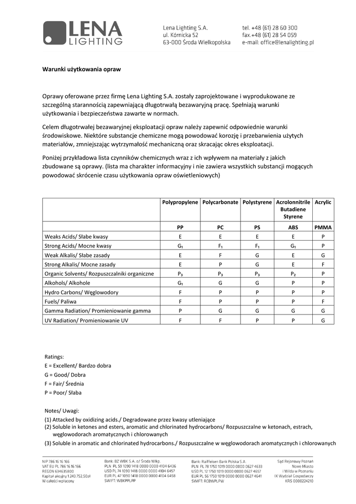 Warunki użytkowania opraw Oprawy oferowane przez firmę Lena Lighting S.A. zostały zaprojektowane i wyprodukowane ze szczególną starannością zapewniającą długotrwałą bezawaryjną pracę. Spełniają warunki użytkowania i bezpieczeństwa zawarte w normach. Celem długotrwałej bezawaryjnej eksploatacji opraw należy zapewnić odpowiednie warunki środowiskowe. Niektóre substancje chemiczne mogą powodować korozję i przebarwienia użytych materiałów, zmniejszając wytrzymałość mechaniczną oraz skracając okres eksploatacji. Poniżej przykładowa lista czynników chemicznych wraz z ich wpływem na materiały z jakich zbudowane są oprawy. (lista ma charakter informacyjny i nie zawiera wszystkich substancji mogących powodować skrócenie czasu użytkowania opraw oświetleniowych) Polypropylene Polycarbonate Polystyrene Acrolonnitrile Acrylic Butadiene Styrene PP PC PS ABS PMMA Weaks Acids/ Słabe kwasy E E E E P Strong Acids/ Mocne kwasy G₁ F₁ F₁ G₁ P Weak Alkalis/ Słabe zasady E F G E G Strong Alkalis/ Mocne zasady E P G E F Organic Solvents/ Rozpuszczalniki organiczne P₃ P₃ P₃ P₂ P Alkohols/ Alkohole G₁ G G P P Hydro Carbons/ Węglowodory F P P P P Fuels/ Paliwa F P P P F Gamma Radiation/ Promieniowanie gamma P G G G G UV Radiation/ Promieniowanie UV F F P P G Ratings: E = Excellent/ Bardzo dobra G = Good/ Dobra F = Fair/ Średnia P = Poor/ Słaba Notes/ Uwagi: (1) Attacked by oxidizing acids./ Degradowane przez kwasy utleniające (2) Soluble in ketones and esters, aromatic and chlorinated hydrocarbons/ Rozpuszczalne w ketonach, estrach, węglowodorach aromatycznych i chlorowanych (3) Soluble in aromatic and chlorinated hydrocarbons./ Rozpuszczalne w węglowodorach aromatycznych i chlorowanych