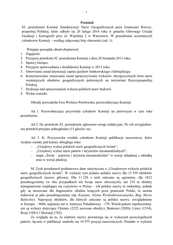 1 Protokół 83. posiedzenia Komisji Standaryzacji Nazw Geograficznych poza Granicami Rzeczypospolitej Polskiej, które odbyło się 26 lutego 2014 roku w gmachu Głównego Urzędu Geodezji i Kartografii przy ul. Wspólnej 2 w Warszawie. W posiedzeniu uczestniczyli członkowie Komisji według załączonej listy obecności (zał. 1). 1. 2. 3. 4. 5. 6. 7. 8. Wstępny porządek obrad obejmował: Zagajenie. Przyjęcie protokołu 82. posiedzenia Komisji z dnia 20 listopada 2013 roku. Sprawy bieżące. Przyjęcie sprawozdania z działalności Komisji w 2013 roku. Omówienie zasad latynizacji zapisu języków łemkowskiego i hebrajskiego. Kontynuowanie omawiania zasad opracowywania wykazów obcojęzycznych form nazw ważniejszych obiektów geograficznych położonych na terytorium Rzeczypospolitej Polskiej. Dyskusja nad opracowaniem wykazu polskich nazw budowli. Wolne wnioski. Obrady prowadziła Ewa Wolnicz-Pawłowska, przewodnicząca Komisji. Ad l. Przewodnicząca przywitała członków Komisji na pierwszym w tym roku posiedzeniu. Ad 2. Do protokołu 82. posiedzenia zgłoszono uwagi redakcyjne. Po ich uwzględnieniu protokół przyjęto jednogłośnie (15 głosów za). Ad 3. K. Przyszewska rozdała członkom Komisji publikacje nazewnicze, które wydane zostały pod koniec ubiegłego roku: – „Urzędowy wykaz polskich nazw geograficznych świata”; – „Urzędowy wykaz nazw państw i terytoriów niesamodzielnych”; – mapę „Świat – państwa i terytoria niesamodzielne” w wersji składanej z okładką oraz w wersji płaskiej. M. Zych przedstawił podstawowe dane statystyczne o „Urzędowym wykazie polskich nazw geograficznych świata”. W wykazie tym podano polskie nazwy dla 13 359 obiektów geograficznych (nazwy główne). Dla 11 328 z nich zalecane są egzonimy, dla 1812 pseudoegzonimy (w obu przypadkach nie licząc nazw obocznych), zaś 219 to obiekty transgraniczne znajdujące się częściowo w Polsce – ich polskie nazwy to endonimy, jednak gdy są stosowane dla fragmentów obiektu leżących poza granicami Polski, to można traktować je jako pseudoegzonimy (np. Karpaty, Nizina Wschodnioeuropejska, Bug, Morze Bałtyckie). Najwięcej obiektów, dla których zalecane są polskie nazwy, uwzględniono w Europie – 9646, najmniej zaś w Ameryce Południowej – 170. Wśród państw najobszerniejsze są wykazy dotyczące Ukrainy (2222 nazwane obiekty), Białorusi (2020), Litwy (1334), Rosji (1041) i Słowacji (782). Ze względu na to, że niektóre nazwy powtarzają się w wykazach poszczególnych państw, łącznie w publikacji znalazło się 14 975 pozycji nazewniczych. Ponadto w wykazie 2 uwzględniono 238 polskich nazw wariantowych (226 egzonimów, 8 pseudoegzonimów, 4 nazwy obiektów znajdujących się częściowo w Polsce), w tym w jednym przypadku podano dwie nazwy wariantowe dla jednego obiektu (Genezaret i Jezioro Galilejskie dla Jeziora Tyberiadzkiego), a także 254 formy nazw używane w stosunkach oficjalnych i formy długie nazwy (229 egzonimów, 25 pseudoegzonimów) stosowane głównie w odniesieniu do państw, terytoriów niesamodzielnych i jednostek administracyjnych. Oznacza to, że w wykazie podano łącznie 13 850 zalecanych polskich nazw. Uzupełnieniem ich jest 129 polskich nazw historycznych – podanych jednak wyłącznie w celach informacyjnych, przeważnie dla miejscowości, bez ich standaryzacji, czy formalnego zalecania. Liczba nazw głównych w tym: Część publikacji 1. Europa 2. Azja 3. Afryka 4. Ameryka Północna 5. Ameryka Południowa 6. Australia i Oceania 7. Antarktyka 8. Formy podmorskie Cały wykaz1 razem 9646 1579 710 462 170 243 322 355 13358 egzonimy 8172 1251 609 435 156 202 301 306 11326 pseudoegzonimy 1264 326 101 27 14 41 21 40 1813 obiekty częściowo w Polsce 210 2 0 0 0 0 0 9 219 Liczba nazw wariantowych 156 50 9 7 5 3 2 18 238 Liczba nazw oficjalnych2 86 62 51 19 14 19 3 0 254 Liczba polskich nazw geograficznych uwzględnionych w wykazie według poszczególnych części publikacji. 1 Wartość podana w wierszu „cały wykaz” nie jest sumą wartości podanych w wierszach dla poszczególnych części – nazwy niektórych obiektów wymienione są w kilku częściach publikacji. 2 Formy nazw używane w stosunkach oficjalnych i długie formy nazwy. Wykaz podzielony został na osiem części (rozdziałów): siedem z nich odpowiada poszczególnym częściom świata (Europie, Azji, Afryce, Ameryce Północnej, Ameryce Południowej, Australii i Oceanii, Antarktyce), ósma poświęcona została obiektom podmorskim. Nazwy obiektów geograficznych, w ramach poszczególnych wykazów państw i terytoriów zawartych w pierwszych siedmiu częściach wykazu, ułożono z podziałem na 59 kategorii. Najwięcej obiektów z polskimi nazwami znajduje się w kategorii „miejscowości” – 5238. Jest to 40% wszystkich obiektów uwzględnionych w tych siedmiu częściach (łącznie wymieniono w nich nazwy dla 13003 obiektów), a wielkość tej kategorii wynika głównie z uwzględnienia nazw licznych miejscowości z obszarów Białorusi (1624 nazwy miejscowości), Litwy (836 nazw) i Ukrainy (1468 nazw), a zwłaszcza z terenów tych państw, które do II wojny światowej znajdywały się w granicach Polski – nazwy miejscowości z obszaru tych trzech państw stanowią 75% uwzględnionych w wykazie nazw miejscowości. Innymi najliczniejszymi kategoriami są: jednostki administracyjne z 1669 obiektami, rzeki – 667 nazw oraz góry (pasma, łańcuchy, itp.) – 592 nazwy. Obiektów wodnych (hydronimów) uwzględniono łącznie 1757 w 16 kategoriach, a obiektów ukształtowania terenu (oronimów) – 2480 w 21 kategoriach. W części ósmej, dotyczącej obiektów podmorskich, podano polskie nazwy dla 355 obiektów, a ułożono je z podziałem na 14 kategorii. Szczegółowe omówienie tego wydawnictwa zostanie opublikowane na łamach „Polskiego Przeglądu Kartograficznego”. 3 Wszelkie zmiany w polskich nazwach geograficznych zawartych w wykazie 