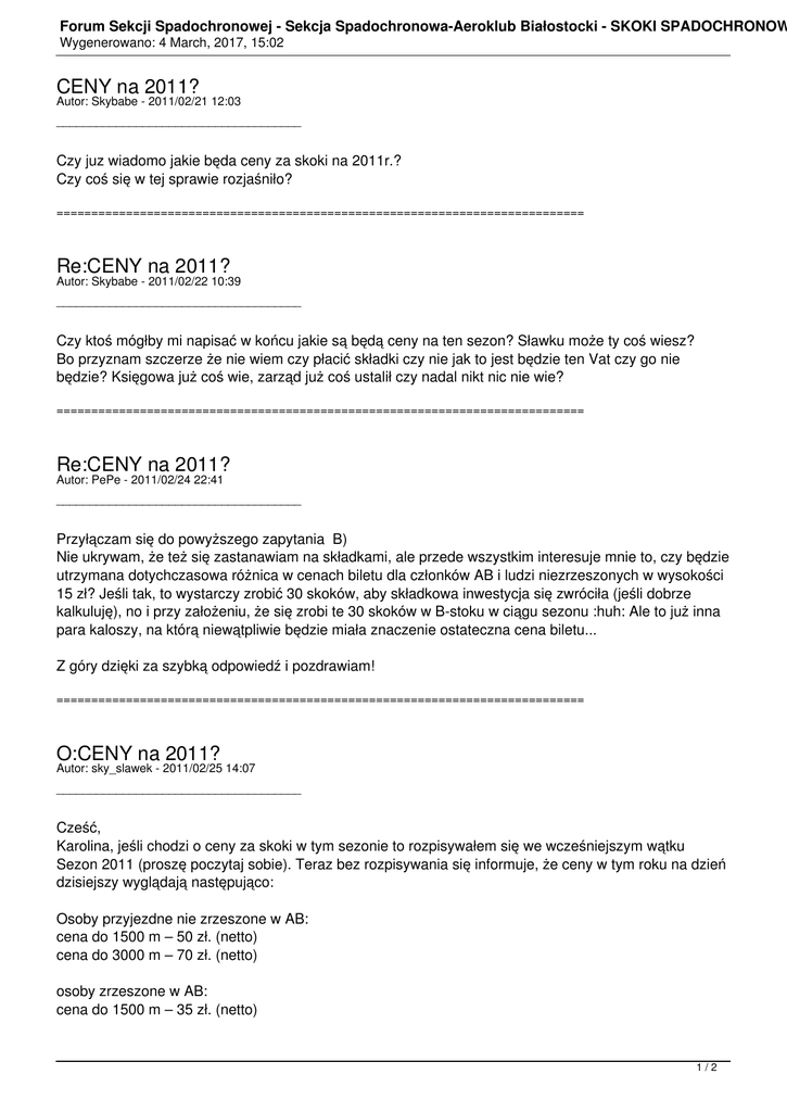 Forum Sekcji Spadochronowej - Sekcja Spadochronowa-Aeroklub Białostocki - SKOKI SPADOCHRONOW Wygenerowano: 4 March, 2017, 15:02 CENY na 2011? Autor: Skybabe - 2011/02/21 12:03 _____________________________________ Czy juz wiadomo jakie będa ceny za skoki na 2011r.? Czy coś się w tej sprawie rozjaśniło? ============================================================================ Re:CENY na 2011? Autor: Skybabe - 2011/02/22 10:39 _____________________________________ Czy ktoś mógłby mi napisać w końcu jakie są będą ceny na ten sezon? Sławku może ty coś wiesz? Bo przyznam szczerze że nie wiem czy płacić składki czy nie jak to jest będzie ten Vat czy go nie będzie? Księgowa już coś wie, zarząd już coś ustalił czy nadal nikt nic nie wie? ============================================================================ Re:CENY na 2011? Autor: PePe - 2011/02/24 22:41 _____________________________________ Przyłączam się do powyższego zapytania B) Nie ukrywam, że też się zastanawiam na składkami, ale przede wszystkim interesuje mnie to, czy będzie utrzymana dotychczasowa różnica w cenach biletu dla członków AB i ludzi niezrzeszonych w wysokości 15 zł? Jeśli tak, to wystarczy zrobić 30 skoków, aby składkowa inwestycja się zwróciła (jeśli dobrze kalkuluję), no i przy założeniu, że się zrobi te 30 skoków w B-stoku w ciągu sezonu :huh: Ale to już inna para kaloszy, na którą niewątpliwie będzie miała znaczenie ostateczna cena biletu... Z góry dzięki za szybką odpowiedź i pozdrawiam! ============================================================================ O:CENY na 2011? Autor: sky_slawek - 2011/02/25 14:07 _____________________________________ Cześć, Karolina, jeśli chodzi o ceny za skoki w tym sezonie to rozpisywałem się we wcześniejszym wątku Sezon 2011 (proszę poczytaj sobie). Teraz bez rozpisywania się informuje, że ceny w tym roku na dzień dzisiejszy wyglądają następująco: Osoby przyjezdne nie zrzeszone w AB: cena do 1500 m – 50 zł. (netto) cena do 3000 m – 70 zł. (netto) osoby zrzeszone w AB: cena do 1500 m – 35 zł. (netto) 1/2 Forum Sekcji Spadochronowej - Sekcja Spadochronowa-Aeroklub Białostocki - SKOKI SPADOCHRONOW Wygenerowano: 4 March, 2017, 15:02 cena do 3000 m – 55 zł. (netto) Także ostateczna decyzja o cenie zapadnie po wpłynięciu wyjaśnienia z podległego nam US (kiedy nie wiem) oraz decyzji Zarządu AB. Zarząd zbiera się w następnym tygodniu, może wtedy już będzie coś wiadomo. Czy cena będzie tylko netto czy netto +VAT ???? Na dzień dzisiejszy tyle wiem. Co do składek członkowskich czy płacić czy nie płacić to decyzję pozostawiam Wam samym. Ja składki członkowskie płacę już od ponad 20-tu lat i nigdy nie miałem z tym problemów, teraz też zapłaciłem. Co do kalkulacji czy opłaca się czy nie również oceńcie sami w końcu tak naprawdę częstotliwość waszych skoków na tutejszym lotnisku zależy od was. W tym sezonie będzie funkcjonować kalendarz skoków co ułatwi planowanie waszych skoków. To tyle. Pozdrawiam ciepło. Sławek ============================================================================ Re:O:CENY na 2011? Autor: Skybabe - 2011/02/25 14:39 _____________________________________ Dzięki Sławku za informację :) Miałam problem z odnalezieniem tej dyskusji o cenach. Mimo wszystko nadal czekam niecierpliwie na informację co z tym Vatem. Czy będzie czy nam odpuszczą? :P :) ============================================================================ Re:O:CENY na 2011? Autor: CezarSky - 2011/03/07 09:19 _____________________________________ Może wątek nieco przedawniony ale co do VAT dość ciekawy artykuł dotyczący szkoleń w paralotniarstwie a podatku VAT. http://blogi.lotniczapolska.pl/read.php?3,152,152 Przy okazji pytanie: czy coś już wiadomo co do opinii Urzędu Skarbowego w Białymstoku ? ============================================================================ 2/2