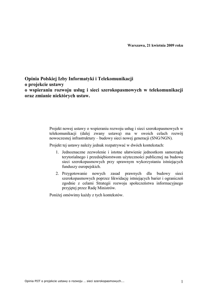 Warszawa, 21 kwietnia 2009 roku Opinia Polskiej Izby Informatyki i Telekomunikacji o projekcie ustawy o wspieraniu rozwoju usług i sieci szerokopasmowych w telekomunikacji oraz zmianie niektórych ustaw. Projekt nowej ustawy o wspieraniu rozwoju usług i sieci szerokopasmowych w telekomunikacji (dalej zwany ustawą) ma w swoich celach rozwój nowoczesnej infrastruktury – budowy sieci nowej generacji (SNG/NGN). Projekt tej ustawy należy jednak rozpatrywać w dwóch kontekstach: 1. Jednoznaczne zezwolenie i istotne ułatwienie jednostkom samorządu terytorialnego i przedsiębiorstwom użyteczności publicznej na budowę sieci szerokopasmowych przy sprawnym wykorzystaniu istniejących funduszy europejskich. 2. Przygotowanie nowych zasad prawnych dla budowy sieci szerokopasmowych poprzez likwidację istniejących barier i ograniczeń zgodnie z celami Strategii rozwoju społeczeństwa informacyjnego przyjętej przez Radę Ministrów. Poniżej omówimy każdy z tych kontekstów. Opinia PIIT o projekcie ustawy o rozwoju … sieci szerokopasmowych…. 1 1. Budowa sieci szerokopasmowych przez samorządy. Nie negujemy potrzeby pilnego uruchomienia projektów budowy sieci szerokopasmowych z wykorzystaniem funduszy europejskich, które są obecnie przyznane Polsce. Jest to rzeczywiście ogromna szansa na przyśpieszenie rozwoju dostępu do Internetu oraz jego upowszechnienie, szczególnie w regionach mniej dotychczas rozwiniętych. W takim jednak przypadku wpisywanie do tej ustawy – powiedzmy praw „ozdobników” dotyczących przedsiębiorstw telekomunikacyjnych sektora prywatnego mija się z celem. Już bowiem w Art.3 ust.2. pkt c) stwierdzenie że jednostki samorządu terytorialnego mogą budować i eksploatować infrastrukturę i sieci telekomunikacyjnego „w sposób niezakłócający rozwoju równoprawnej i skutecznej konkurencji na rynkach telekomunikacyjnych” jest zapisem mało precyzyjnym i niejednoznacznym. Podobnie jest z następnymi punktami, kiedy to samorząd może w pełni zaspokajać potrzeby obywateli – na preferencyjnych warunkach. W pozostałej części ustawy – a szczególnie w art. 25-36 wszystkie istotne ułatwienia do budowy sieci szerokopasmowych dotyczą praktycznie tylko sieci regionalnych, a więc budowanych przez samorządy terytorialne. Niestety niektóre zapisy Ustawy budzą wątpliwości co do celów jakie stawia sobie regulator rynku, w tym w szczególności co do wizji jego przyszłego rozwoju. Zbyt duży nacisk został położony na budowę infrastruktury przez samorządy, a zbyt mały na stworzenie ułatwień dla operatorów telekomunikacyjnych. Co więcej, Ustawa wyraźnie dyskryminuje operatorów sieci ruchomych ze względu na fakt, iż przewiduje ona zwiększenie obciążeń regulacyjnych w stosunku do tych operatorów. Filozofa ustawy, ograniczająca rolę sektora prywatnego, jak i jego swobodę działania, stoi w sprzeczności z zasadami promowania wolnej konkurencji, która przyświeca organom regulacyjnych wszystkich krajów UE. Może też efektywnie ograniczyć szybkie powstanie sieci NGN/A w Polsce. W takim to przypadku Art.17 jest zbędny, gdyż praktycznie niczego nie zapewnia operatorom sektora prywatnego, szczególnie, że decyzja Regulatora o zwolnieniu z udostępnienia swojej nowej sieci przez danego inwestora innym operatorom może być podważona przez Komisję Europejską. W tym kontekście, nie negując znaczenia tej ustawy dla sprawnego wykorzystania środków europejskich warto jednak dokonać w gronie ekspertów rzetelnej analizy skutków tej ustawy na przyszłą organizację, konkurencyjność i rozwój rynku teleinformatycznego w Polsce. Analizy tej należy dokonać szczególnie dla przypadków wskazanych w Art.10 ustawy, gdy samorządy nie będą w stanie dalej eksploatować wybudowanej sieci i będą mogły ją przekazać lub powierzyć (nie wiadomo dokładnie, na jakich warunkach) przedsiębiorstwom telekomunikacyjnym. Inaczej mówiąc wybudowana za społeczne środki infrastruktura telekomunikacyjna będzie mogła być sprywatyzowana. W analizie tej konieczne jest też sprawdzenie, na ile budowa regionalnych sieci teleinformatycznych na preferencyjnych warunkach zakłóci możliwości budowy i rozwój sieci prywatnych operatorów telekomunikacyjnych. Opinia PIIT o projekcie ustawy o rozwoju … sieci szerokopasmowych…. 2 2. Budowa sieci szerokopasmowych przez różne podmioty. W tym przypadku Ustawa w pierwszym rzędzie powinna zrównać w prawach sieci telekomunikacyjne z sieciami wodociągowymi, energetycznymi, gazowymi, wodnymi i kanalizacyjnymi, a także określić je jako sieci pożytku publicznego. Przyjęcie takich zasad umożliwi skorzystanie z już istniejących rozwiązań prawnych bez potrzeby tworzenia wielu nowych – często mało przejrzystych rozwiązań – jak na przykład uzyskiwania zgody dotyczącej skorzystania z nieruchomości u regulatora zamiast u starosty. W tym kontekście nie ma żadnego uzasadnienia dla faworyzowania inwestycji samorządowych w stosunku do inwestycji operatorów komercyjnych (patrz art. 25-36). W efekcie konieczne jest poszerzenie definicji regionalnej sieci szerokopasmowej (art. 2 p. 1) o inwestycje realizowane przez operatorów komercyjnych, dzięki czemu nastąpi zrównanie w prawach wszystkich podmiotów komercyjnych i samorządowych: Art. 2. 1. Użyte w ustawie określenia oznaczają: 1) regionalna sieć szerokopasmowa – sieć telekomunikacyjna realizowana przez samorząd województwa na podstawie projektów indywidualnych w ramach programów operacyjnych na lata 2007-2013 oraz przez przedsiębiorców telekomunikacyjnych realizujących inwestycje na obszarze poszczególnych województw. Propozycja zapisu z art. 17 o możliwości zwolnienia operatora ze świadczenia hurtowych usług szerokopasmowej transmisji danych na liniach światłowodowych jest, w naszej opinii, nie w pełni dostosowana do warunków polskiego rynku telekomunikacyjnego oraz rodzi poważne wątpliwośc