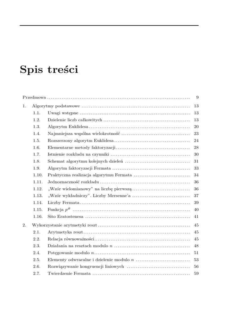 Spis treści Przedmowa . . . . . . . . . . . . . . . . . . . . . . . . . . . . . . . . . . . . . . . . . . . . . . . . . . . . . . . . . . . . . . . . . . . . . . . . . . . . . . . 1. 2. 9 Algorytmy podstawowe . . . . . . . . . . . . . . . . . . . . . . . . . . . . . . . . . . . . . . . . . . . . . . . . . . . . . . . . . . . . 13 1.1. Uwagi wstępne . . . . . . . . . . . . . . . . . . . . . . . . . . . . . . . . . . . . . . . . . . . . . . . . . . . . . . . . . . . . . 13 1.2. Dzielenie liczb całkowitych . . . . . . . . . . . . . . . . . . . . . . . . . . . . . . . . . . . . . . . . . . . . . . . . 13 1.3. Algorytm Euklidesa .. . . . . . . . . . . . . . . . . . . . . . . . . . . . . . . . . . . . . . . . . . . . . . . . . . . . . . . 20 1.4. Najmniejsza wspólna wielokrotność . . . . . . . . . . . . . . . . . . . . . . . . . . . . . . . . . . . . . . 23 1.5. Rozszerzony algorytm Euklidesa .. . . . . . . . . . . . . . . . . . . . . . . . . . . . . . . . . . . . . . . . . 24 1.6. Elementarne metody faktoryzacji .. . . . . . . . . . . . . . . . . . . . . . . . . . . . . . . . . . . . . . . . 28 1.7. Istnienie rozkładu na czynniki . . . . . . . . . . . . . . . . . . . . . . . . . . . . . . . . . . . . . . . . . . . . 30 1.8. Schemat algorytmu kolejnych dzieleń . . . . . . . . . . . . . . . . . . . . . . . . . . . . . . . . . . . . 31 1.9. Algorytm faktoryzacji Fermata . . . . . . . . . . . . . . . . . . . . . . . . . . . . . . . . . . . . . . . . . . . 33 1.10. Praktyczna realizacja algorytmu Fermata . . . . . . . . . . . . . . . . . . . . . . . . . . . . . . . 34 1.11. Jednoznaczność rozkładu .. . . . . . . . . . . . . . . . . . . . . . . . . . . . . . . . . . . . . . . . . . . . . . . . . 36 1.12. „Wzór wielomianowy” na liczbę pierwszą .. . . . . . . . . . . . . . . . . . . . . . . . . . . . . . . 36 1.13. „Wzór wykładniczy”. Liczby Mersenne’a . . . . . . . . . . . . . . . . . . . . . . . . . . . . . . . . 37 1.14. Liczby Fermata . . . . . . . . . . . . . . . . . . . . . . . . . . . . . . . . . . . . . . . . . . . . . . . . . . . . . . . . . . . . . 39 1.15. Funkcja p# . . . . . . . . . . . . . . . . . . . . . . . . . . . . . . . . . . . . . . . . . . . . . . . . . . . . . . . . . . . . . . . . . 40 1.16. Sito Eratostenesa . . . . . . . . . . . . . . . . . . . . . . . . . . . . . . . . . . . . . . . . . . . . . . . . . . . . . . . . . . 41 Wykorzystanie arytmetyki reszt . . . . . . . . . . . . . . . . . . . . . . . . . . . . . . . . . . . . . . . . . . . . . . . . . . . 45 2.1. Arytmetyka reszt. . . . . . . . . . . . . . . . . . . . . . . . . . . . . . . . . . . . . . . . . . . . . . . . . . . . . . . . . . . 45 2.2. Relacja równoważności.. . . . . . . . . . . . . . . . . . . . . . . . . . . . . . . . . . . . . . . . . . . . . . . . . . . . 45 2.3. Działania na resztach modulo n . . . . . . . . . . . . . . . . . . . . . . . . . . . . . . . . . . . . . . . . . . 48 2.4. Potęgowanie modulo n. . . . . . . . . . . . . . . . . . . . . . . . . . . . . . . . . . . . . . . . . . . . . . . . . . . . . 51 2.5. Elementy odwracalne i dzielenie modulo n . . . . . . . . . . . . . . . . . . . . . . . . . . . . . . 53 2.6. Rozwiązywanie kongruencji liniowych . . . . . . . . . . . . . . . . . . . . . . . . . . . . . . . . . . . 56 2.7. Twierdzenie Fermata . . . . . . . . . . . . . . . . . . . . . . . . . . . . . . . . . . . . . . . . . . . . . . . . . . . . . . 59 4 Spis treści 2.8. Liczby pseudopierwsze .. . . . . . . . . . . . . . . . . . . . . . . . . . . . . . . . . . . . . . . . . . . . . . . . . . . . 62 2.9. Test Millera-Rabina .. . . . . . . . . . . . . . . . . . . . . . . . . . . . . . . . . . . . . . . . . . . . . . . . . . . . . . . 71 3. Układy kongruencji . . . . . . . . . . . . . . . . . . . . . . . . . . . . . . . . . . . . . . . . . . . . . . . . . . . . . . . . . . . . . . . . . . 77 3.1. Układy równań (mod n) . . . . . . . . . . . . . . . . . . . . . . . . . . . . . . . . . . . . . . . . . . . . . . . . . . . 77 3.2. Chińskie twierdzenie o resztach .. . . . . . . . . . . . . . . . . . . . . . . . . . . . . . . . . . . . . . . . . . 78 3.3. Interpretacja geometryczna . . . . . . . . . . . . . . . . . . . . . . . . . . . . . . . . . . . . . . . . . . . . . . . 80 3.4. Chińskie twierdzenie o resztach. Przypadek ogólny . . . . . . . . . . . . . . . . . . . . . 81 3.5. Przypadek wielu kongruencji .. . . . . . . . . . . . . . . . . . . . . . . . . . . . . . . . . . . . . . . . . . . . . 83 3.6. Wykorzystanie CRT . . . . . . . . . . . . . . . . . . . . . . . . . . . . . . . . . . . . . . . . . . . . . . . . . . . . . . . 83 4. Permutacje, symetrie, grupy .. . . . . . . . . . . . . . . . . . . . . . . . . . . . . . . . . . . . . . . . . . . . . . . . . . . . . . . 85 4.1. Permutacje . . . . . . . . . . . . . . . . . . . . . . . . . . . . . . . . . . . . . . . . . . . . . . . . . . . . . . . . . . . . . . . . . 85 4.2. Rozkład na cykle . . . . . . . . . . . . . . . . . . . . . . . . . . . . . . . . . . . . . . . . . . . . . . . . . . . . . . . . . . . 88 4.3. Definicja grupy . . . . . . . . . . . . . . . . . . . . . . . . . . . . . . . . . . . . . . . . . . . . . . . . . . . . . . . . . . . . . 90 4.4. Przykłady grup.. . . . . . . . . . . . . . . . . . . . . . . . . . . . . . . . . . . . . . . . . . . . . . . . . . . . . . . . . . . . 91 4.5. Grupa Z∗n i funkcja Eulera ϕ(n) . . . . . . . . . . . . . . . . . . . . . . . . . . . . . . . . . . . . . . . . . . 92 4.6. Własności funkcji Eulera . . . . . . . . . . . . . . . . . . . . . . . . . . . . . . . . . . . . . . . . . . . . . . . . . . 93 4.7. Symetrie trójkąta . . . . . . . . . . . . . . . . . . . . . . . . . . . . . . . . . . . . . . . . . . . . . . . . . . . . . . . . . . 96 4.8. Grupa symetrii kwadratu i pięciokąta foremnego. . . . . . . . . . . . . . . . . . . . . . . . 97 4.9. Podgrupy . . . . . . . . . . . . . . . . . . . . . . . . . . . . . . . . . . . . . . . . . . . . . . . . . . . . . . 