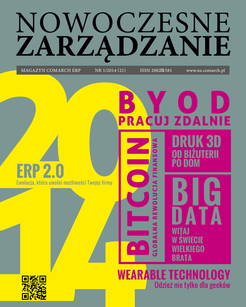NOWOCZESNE ZARZĄDZANIE MAGAZYN COMARCH ERP NR 1/2014 (21) ISSN 2082-1581 www.nz.comarch.pl Ewolucja, która uwolni możliwości Twojej firmy GLOBALNA REWOLUCJA FINANSOWA ERP 2.0 BITCOIN B Y O D PRACUJ ZDALNIE DRUK 3D OD BIŻUTERII PO DOM BIG DATA WITAJ W ŚWIECIE WIELKIEGO BRATA WEARABLE TECHNOLOGY Odzież nie tylko dla geeków W NUMERZE 5 SPIS TREŚCI 3 Od redakcji 4 Aktualności z rynku 8 TEMAT NUMERU 5 Ewolucja w stronę ERP 2.0 8 W świecie Wielkiego Brata 10 BYOD 14 Wymagający, poinformowany, najważniejszy NOWE ROZWIĄZANIA WIEDZA 44 A czy Ty wiesz, skąd przyszedł Twój klient? 46 Wizualność sprzedażowa 48 Skąd ten trend? 49 Zaszufladkowani 17 Bitcoin – globalna rewolucja finansowa 50 e-klucz do rozwoju 20 Serce, dom i zaczarowany ołówek 52 Law in Brief 22 Odzież nie tylko dla geeków 55 Facebook zmusza biznes do wysiłku 25 Oszczędzaj na wydruku i wysyłce korespondencji 56 Skuteczny e-mail marketing od podstaw 26 Inspektor Gadżet 14 20 RYNEK 28 Wizja przyszłości 36 Co nas czeka w 2014? 37 Dokąd zmierza e-commerce? 40 Co z perspektywą 2014? Czyli o nowym budżecie Unii Europejskiej na innowacje w MSP 42 5 powodów, dla których warto wybrać biuro rachunkowe 17 56 55 40 Magazyn Comarch ERP nr 1/2014 (21) ISSN 2082-1581 Redaktor naczelny: Łukasz Majewski Redakcja: Magdalena Grochala Agnieszka Kozłowska Projekt, skład i grafiki: Adam Dąbrowski Współpraca: Blanka Seweryn – fotograf Piotr Stopa – fotograf Wydawca: Comarch SA Al. Jana Pawła II 39a 31-864 Kraków tel.: 12 64 61 000 www.comarch.pl Kontakt dla Czytelników: [email protected] www.nz.comarch.pl Podyskutuj z nami na www.FB.com/ComarchERP Reklama: [email protected] Nakład: 2000 egz. NOWOCZESNE ZARZĄDZANIE jest wydawnictwem bezpłatnym dostępnym w subskrypcji. Artykuły publikowane w niniejszym wydawnictwie mogą być kopiowane i przedrukowywane za wiedzą i zgodą redakcji. Nazwy produktów i firm wymienione w niniejszym wydawnictwie są znakami handlowymi i nazwami towarowymi odpowiednich producentów. Redakcja nie odpowiada za treści zamieszczonych materiałów reklamowych. Redakcja zastrzega sobie prawo do redagowania i skracania tekstów. OD REDAKCJI Na pokładzie Enterprise musiał być chłopiec z zaczarowanym ołówkiem. Przechadzać się pod rękę z Kirkiem i Spockiem, rysując dla nich gadżety, z których korzystali. Dlaczego? Bo wiele z tych nowinek technologicznych, wydawałoby się – należących do kategorii science fiction, zmaterializowało się w ostatnich latach. Kto wie, czy Piotrek, bohater kreskówki, nie maczał w tym palców! Mało tego. Rzeczywistość przerosła futurystyczne wizje rodem ze „Star Treka”. Dziś możemy podłączyć do Internetu właściwie każdy element naszego ubioru, który będzie na bieżąco odczytywał i analizował nie tylko nasze funkcje życiowe, ale też emocje. Jeszcze chwila i nie będziemy musieli po te ubrania wychodzić do sklepów – wszystko wydrukujemy na drukarkach 3D w naszych również wydrukowanych domach, przegryzając czekoladę też oczywiście z maszyny 3D. I płacąc bitcoinami. Co na to biznes? Każdy przedsiębiorca na pewno ucieszy się z tego, że pasujący do garnituru krawat będzie mógł szybko wyprodukować w zaciszu własnego domu, pijąc poranną kawę. Ale czy to jedyne udogodnienie, którego może spodziewać się w 2014 roku? Nie! Ten rok przyniesie mu także dostęp do niezwykłej ilości danych, które błyskawicznie analizowane będą w stanie przenieść go w inny wymiar biznesu. W wymiar, w którym rządzi chmura, mobilność i efektywność. Jak widać, w rysowaniu i obrazkach jest coś magicznego, dlatego i my postanowiliśmy zabawić się w Piotrków z ołówkami i przygotowaliśmy dla Państwa wiele infografik, które – mamy nadzieję – przybliżą zagadnienia omawiane w tym numerze „Nowoczesnego Zarządzania”. A ponieważ i świat „Star Treka” nie jest nam obcy, przenieśliśmy nasz magazyn również do wirtualnej czytelni. Dziś mogą Państwo przeczytać artykuły naszych ekspertów na swoich smartfonach. Wystarczy skorzystać z naszej nowej aplikacji dostępnej obecnie w sklepie Google Play, a już niedługo w App Storze. Mamy nadzieję, że lektura niniejszego wydania „Nowoczesnego Zarządzania” przekona Państwa, że w biznesie – jak i w rozwoju wspierających go technologii – wszystko jest możliwe, a każdy przedsiębiorca powinien kierować się mottem znanym ze „Star Treka”: „Śmiało kroczyć tam, gdzie nie dotarł jeszcze żaden człowiek”. Chłopiec z zaczarowanym ołówkiem wciąż przechadza się wśród nas. Co rysuje? Przekonamy się niebawem! Zapraszamy do lektury! Redakcja Pobierz „Nowoczesne Zarządzanie” na swój telefon 3 AKTUALNOŚCI Z RYNKU COMARCH PO RAZ KOLEJNY ZBADAŁ POZIOM SATYSFAKCJI PRZEDSIĘBIORCÓW KORZYSTAJĄCYCH Z RÓŻNYCH SYSTEMÓW DO ZARZĄDZANIA DLA FIRM, PRODUKOWANYCH PRZEZ KRAKOWSKĄ SPÓŁKĘ IT. 91 proc. klientów pozytywnie ocenia systemy Comarch ERP Ponad 91 proc. użytkowników systemów Comarch ERP pozytywnie oceniło posiadany program. 81 proc. poleciłoby swój system innym firmom. Jest to najwyższa ocena w historii Badań Satysfakcji Klientów. Głównymi czynnikami, wskazywanymi przez klientów jako kluczowe dla osiągnięcia satysfakcji wynikającej z pracy na systemach Comarch ERP, są ich zgodność z przepisami, łatwość obsługi oraz bogata funkcjonalność. Firmy korzystające z systemów Comarch ERP w chmurze wysoko cenią sobie swobodę, jaką daje mobilność, oraz komfort gwarantowany przez zdalne dostosowanie oprogramowania do zmieniających się przepisów. Badania Satysfakcji Klientów zostały przeprowadzone w okresie 16.07-30.08.2013 r. na reprezentatywnej grupie 1757 przedsiębiorstw używających systemów Comarch ERP. W COMARCH ERP XL 2014 POŁOŻONO NAJWIĘKSZY NACISK NA ROZWÓJ ROZWIĄZAŃ DLA FIRM PRODUKCYJNYCH. JEST TO BEZPOŚREDNIA ODPOWIEDŹ NA POTRZEBY POLSKIEGO RYNKU. ZGODNIE Z DANYMI
