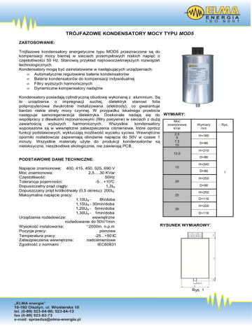 TRÓJFAZOWE KONDENSATORY MOCY TYPU MOD5 ZASTOSOWANIE: Trójfazowe kondensatory energetyczne typu MOD5 przeznaczone są do kompensacji mocy biernej w sieciach przemysłowych niskich napięć o częstotliwości 50 Hz. Stanowią przykład najnowocześniejszych rozwiązań technologicznych. Kondensatory mogą być zainstalowane w następujących urządzeniach: • Automatycznie regulowane baterie kondensatorów • Baterie kondensatorów do kompensacji indywidualnej • Filtry wyŜszych harmonicznych • Dynamiczne kompensatory nadąŜne Kondensatory posiadają cylindryczną obudowę wykonaną z aluminium. Są to urządzenia o impregnacji suchej, dielektryk stanowi folia polipropylenowa dwukrotnie metalizowana (elektrody), co gwarantuje bardzo niskie straty mocy czynnej. W przypadku lokalnego przebicia następuje samoregeneracja dielektryka. Doskonale nadają się do WYMIARY: współpracy z dławikami rezonansowymi (filtry pasywne) w sieciach z duŜą Moc zawartością wyŜszych harmonicznych. Wszystkie kondensatory znamionowa kVar wyposaŜone są w wewnętrzne zabezpieczenia ciśnieniowe, które oprócz funkcji podstawowych, wykluczają moŜliwość wycieku syciwa. Wewnętrzne 2,5 oporniki rozładowcze zapewniają obniŜenie napięcia do 50V w czasie 1 5 7,5 minuty. Wszystkie materiały uŜyte do produkcji kondensatorów są 10 nietoksyczne, nieszkodliwe ekologicznie, nie zawierają PCB. Wymiary mm Rys. H=180 D=86 H=210 12,5 D=86 PODSTAWOWE DANE TECHNICZNE: H=240 Napięcie znamionowe: 400, 415, 450, 525, 690 V Moc znamionowa: 2,5….30 KVar Częstotliwość: 50Hz Tolerancja pojemności: -5…+10°C Dopuszczalny prąd ciągły: 1,3IN Dopuszczany prąd krótkotrwały (0,5 okresu): 200IN Maksymalne napięcie pracy: 1,10UN 8h/doba 1,15UN - 30min/doba 1,20UN - 5min/doba 1,30UN - 1min/doba Urządzenia rozładowcze: wewnętrzne rozładowanie do 50V/1min Wysokość instalowania: ≤2000m. n.p.m Pozycja pracy: pionowa Temperatura pracy: -25...+50°C Zabezpieczenia wewnętrzne: nadciśnieniowe Zgodność z normami : IEC60831 15 D=86 H=250 20 D=96 25 H=250 D=116 H=250 30 D=116 RYSUNEK WYMIAROWY: Rys. 1 1