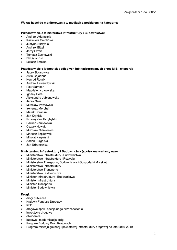 Załącznik nr 1 do SOPZ Wykaz haseł do monitorowania w mediach z podziałem na kategorie: Przedstawiciele Ministerstwa Infrastruktury i Budownictwa: Andrzej Adamczyk Kazimierz Smoliński Justyna Skrzydło Andrzej Bittel Jerzy Szmit Tomasz Żuchowski Elżbieta Kisil Łukasz Smółka Przedstawiciele jednostek podległych lub nadzorowanych przez MIB i eksperci: Jacek Bojarowicz Alvin Gajadhur Konrad Romik Andrzej Lewandowski Piotr Samson Magdalena Jaworska Ignacy Góra Aleksandra Jabłonowska Jacek Szer Mirosław Pawłowski Ireneusz Merchel Marek Chraniuk Jan Krynicki Przemysław Przybylski Paulina Jankowska Cezary Nowak Mirosław Siemieniec Mariusz Szpikowski Mikołaj Karpiński Adrian Furgalski Jan Urbanowicz Ministerstwo Infrastruktury i Budownictwa (spotykane warianty nazw): Ministerstwo Infrastruktury i Budownictwa Ministerstwo Infrastruktury i Rozwoju Ministerstwo Transportu, Budownictwa i Gospodarki Morskiej Ministerstwo Infrastruktury Ministerstwo Transportu Ministerstwo Budownictwa Minister Infrastruktury i Budownictwa Minister Infrastruktury Minister Transportu Minister Budownictwa Drogi: drogi publiczne Krajowy Fundusz Drogowy KFD drogowe spółki specjalnego przeznaczenia inwestycje drogowe obwodnica budowa i modernizacja dróg Program Budowy Dróg Krajowych Program rozwoju gminnej i powiatowej infrastruktury drogowej na lata 2016-2019 1 Załącznik nr 1 do SOPZ węzeł drogowy autostrady: A1, A2, A4, A6, A18 drogi ekspresowe: S1, S2, S3, S5, S6, S7, S8, S10, S11, S12, S14, S17, S19, S22, S51, S69, S74, S79 drogi krajowe Generalna Dyrekcja Dróg Krajowych i Autostrad GDDKIA elektroniczny system poboru opłat ViaToll Ustawa o drogach publicznych Via Carpatia Via Carpathia Via Baltica Transport drogowy: Centrum Automatycznego Nadzoru nad Ruchem Drogowym CANARD Fotoradary czas pracy kierowców przewozy drogowe towarów niebezpiecznych ADR tachografy Ustawa Prawo o ruchu drogowym Ustawa Prawo przewozowe międzynarodowe przewozy drogowe bezpieczeństwo ruchu drogowego uprawnienia do prowadzenia pojazdów prawo jazdy baza pytań na prawo jazdy Ustawa o kierujących pojazdami Ustawa o transporcie drogowym Główny Inspektor Transportu Drogowego GITD ITD Instytut Transportu Samochodowego ITS Zrzeszenie Międzynarodowych Przewoźników Drogowych ZMPD Krajowa Rada Bezpieczeństwa Ruchu Drogowego KRBRD Transportowy Dozór Techniczny TDT Homologacja pojazdów Przewoźnicy MiLoG Loi Macron Transport kolejowy: Fundusz Kolejowy finansowanie infrastruktury kolejowej międzynarodowy transport kolejowy Państwowa Komisja Badania Wypadków Kolejowych PKBWK Urząd Transportu Kolejowego UTK Grupa PKP PKP S.A. 2 Załącznik nr 1 do SOPZ PKP Cargo PKP Intercity PKP Polskie Linie Kolejowe PKP PLK PKP Telekomunikacja Kolejowa PKP Energetyka PKP Informatyka Przewozy Regionalne Przewozy intermodalne Tiry na tory Centrum Komunikacji i Techniki Koleje Dużych Prędkości KDP Służba Ochrony Kolei SOK Modernizacja linii kolejowych Dworce kolejowe Europejski system zarządzania ruchem kolejowym ERTMS Wieloletni Program Inwestycji Kolejowych WPIK Narodowy plan wdrażania europejskiego systemu zarządzania ruchem kolejowym Innowacyjny Dworzec Systemowy IDS Pendolino ED250 Kolejowe przewozy transgraniczne Master Plan dla transportu kolejowego w Polsce do 2030 roku Krajowy Program Kolejowy KPK Rail Baltica Transport lotniczy: bezpieczeństwo lotów; port lotniczy prawa pasażera rozwój sieci lotnisk i lotniczych urządzeń naziemnych inwestycje lotnicze Państwowa Komisja Badania Wypadków Lotniczych PKBWL Urząd Lotnictwa Cywilnego ULC Przedsiębiorstwo Państwowe "Porty Lotnicze" PPL Polska Agencja Żeglugi Powietrznej PAŻP Centralny Port Lotniczy CPL Ustawa Prawo lotnicze komercjalizacja PPL certyfikat lotniska cywilnego Bałtycki Funkcjonalny Blok Przestrzeni Powietrznej FAB Rada Ochrony i Ułatwień Lotnictwa Cywilnego Organizacja Międzynarodowego Lotnictwa Cywilnego ICAO Europejska Organizacja ds. Bezpieczeństwa Żeglugi Powietrznej EUROCONTROL Europejska Konfederacja Lotnictwa Cywilnego 3 Załącznik nr 1 do SOPZ ECAC Polski Holding Lotniczy PHL Międzynarodowe Zrzeszenie Przewoźników Powietrznych IATA Drony European Aviation Safety Agency EASA Budownictwo: gospodarka nieruchomościami rzeczoznawca majątkowy ustawa Prawo budowlane ustawa o wyrobach budowlanych ustawa o charakterystyce energetycznej budynków; świadectwa charakterystyki energetycznej budynku; rozporządzenie w sprawie warunków technicznych, jakim powinny odpowiadać budynki i ich usytuowanie gospodarka komunalna utrzymanie czystości i porządku w gminach ustawa o zbiorowym zaopatrzeniu w wodę i zbiorowym odprowadzaniu ścieków Indywidualne Konta Mieszkaniowe Narodowy Program Mieszkaniowy program Mieszkanie Plus program „Rodzina na swoim” program „Mieszkanie dla Młodych” najem okazjonalny Fundusz Mieszkań na Wynajem mieszkania zakładowe mieszkania komunalne mieszkania socjalne pomieszczenia tymczasowe budowa noclegowni i domów dla bezdomnych Towarzystwa Budownictwa Społecznego TBS program termomodernizacji i remontów Główny Inspektor Nadzoru Budowlanego GINB Główny Urząd Nadzoru Budowlanego GUNB Komisja Kodyfikacyjna Prawa Budowlanego Ustawa o ochronie praw lokatorów Ustawa o rodzinnych ogrodach działkowych Kodeks budowlany; Kodeks urbanistyczno-budowlany Ustawa o spółdzielniach mieszkaniowych Ustawa o wzmocnieniu narzędzi ochrony krajobrazu (ustawa krajobrazowa) wspólnota mieszkaniowa użytkowanie wieczyste Fundusze Europejskie Program Operacyjny Infrastruktura i Środowisko POIiŚ Fundusz Łącząc Europę Connecting Europe Facility CEF TEN-T 4 Załącznik nr 1 do SOPZ Poczta Poczta Polska abonament RTV Ustawa Prawo Pocztowe InPost Przemysław Sypniewski 5