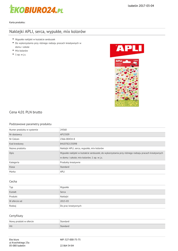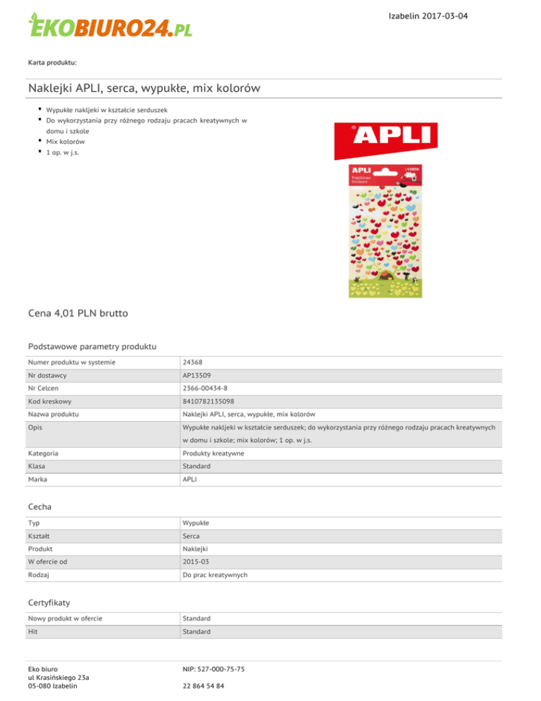 Izabelin 2017-03-04 Karta produktu: Naklejki APLI, serca, wypukłe, mix kolorów Wypukłe nakljeki w kształcie serduszek Do wykorzystania przy różnego rodzaju pracach kreatywnych w domu i szkole Mix kolorów 1 op. w j.s. Cena 4,01 PLN brutto Podstawowe parametry produktu Numer produktu w systemie 24368 Nr dostawcy AP13509 Nr Celcen 2366-00434-8 Kod kreskowy 8410782135098 Nazwa produktu Naklejki APLI, serca, wypukłe, mix kolorów Opis Wypukłe nakljeki w kształcie serduszek; do wykorzystania przy różnego rodzaju pracach kreatywnych w domu i szkole; mix kolorów; 1 op. w j.s. Kategoria Produkty kreatywne Klasa Standard Marka APLI Cecha Typ Wypukłe Kształt Serca Produkt Naklejki W ofercie od 2015-03 Rodzaj Do prac kreatywnych Certyfikaty Nowy produkt w ofercie Standard Hit Standard Eko biuro ul Krasińskiego 23a 05-080 Izabelin NIP: 527-000-75-75 22 864 54 84 Izabelin 2017-03-04 Karta katalogowa produktu cd. Naklejki APLI, serca, wypukłe, mix kolorów Kolor Kolor Mix kolorów Serdecznie zapraszamy do współpracy Eko biuro zespół. Eko biuro ul Krasińskiego 23a 05-080 Izabelin NIP: 527-000-75-75 22 864 54 84