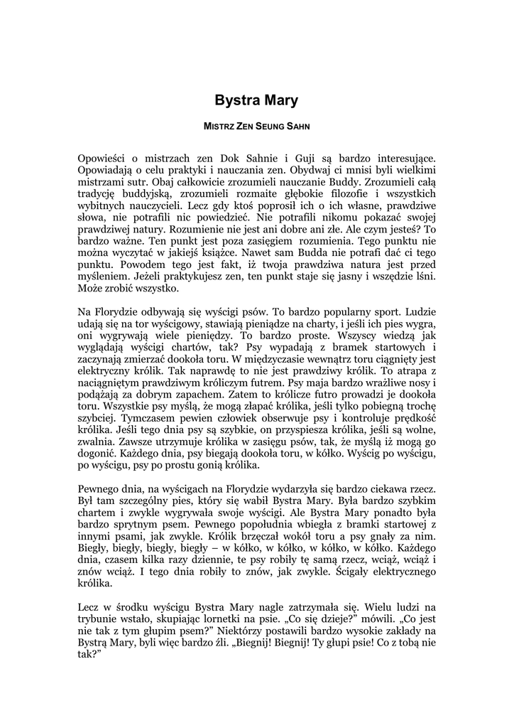 Bystra Mary MISTRZ ZEN SEUNG SAHN Opowieści o mistrzach zen Dok Sahnie i Guji są bardzo interesujące. Opowiadają o celu praktyki i nauczania zen. Obydwaj ci mnisi byli wielkimi mistrzami sutr. Obaj całkowicie zrozumieli nauczanie Buddy. Zrozumieli całą tradycję buddyjską, zrozumieli rozmaite głębokie filozofie i wszystkich wybitnych nauczycieli. Lecz gdy ktoś poprosił ich o ich własne, prawdziwe słowa, nie potrafili nic powiedzieć. Nie potrafili nikomu pokazać swojej prawdziwej natury. Rozumienie nie jest ani dobre ani złe. Ale czym jesteś? To bardzo ważne. Ten punkt jest poza zasięgiem rozumienia. Tego punktu nie można wyczytać w jakiejś książce. Nawet sam Budda nie potrafi dać ci tego punktu. Powodem tego jest fakt, iż twoja prawdziwa natura jest przed myśleniem. Jeżeli praktykujesz zen, ten punkt staje się jasny i wszędzie lśni. Może zrobić wszystko. Na Florydzie odbywają się wyścigi psów. To bardzo popularny sport. Ludzie udają się na tor wyścigowy, stawiają pieniądze na charty, i jeśli ich pies wygra, oni wygrywają wiele pieniędzy. To bardzo proste. Wszyscy wiedzą jak wyglądają wyścigi chartów, tak? Psy wypadają z bramek startowych i zaczynają zmierzać dookoła toru. W międzyczasie wewnątrz toru ciągnięty jest elektryczny królik. Tak naprawdę to nie jest prawdziwy królik. To atrapa z naciągniętym prawdziwym króliczym futrem. Psy maja bardzo wrażliwe nosy i podążają za dobrym zapachem. Zatem to królicze futro prowadzi je dookoła toru. Wszystkie psy myślą, że mogą złapać królika, jeśli tylko pobiegną trochę szybciej. Tymczasem pewien człowiek obserwuje psy i kontroluje prędkość królika. Jeśli tego dnia psy są szybkie, on przyspiesza królika, jeśli są wolne, zwalnia. Zawsze utrzymuje królika w zasięgu psów, tak, że myślą iż mogą go dogonić. Każdego dnia, psy biegają dookoła toru, w kółko. Wyścig po wyścigu, po wyścigu, psy po prostu gonią królika. Pewnego dnia, na wyścigach na Florydzie wydarzyła się bardzo ciekawa rzecz. Był tam szczególny pies, który się wabił Bystra Mary. Była bardzo szybkim chartem i zwykle wygrywała swoje wyścigi. Ale Bystra Mary ponadto była bardzo sprytnym psem. Pewnego popołudnia wbiegła z bramki startowej z innymi psami, jak zwykle. Królik brzęczał wokół toru a psy gnały za nim. Biegły, biegły, biegły, biegły – w kółko, w kółko, w kółko, w kółko. Każdego dnia, czasem kilka razy dziennie, te psy robiły tę samą rzecz, wciąż, wciąż i znów wciąż. I tego dnia robiły to znów, jak zwykle. Ścigały elektrycznego królika. Lecz w środku wyścigu Bystra Mary nagle zatrzymała się. Wielu ludzi na trybunie wstało, skupiając lornetki na psie. „Co się dzieje?” mówili. „Co jest nie tak z tym głupim psem?” Niektórzy postawili bardzo wysokie zakłady na Bystrą Mary, byli więc bardzo źli. „Biegnij! Biegnij! Ty głupi psie! Co z tobą nie tak?” Lecz Bystra Mary nie poruszała się przez kilka chwil. Popatrzyła na trybunę. Popatrzyła na ogony innych psów galopujących na zakręcie. I popatrzyła na królika furkoczącego wokół zakrętu na druga stronę owalnego toru. Wszystko było całkowicie spokojne i ciche przez chwilę tego dnia na wyścigach. Nagle Bystra Mary przeskoczyła przez poręcz utrzymującą psy na torze. Pobiegła prosto przez wielkie pole wewnątrz jak błyskawica. Skacząc dokładnie we właściwym momencie przez drugą poręcz złapała królika! Bum! Ha ha ha ha ha! A więc to jest umysł zen. Każdy czegoś chce w życiu. Każdy tylko podąża za swoja karmą. Ludzie podążają za swoimi pomysłami i opiniami i wierzą, że to jest prawdziwe życie. Lecz Bystra Mary jest jak wysokiej klasy adept zen. Była mocno ćwiczona przez wiele lat tylko do podążania za królikiem. Każdego dnia uczoną ją by biec wokół toru – w kółko i w kółko i w kółko. Ale pewnego dnia zatrzymała się i dokładnie przypatrzyła. To zupełnie jak praktyka zen: zatrzymanie i przypatrywanie wszystkiemu co się dzieje w życiu. Wtedy spostrzegła coś jasno, i zrobiła, na sto procent. Nie sprawdzała wewnątrz i na zewnątrz. Wewnątrz i na zewnątrz – bum! – stało się jednym. To jest umysł zen. To bardzo proste, hę? – Przekład: Maciej Dziubak This article copyright © 2009 Kwan Um School of Zen