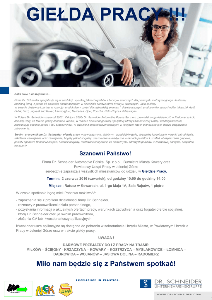 GIEŁDA PRACY !!! Kilka słów o naszej firmie… Firma Dr. Schneider specjalizuje się w produkcji wysokiej jakości wyrobów z tworzyw sztucznych dla przemysłu motoryzacyjnego. Jesteśmy rodzinną firmą z ponad 85-cioletnim doświadczeniem w dziedzinie przetwórstwa tworzyw sztucznych. Jako ceniony w świecie dostawca i partner w rozwoju produkujemy części dla najbardziej znanych i doświadczonych producentów samochodów takich jak Audi, BMW, Ford, Jaguar/Land Rover, Lamborghini, Mercedes, Opel, Porsche, Rolls-Royce i Volkswagen. W Polsce Dr. Schneider działa od 2002r. Od lipca 2006r Dr. Schneider Automotive Polska Sp. z o.o. prowadzi swoją działalność w Radomierzu koło Jeleniej Góry, na terenie gminy Janowice Wielkie, w ramach Kamiennogórskiej Specjalnej Strefy Ekonomicznej Małej Przedsiębiorczości, zatrudniając obecnie ponad 1350 pracowników. W związku z dynamicznym rozwojem w kolejnych latach planowane jest dalsze zwiększanie zatrudnienia. Swoim pracownikom Dr. Schneider oferuje pracę w nowoczesnym, stabilnym przedsiębiorstwie, atrakcyjne i przejrzyste warunki zatrudnienia, szkolenia wewnętrzne oraz zewnętrzne, bogaty pakiet socjalny: ubezpieczenie medyczne w ramach pakietów Lux Med, ubezpieczenie grupowe, pakiety sportowe Benefit Multisport, fundusz socjalny, możliwość korzystania ze smacznych i zdrowych posiłków w zakładowej kantynie, bezpłatne transporty. Szanowni Państwo! Firma Dr. Schneider Automotive Polska Sp. z o.o., Burmistrz Miasta Kowary oraz Powiatowy Urząd Pracy w Jeleniej Górze serdecznie zapraszają wszystkich mieszkańców do udziału w Giełdzie Pracy. Termin: 2 czerwca 2016 (czwartek), od godziny 10:00 do godziny 14:00 Miejsce : Ratusz w Kowarach, ul. 1-go Maja 1A, Sala Rajców, 1 piętro W czasie spotkania będą mieli Państwo możliwość: - zapoznania się z profilem działalności firmy Dr. Schneider, - rozmowy z pracownikami działu personalnego, - pozyskania informacji o aktualnych ofertach pracy, warunkach zatrudnienia oraz bogatej ofercie socjalnej, którą Dr. Schneider oferuje swoim pracownikom, - złożenia CV lub kwestionariuszy aplikacyjnych. Kwestionariusze aplikacyjne są dostępne do pobrania w sekretariacie Urzędu Miasta, w Powiatowym Urzędzie Pracy w Jeleniej Górze oraz w trakcie giełdy pracy. UWAGA ! DARMOWE PRZEJAZDY DO I Z PRACY NA TRASIE: MIŁKÓW – ŚCIĘGNY - KRZACZYNA – KOWARY – KOSTRZYCA – MYSŁAKOWICE – ŁOMNICA – DĄBROWICA – WOJANÓW – JASIOWA DOLINA – RADOMIERZ Miło nam będzie się z Państwem spotkać!