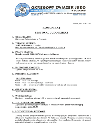 Poznań , dnia 2016-11-12 KOMUNIKAT FESTIWAL JUDO DZIECI 1. ORGANIZATOR Okręgowy Związek Judo w Poznaniu 2. TERMIN I MIEJSCE: 10.12.2016 /sobota/ - - dzieci Hala Sportowa POSiR, ul. Chwiałkowskiego 34 A - hala A 3. PRAWO STARTU: Dzieci - rocznik 2006-2007 (dziewczęta i chłopcy) W kategorii wiekowej dzieci mogą brać udział zawodnicy/czki posiadający min. 5 KYU i ważne badania lekarskie. W tej kategorii zakazane jest stosowania rzutów z kolan, rzutów z chwytem za szyję i głowę oraz technik w ne-waza dźwigni i duszeń. 4. KATEGORIE WAGOWE: Zgodnie z regulaminem PZ Judo, 5. PROGRAM ZAWODÓW: 10.12.2016 sobota Godz. 9.00 – 10.00 waga Godz. 10.00 – 11.00 weryfikacja i losowanie Godz. 11.00 - otwarcie zawodów i rozpoczęcie walk do ich zakończenia 6. OPŁATA STARTOWA: 30,-zł od zawodnika/czki 7. WYRÓŻNIENIA: Dyplomy i medale za miejsca I-III w poszczególnych kategoriach wagowych. 8. ZGŁOSZENIA DO ZAWODÓW Zgłoszenia pisemne przyjmowane będą w biurze zawodów przed weryfikacją tj. najpóźniej do godz. 10.00. 9. POSTANOWIENIA KOŃCOWE Zawody zostaną przeprowadzone zgodnie z obowiązującymi przepisami sędziowskimi i aktualnym Regulaminem Sportowym PZ Judo na 3 matach. Wszyscy zawodnicy muszą posiadać ubezpieczenie od następstw nieszczęśliwych wypadków. Organizator nie ponosi odpowiedzialności za wypadki podczas zawodów. Okręgowy Związek Judo w Poznaniu informuje, iż zgodnie z regulaminem sportowym Polskiego Związku Judo oraz wytycznymi i postanowieniem WPSL w Poznaniu decyzją lekarza zawodów zawodnicy\czki nie posiadający aktualnych badań lekarskich wydanych przez lekarza sportowego nie zostaną zweryfikowani, a tym samym nie będą mogli brać udziału w zawodach. Wszelkie komunikaty i wyniki dostępne będą na stronie internetowej www.oz-judo.pl OTRZYMUJĄ: - zainteresowane kluby i uks-y Sekretarz Okręgowego Związku Judo w Poznaniu mgr Agnieszka Kubea