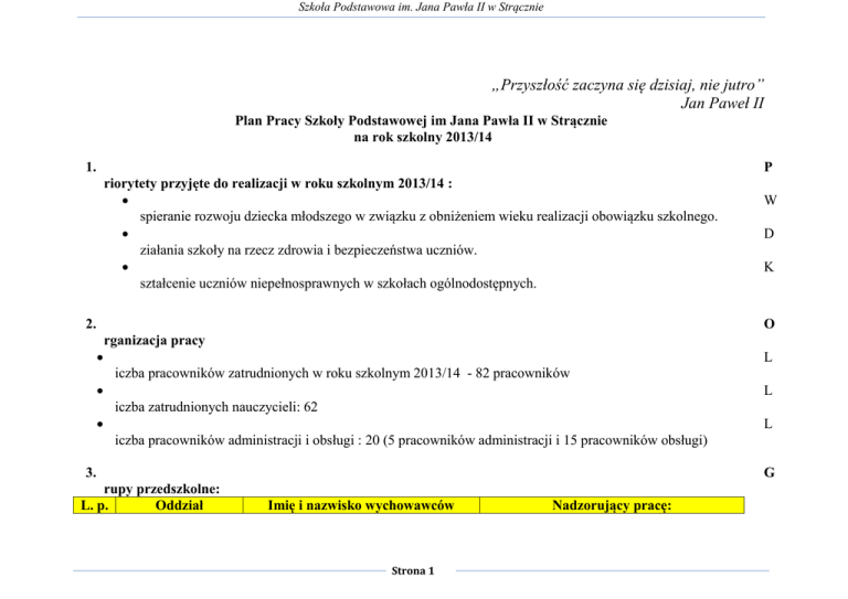 Szkoła Podstawowa im. Jana Pawła II w Strącznie „Przyszłość zaczyna się dzisiaj, nie jutro” Jan Paweł II Plan Pracy Szkoły Podstawowej im Jana Pawła II w Strącznie na rok szkolny 2013/14 1. P riorytety przyjęte do realizacji w roku szkolnym 2013/14 : spieranie rozwoju dziecka młodszego w związku z obniżeniem wieku realizacji obowiązku szkolnego. ziałania szkoły na rzecz zdrowia i bezpieczeństwa uczniów. ształcenie uczniów niepełnosprawnych w szkołach ogólnodostępnych. 2. W D K O rganizacja pracy L iczba pracowników zatrudnionych w roku szkolnym 2013/14 - 82 pracowników L iczba zatrudnionych nauczycieli: 62 L iczba pracowników administracji i obsługi : 20 (5 pracowników administracji i 15 pracowników obsługi) 3. rupy przedszkolne: L. p. Oddział G Imię i nazwisko wychowawców Strona 1 Nadzorujący pracę: Szkoła Podstawowa im. Jana Pawła II w Strącznie grupy: 1. 2. 3. Punkt przedszkolny Punkt przedszkolny Punkt przedszkolny Małgorzata Pacholczak Kierownik – Szkoły Filialnej w Różewie Joanna Rutkowska Mateusz Lasoń Kierownik – Szkoły Filialnej w Gostomi Kierownik – Szkoły Filialnej w Karsiborze 4. O ddział przedszkolny (grupa pięciolatków i sześciolatków): Imię i nazwisko wychowawców L. p. Oddział grupy: Oddział 1. Genowefa Wilk przedszkolny Oddział 2. Elżbieta Dudek przedszkolny Oddział 3. Urszula Ujmowicz przedszkolny Oddział Izabela Wierzbicka 4. przedszkolny A 5. Oddział przedszkolny B Nadzorujący pracę: wicedyrektor Kierownik – Szkoły Filialnej w Różewie Kierownik – Szkoły Filialnej w Gostomi Kierownik – Szkoły Filialnej w Karsiborze Jadwiga Kwiatkowska Kierownik – Szkoły Filialnej w Karsiborze Strona 2 Szkoła Podstawowa im. Jana Pawła II w Strącznie 5. I etap edukacyjny L. p. Oddział klasa I a 1. Imię i nazwisko wychowawców grupy: Izabela Barczak 3. 4. klasa I b klasa II Klasa III Maria Bielecka Dorota Kominek Małgorzata Gościńska 5. klasa I Agnieszka Podgórska 6. 7. 8. 9. 10. 11. 12. 13. klasa II Klasa III klasa I klasa II klasa III klasa I klasa II Klasa III Małgorzata Zdaniukiewicz Iwona Zajączkowska Joanna Wawszczyk Anetta Pietkiewicz Katarzyna Żuprańska 2. Bogulska Urszula Florczak Grażyna Lewandowska Jolanta Nadzorujący pracę: wicedyrektor Kierownik – Szkoły Filialnej w Różewie Kierownik – Szkoły Filialnej w Gostomi Kierownik – Szkoły Filialnej w Karsiborze 6. I I etap edukacyjny L. p. 1. Oddział Klasa IV Imię i nazwisko wychowawców grupy: Izabela Świerczyńska Nadzorujący pracę: 2. Klasa V Klasa VI a Radosław Smutek Barbara Szczęsna wicedyrektor 3. Strona 3 Szkoła Podstawowa im. Jana Pawła II w Strącznie 4. 5. 6. 7. 8. 9. 10. 11. 12. 13. 14. 15. Klasa VI b Klasa IV Klasa V Klasa VI a Klasa IV Klasa V Klasa VI Klasa IV Klasa V a Klasa V b Klasa VI a Klasa VI b Emilia Szwajkowska Alicja Zarzycka Małgorzata Hrycikowska Agnieszka Wróbel Anna Barwińska Ewelina Lenczewska Marcin Paprota Siwko Bożena Wojtunik Beata Piaskowska Aldona Plich Monika Czyżewska Ewa Kierownik – Szkoły Filialnej w Różewie Kierownik – Szkoły Filialnej w Gostomi Kierownik – Szkoły Filialnej w Karsiborze 7. K alendarz roku szkolnego: 1. Rozpoczęcie roku szkolnego 2. 3. 4. 5. Zimowa przerwa świąteczna Ferie zimowe Wiosenna przerwa świąteczna Sprawdzian klasy VI 2 września 2013 Klasy 0, I-IV, godz. 8.00 Uroczysta Msza Święta godz. 9.00 Inauguracja roku szkolnego 2013/2014 23-31.12.2013 17.02 – 02.03.2014 r. 17-22.04.2014 r. 01.04.2014 r. Strona 4 Szkoła Podstawowa im. Jana Pawła II w Strącznie 6. 7. Zakończenie rocznych zajęć dydaktyczno wychowawczych 27.06.2014 r. Dni wolne od zajęć dydaktyczno-wychowawczych: 2-3.01.2014 r. (czwartek, piątek), 01.04.2014 r. (wtorek) 02.05.2014 r. (piątek) 20.06.2014 r. (piątek) Jeden dzień do wykorzystania w razie potrzeby 8. G odziny pracy biblioteki i czytelni: Prowadzący Poniedziałek Wtorek Radosław Smutek ( Strączno) Anna Owczarek 9.10 - 9.40 9.00 - 11.30 ( Różewo) 11.30 - 12.30 12.30 - 15.00 14.30 - 15.00 Anna Barwińska 9.00-10.20 8.20-9.25 (Gostomia) 13.15-15.10 10.10-11.05 Joanna Wawszczyk ( Gostomia) Aldona Piaskowska ( Karsibór) Środa Czwartek 9.00 - 9.30 11.30 - 12.30 14.30 - 15.00 10.20- 12.15 10.30 – 11.30 13.15 – 15.00 10.30 -11.30 8.30 – 11.30 8.30 – 13.30 14.30-15.30 8.30 – 10.30 9. 9.30 – 13.30 Piątek 8.30 - 9.30 14.30 - 15.00 9.25-10.20 11.05-12.10 13.15-15.10 12.15 - 13.15 8.30 – 11.30 G odziny pracy pedagoga Strona 5 Szkoła Podstawowa im. Jana Pawła II w Strącznie Prowadzący Ewa Niesyn Poniedziałek 11:00-13:00 Strączno Środa 10:00-13:00 Strączno Wtorek 8:30-13:30 Różewo Czwartek 9:00-14:00 Gostomia Piątek 8:00-13:00 Karsibór 10. D ni pracy pielęgniarki: Pielęgniarka Bożena Orfin Bożena Turowska Poniedziałek Środa Wtorek Strączno Czwartek Piątek Gostomia czwartek 9.00 12.00 11. P rzydział klas do opieki: Strączno: NR KLASY 20 21 26 16 13 17 OPIEKUN M. Gościńska I. Barczak B. Szczęsna D. Kominek M. Bielecka D. Gortat Strona 6 Szkoła Podstawowa im. Jana Pawła II w Strącznie 24 8 świetlica Biblioteka i czytelnia Sala gimnastyczna Różewo: NR KLASY 3, 4 11 12 14 17 18 20 22 23 24 25 30 19 E. Szwajkowska I.Świerczyńska R. Smutek/ D. Kominek R. Smutek J. Bogusz OPIEKUN M. Pacholczak A. Owczarek A. Owczarek, A. Zarzycka A. Podgórska E. Dudek M. Zdaniukiewicz I. Zajączkowska A. Wróbel E. Kamińska A. Zarzycka M. Hrycikowska B. Kozioł C. Michalik Strona 7 Szkoła Podstawowa im. Jana Pawła II w Strącznie 8 M. Zdaniukiwiecz Gostomia: NR KLASY Sala nr 1 budynek A Sala nr 2 budynek A Sala nr 3 budynek A Pracownia językowa Sala komputerowa Sala nr 1 budynek B Sala nr 2 budynek B Sala nr 3 budynek B Sala nr 4 budynek B OPIEKUN Ewelina Lenczewska Anna Barwińska Katarzyna Żuprańska Joanna Szpynda Ewelina Lenczewska Anetta Pietkiewicz Joanna Wawszczyk Urszula Ujmowicz Joanna Rutkowska Karsibór: NR KLASY Punkt przedszkolny Oddział przedszkolny A Oddział 