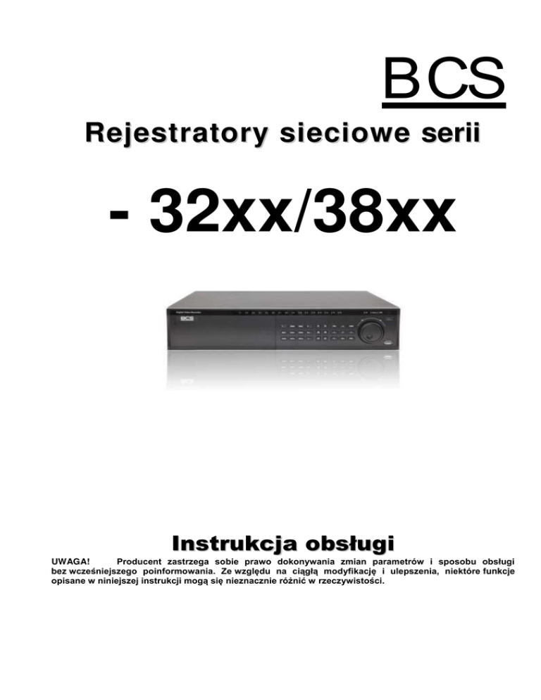 BCS R e j e s t r a t o r y s i e c i o w e serii - 32xx/38xx Instrukcja obsługi UWAGA! Producent zastrzega sobie prawo dokonywania zmian parametrów i sposobu obsługi bez wcze niejszego poinformowania. Ze wzgl du na ci gł modyfikacj i ulepszenia, niektóre funkcje opisane w niniejszej instrukcji mog si nieznacznie ró nić w rzeczywisto ci. Witamy Ź z i k u j e m y z a z a k u p n a s z e g o r e j e s t r a t o r a c yf r o we g o Ą N i n i e j s z a i n s t r u k c j a p o z wa l a n a z a p o z n a n i e s i z d z i a ł a n i e m, u r u c h o m i e n i e o r a z p r a wi d ł o w o b s ł u g u r z d z e n i a . Znajduj si w n i e j i n f o r ma c j e o p o s z c z e g ó l n yc h f u n k c j a c h i s p o s o b a c h i c h w yk o r z ys t a n i a . Przed rozpocz ciem instalacji, z a l e c e n i a mi o r a z o s t r z e e n i a mi Ą zapoznaj si z p o n i s z ym i SPIS TRź CI WA Nź ZALźCźNIA i OSTRZź źNIA .............................................................. 6 1. 1.1. 1 CECHY I SPECYFIKACJE ............................................................................ 7 7 2. 2.1 2.2 WYGL D OżÓLNY I STźROWANIź ....................................................... 2.2.1 2.3 2.4 2.5 2.5.1 2.5.2 3 3.1 3.2 3.2.1 3.2.2 3.2.3 3.2.4 3.3 3.3.1 3.3.2 3.4 3.5 3.6 3.6.1 3.6.2 3.6.3 3.6.4 3.6.5 Cechy ............................................................................................................ Panel przedni ............................................................................................... Panel Tylny ................................................................................................... Widok ogólny ................................................................................................... 8 8 10 10 Pilot zdalnego sterowania ........................................................................... Sterowanie mysz komputerow ............................................................... Klawiatura wirtualna i panel przedni .......................................................... 11 13 14 Klawiatura wirtualna ......................................................................................... Panel przedni ................................................................................................... 14 14 INSTALACJA i PODŁ CZźNIA ................................................................. 15 15 15 Zawarto ć opakowania ............................................................................... Instalacja dysku twardego .......................................................................... Wybór dysku twardego ..................................................................................... Obliczanie pojemno ci dysków twardych .......................................................... Instalacja dysku twardego ................................................................................ Instalacja nagrywarki CD lub DVD ................................................................... Wolnostoj cy lub monta w szafie Rack ................................................... Wolnostoj cy .................................................................................................... Monta w szafie Rack ...................................................................................... Podł czenie zasilania .................................................................................. Podł czanie urz dzeń ................................................................................. Podł czenie toru Audio, wej ć i wyj ć alarmowych ................................. Wej cia i wyj cia alarmowe .............................................................................. Wej cia alarmowe ............................................................................................ Wyj cia alarmowe ............................................................................................ Szczegóły poł czeń wej ć / wyj ć alarmowych ................................................ Opis wyj ć alarmowych .................................................................................... 15 15 15 17 18 18 18 18 18 19 19 19 19 19 21 3.7 3.8 Interfejs RS232 ............................................................................................. Interfejs RS485 ............................................................................................. 22 23 4 4.1 OBSŁUżA RźJźSTRATORA ..................................................................... Logowanie, Wylogowanie (wył czenie) i Menu główne ........................... 24 24 Logowanie ........................................................................................................ Menu główne .................................................................................................... Wylogowanie .................................................................................................... Przywracanie systemu po zaniku zasilania ....................................................... Wymiana baterii podtrzymuj cej ....................................................................... 24 25 25 26 26 4.1.1 4.1.2 4.1.3 4.1.4 4.1.5 4.2 4.2.1 4.2.2 4.2.3 4.3 4.3.1 4.3.2 4.3.3 Nagrywanie r czne ...................................................................................... Podgl d bie cy ............................................................................................... Żunkcja zoom podczas podgl du lokalnego ..................................................... Nagrywanie r czne .......................................................................................... 26 26 26 27 Wyszukiwanie i Odtwarzanie ...................................................................... 28 Menu wyszukiwania .......................................................................................... Podstawowe operacje ..........................................................