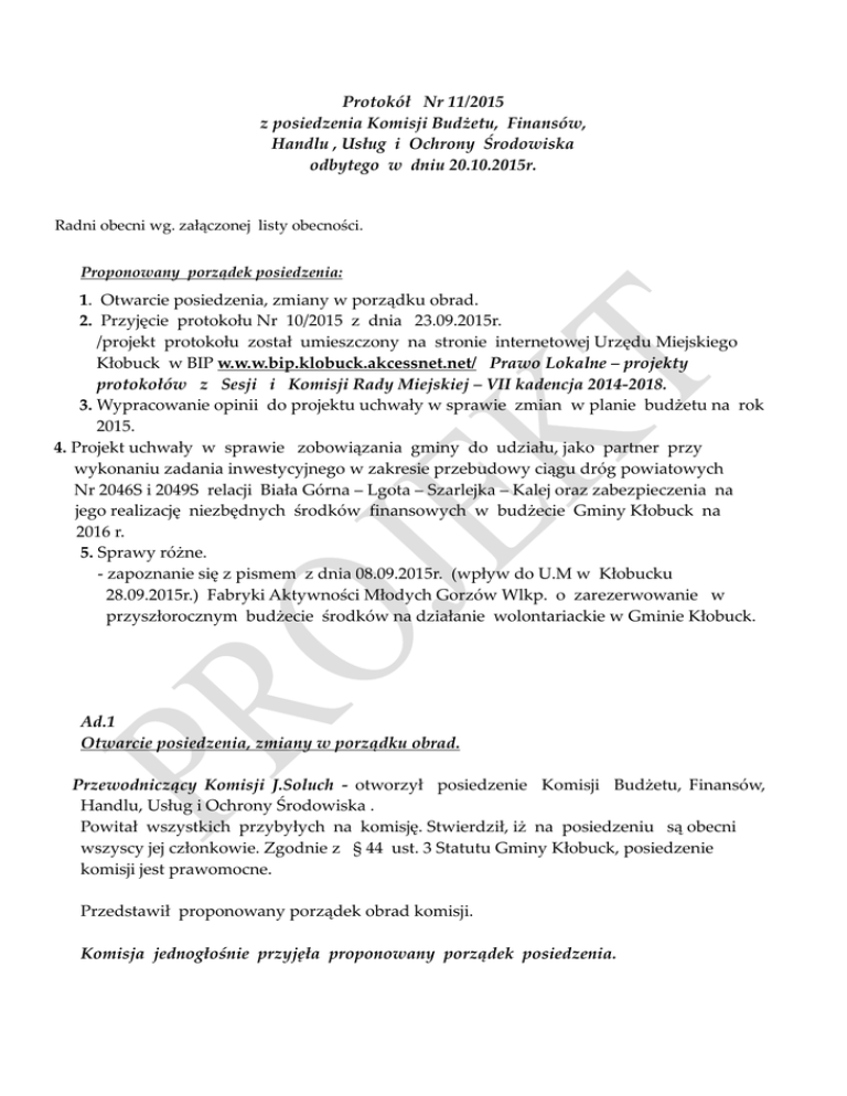 Protokół Nr 11/2015 z posiedzenia Komisji Budżetu, Finansów, Handlu , Usług i Ochrony Środowiska odbytego w dniu 20.10.2015r. Radni obecni wg. załączonej listy obecności. Proponowany porządek posiedzenia: 1. Otwarcie posiedzenia, zmiany w porządku obrad. 2. Przyjęcie protokołu Nr 10/2015 z dnia 23.09.2015r. /projekt protokołu został umieszczony na stronie internetowej Urzędu Miejskiego Kłobuck w BIP w.w.w.bip.klobuck.akcessnet.net/ Prawo Lokalne – projekty protokołów z Sesji i Komisji Rady Miejskiej – VII kadencja 2014-2018. 3. Wypracowanie opinii do projektu uchwały w sprawie zmian w planie budżetu na rok 2015. 4. Projekt uchwały w sprawie zobowiązania gminy do udziału, jako partner przy wykonaniu zadania inwestycyjnego w zakresie przebudowy ciągu dróg powiatowych Nr 2046S i 2049S relacji Biała Górna – Lgota – Szarlejka – Kalej oraz zabezpieczenia na jego realizację niezbędnych środków finansowych w budżecie Gminy Kłobuck na 2016 r. 5. Sprawy różne. - zapoznanie się z pismem z dnia 08.09.2015r. (wpływ do U.M w Kłobucku 28.09.2015r.) Fabryki Aktywności Młodych Gorzów Wlkp. o zarezerwowanie w przyszłorocznym budżecie środków na działanie wolontariackie w Gminie Kłobuck. Ad.1 Otwarcie posiedzenia, zmiany w porządku obrad. Przewodniczący Komisji J.Soluch - otworzył posiedzenie Komisji Budżetu, Finansów, Handlu, Usług i Ochrony Środowiska . Powitał wszystkich przybyłych na komisję. Stwierdził, iż na posiedzeniu są obecni wszyscy jej członkowie. Zgodnie z § 44 ust. 3 Statutu Gminy Kłobuck, posiedzenie komisji jest prawomocne. Przedstawił proponowany porządek obrad komisji. Komisja jednogłośnie przyjęła proponowany porządek posiedzenia. Ad.2. Przyjęcie protokołu Nr 10/2015 z dnia 23.09.2015r. Komisja nie wniosła uwag do projektu protokołu z poprzedniego posiedzenia. Komisja przyjęła protokół z poprzedniej komisji. /Za przyjęciem protokołu – głosowało 11 osób ; wstrzymały się – 3 osoby/ przeciwnych – 0 ; Ad.3. Wypracowanie opinii do projektu uchwały w sprawie zmian w planie budżetu na rok 2015. Skarbnik K.Jagusiak – projekt uchwały wynika ze zmiany dyspozycji środkami Funduszu Sołeckiego Borowianka określoną na zebraniu wiejskim. Dotyczy to zmiany przeznaczenia celu z funduszy kulturalnych na oświetlenie Komisji Budżetu, Finansów, Handlu , Usług i Ochrony Środowiska jednogłośnie pozytywnie zaopiniowała projekt uchwały w sprawie zmian w planie budżetu na rok 2015. Ad.4. Projekt uchwały w sprawie zobowiązania gminy do udziału, jako partner przy wykonaniu zadania inwestycyjnego w zakresie przebudowy ciągu dróg powiatowych Nr 2046S i 2049S relacji Biała Górna – Lgota – Szarlejka – Kalej oraz zabezpieczenia na jego realizację niezbędnych środków finansowych w budżecie Gminy Kłobuck na 2016 r. Burmistrz J.Zakrzewski – już wcześniej sygnalizował o tym Starosta Kłobucki na posiedzeniach sesji . Dzisiaj jest już gotowy projekt na drogę powiatową . Przedstawił projekt uchwały intencyjnej dot. tej inwestycji .Zapowiedział się Pan Wicestarosta Maciej Biernacki , ale jest posiedzenie Zarządu Powiatu więc spóźni się trochę. Powiedział o składnikach, które dotyczą tej uchwały. Ta inwestycja jest prowadzona przez trzy jednostki samorządu terytorialnego: czyli Wręczycę, Starostwo Powiatowe jako główny inwestor i Gminy Kłobuck. Według szacunkowych kosztów kosztorysowych, które mamy to inwestycja jest skosztorysowana na kwotę 7.000.000 zł. Przy tym założeniu 3.000.000 zł otrzymałaby ta inwestycja z budżetu Państwa, z kolei 4.000.000 zł byłoby to pokrycie ze środków Powiatu i gmin, które są uczestnikami tego procesu inwestycyjnego. Rozdzielałoby się to w takich proporcjach, że 2.000.000 zł Powiat, 1.540.000 zł Gmina Kłobuck i 460.000 zł Gmina Wręczyca Wielka. Szczególnie tutaj chodzi o podział między gminami z uwagi na długość odcinków tej drogi, dlatego według kosztorysu taki jest podział między tymi gminami. Najdłuższy odcinek jest oczywiście Lgoty i odcinek między Lgotą a Białą. Zakładając obecne stawki, które obowiązują po przetargu czyli zakładamy, że ten przetarg może wyjść korzystniej i przy założeniu, że wartość po przetargu może szacować się w granicach 4.900.000 zł i w tym przypadku partycypacja kosztów byłaby następująca: 2.450.000 zł budżet Państwa , 2.450.000 zł powiaty i gminy partycypujące w tym przedsięwzięciu. W tym Powiat Kłobucki 1.225.000 zł, Gmina Kłobuck 943.000 zł i 281.750 zł Gmina Wręczyca. Przedstawiony projekt uchwały zakłada pomoc finansową na poziomie 1.540.000 zł z tym , że w tej dotacji jest również dotacja na wykonanie planowanego II etapu ulicy Długosza w Kłobucku (drogi gminnej). Projekt jest gotowy. Na spotkaniu z przedstawicielami Powiatu i Gminy Wręczyca ustalono, że Gmina Kłobuck chce być uczestnikiem procesu projektowego. Pani Kierownik W.Solska ma kilka uwag do tego projektu, a mianowicie projektant nie uwzględnił parkingu przy szkole, co jest dla nas niedopuszczalne. Parking był wykonany z gminnych środków, więc powinien być w tym projekcie uwzględniony. Być może projektant to pominął, ma to zmienić. Oczywiście ta droga jest przewidywana z chodnikiem po jednej stronie na całej długości. Jest mowa o naszych odcinkach drogi, nie rozmawia się o gminie Wręczyca, bo nas to nie dotyczy. Na odcinku od Lgoty do Białej ma być utwardzone pobocze dlatego, że tam nie ma budynków i zabudowań, więc nie ma sensu dzisiaj robić tam chodnika, bo to też pomniejsza koszty. Radny A.Sękiewicz – chciał się dowiedzieć w jakim terminie ten II etap ul. Długosza byłby robiony. Burmistrz J.Zakrzewski – ul. Długosza jest w takiej dobrej sytuacji, że nie mamy gotowych projektów do schetynówek , a termin do końca października jest składania jakichkolwiek wniosków. Aby nie opuścić tego naboru mając dok