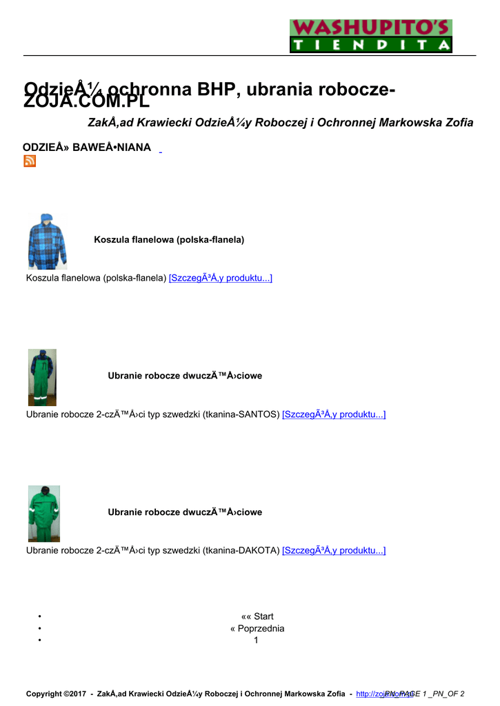 Odzież ochronna BHP, ubrania roboczeZOJA.COM.PL ZakÅ‚ad Krawiecki Odzieży Roboczej i Ochronnej Markowska Zofia ODZIEÅ» BAWEÅ•NIANA Koszula flanelowa (polska-flanela) Koszula flanelowa (polska-flanela) [Szczegóły produktu...] Ubranie robocze dwuczęściowe Ubranie robocze 2-części typ szwedzki (tkanina-SANTOS) [Szczegóły produktu...] Ubranie robocze dwuczęściowe Ubranie robocze 2-części typ szwedzki (tkanina-DAKOTA) [Szczegóły produktu...] • • • «« Start « Poprzednia 1 Copyright ©2017 - ZakÅ‚ad Krawiecki Odzieży Roboczej i Ochronnej Markowska Zofia - http://zoja.com.pl _PN_PAGE 1 _PN_OF 2 • • NastÄ™pna » Koniec »» Wyniki 1 - 3 z 3 Copyright ©2017 - ZakÅ‚ad Krawiecki Odzieży Roboczej i Ochronnej Markowska Zofia - http://zoja.com.pl _PN_PAGE 2 _PN_OF 2