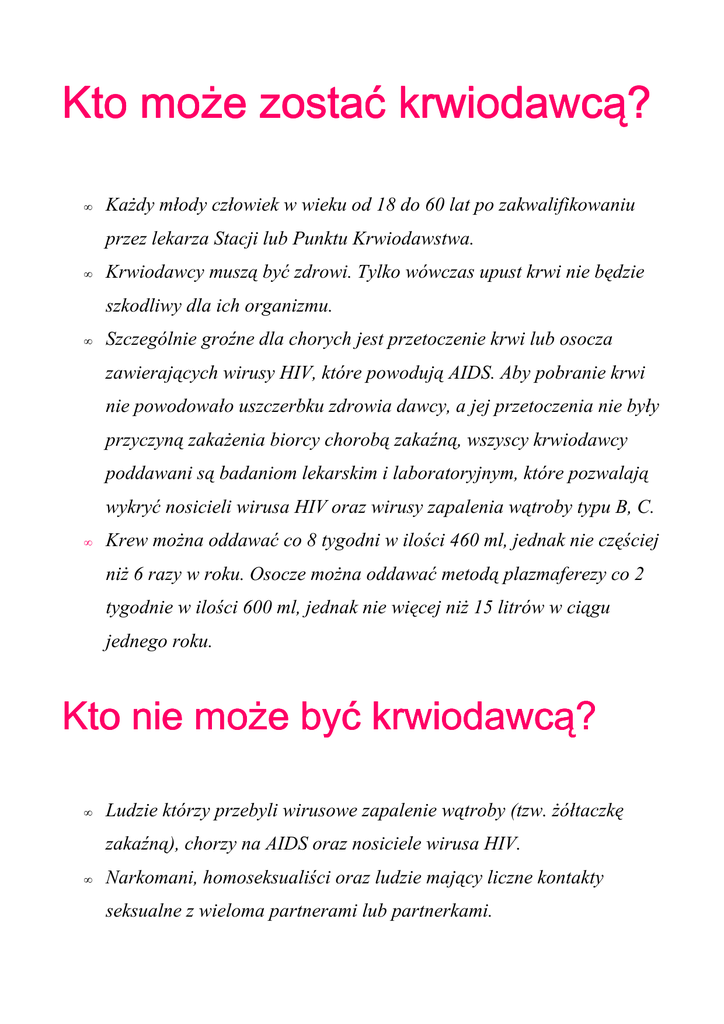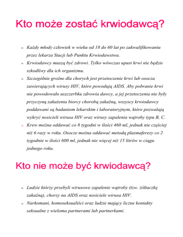 Kto może zostać krwiodawcą? • KaŜdy młody człowiek w wieku od 18 do 60 lat po zakwalifikowaniu przez lekarza Stacji lub Punktu Krwiodawstwa. • Krwiodawcy muszą być zdrowi. Tylko wówczas upust krwi nie będzie szkodliwy dla ich organizmu. • Szczególnie groźne dla chorych jest przetoczenie krwi lub osocza zawierających wirusy HIV, które powodują AIDS. Aby pobranie krwi nie powodowało uszczerbku zdrowia dawcy, a jej przetoczenia nie były przyczyną zakaŜenia biorcy chorobą zakaźną, wszyscy krwiodawcy poddawani są badaniom lekarskim i laboratoryjnym, które pozwalają wykryć nosicieli wirusa HIV oraz wirusy zapalenia wątroby typu B, C. • Krew moŜna oddawać co 8 tygodni w ilości 460 ml, jednak nie częściej niŜ 6 razy w roku. Osocze moŜna oddawać metodą plazmaferezy co 2 tygodnie w ilości 600 ml, jednak nie więcej niŜ 15 litrów w ciągu jednego roku. Kto nie może być krwiodawcą? • Ludzie którzy przebyli wirusowe zapalenie wątroby (tzw. Ŝółtaczkę zakaźną), chorzy na AIDS oraz nosiciele wirusa HIV. • Narkomani, homoseksualiści oraz ludzie mający liczne kontakty seksualne z wieloma partnerami lub partnerkami. • Ludzie chorzy na gruźlicę, kiłę, choroby krwi, choroby serca i naczyń krwionośnych, oraz choroby nawrotowe, a takŜe alkoholicy. • Przez okres 6 miesięcy osoby wracające z Afryki Środkowej i Zachodniej, Tajlandii, a takŜe osoby zwolnione z zakładów karnych. • Osoby które w ciągu 12 ostatnich miesięcy miały zabieg operacyjny, przetaczały krew lub osocze, wykonywały tatuaŜ, albo przebijały jakąkolwiek część ciała. • Kobiety będące w ciąŜy, 6 miesięcy po porodzie i w okresie karmienia piersią oraz przez 3 miesiące po zaprzestaniu karmienia piersią. • Kobiety będące w trakcie miesiączki i przez 3 dni po jej zakończeniu. Chciałabym oddać krew ale ...obawy nowicjuszy 1. ... boje się oddać krew. Po raz pierwszy każdy się trochę boi, ale zupełnie bezpodstawnie. Przecież tysiące ludzi oddaje krew 50 lub 100 razy, a niektórzy nawet 150 razy. Nie musisz być supermanem, aby oddać krew; jest to naprawdę bardzo proste. 2. ... nie cierpię igieł. Aby wyeliminować ból, stosuje się specjalnie ostrzone i profilowane igły. Nakłucie nie jest bolesne. 3. ... to mnie osłabi. osłabi Krew jest uzupełniana dość szybko. Zanim wyjdziesz z punktu krwiodawstwa proces uzupełniania krwi już się rozpocznie. Zaledwie po kilku godzinach jej objętość wróci do normy, a ty nie odczujesz żadnych dolegliwości i będziesz mogła bez przeszkód wykonywać swoje zwykle obowiązki. 4. ... zażywam tabletki. To może oznaczać, że będzie trzeba poczekać z oddaniem krwi. Ale nie wszystkie leki mają wpływ na jakość krwi. Zasięgnij informacji w punkcie krwiodawstwa, czy biorąc dany lek możesz oddać krew. 5. ... moja krew jest niedobra. Zbadamy ją. Ty na kilka minut wyciągniesz rękę, a my zrobimy resztę. Krew jest zawsze badana przed wysyłką do szpitala. 6. ... ostatnio chorowałam. Bez wątpienia nie możesz oddawać krwi podczas ostrej choroby lub przez pewien czas po ostrym zabiegu chirurgicznym. Nie pobiera się nigdy krwi od osób, których stan zdrowia budzi wątpliwości. Każdego kandydata na dawcę bada lekarz. 7. ... jeśli oddam krew, będę musiała robić to zawsze. Oddawanie krwi nie powoduje wzmożonego jej wytwarzania. Nic cię nie zmusza do regularnego jej oddawania, ponieważ jednorazowe oddanie krwi wywiera taki sam wpływ na jej produkcję, jak krwawienie z nosa, miesiączka czy skaleczenie w palec. Jednakże wielu systematycznych dawców oddaje krew regularnie 3 lub 4 razy w roku i robią to nie dlatego, że muszą ale dlatego że postanowili to robić. WIELKA AKCJA ODDAWANIA KRWI Zostań krwiodawcą! Oddając krew spełniasz najpiękniejszy czyn - ratujesz zagroŜone Ŝycie. Nie obawiaj się!!! W czasie oddawania krwi nie możesz zarazić się wirusem HIV, ponieważ do pobierania krwi używany jest wyłącznie jałowy sprzęt, jednorazowego użytku. Krew i osocze może oddać każdy zdrowy człowiek w wieku od 18 do 60 lat. Tutaj możesz oddać krew: Zielona Góra ul. Zyty 21, tel.(0tel.(0-68) 327327-1010-74, 327327-1010-75