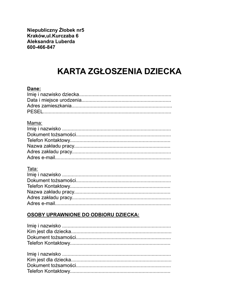 Niepubliczny Żłobek nr5 Kraków,ul.Kurczaba 6 Aleksandra Luberda 600-466-847 KARTA ZGŁOSZENIA DZIECKA Dane: Imię i nazwisko dziecka................................................................... Data i miejsce urodzenia................................................................. Adres zamieszkania......................................................................... PESEL............................................................................................. Mama: Imię i nazwisko ............................................................................... Dokument tożsamości..................................................................... Telefon Kontaktowy......................................................................... Nazwa zakładu pracy...................................................................... Adres zakładu pracy........................................................................ Adres e-mail.................................................................................... Tata: Imię i nazwisko ............................................................................... Dokument tożsamości..................................................................... Telefon Kontaktowy......................................................................... Nazwa zakładu pracy...................................................................... Adres zakładu pracy........................................................................ Adres e-mail.................................................................................... OSOBY UPRAWNIONE DO ODBIORU DZIECKA: Imię i nazwisko ............................................................................... Kim jest dla dziecka......................................................................... Dokument tożsamości..................................................................... Telefon Kontaktowy......................................................................... Imię i nazwisko ............................................................................... Kim jest dla dziecka......................................................................... Dokument tożsamości..................................................................... Telefon Kontaktowy......................................................................... Imię i nazwisko ............................................................................... Kim jest dla dziecka......................................................................... Dokument tożsamości..................................................................... Telefon Kontaktowy......................................................................... Rodzaj wybranego wyżywienia: – – – forma I * forma II * forma III * Informacje o Dziecku: 1. Czego dziecko nie lubi, czego się boi: ........................................................................................................ ......................................................................................................... 2. Krótki opis temperamentu dziecka: ......................................................................................................... ......................................................................................................... 3. Czy sytuacja rozstania z rodzicami jest wyjątkowo trudna ........................................................................................................ ........................................................................................................ 4. Czy jest jakiś szczególny sposób uspakajania/usypiania dziecka ......................................................................................................... ........................................................................................................ ........................................................................................................ 5. Jak dziecko jest usypiane ........................................................................................................ ........................................................................................................ 6. Plan dnia dziecka: ........................................................................................................ ........................................................................................................ ........................................................................................................ ........................................................................................................ ........................................................................................................ ........................................................................................................ ........................................................................................................ ........................................................................................................ ........................................................................................................ ........................................................................................................ Dane na temat zdrowia dziecka: Alergie i uczulenia: ........................................................................................................ ........................................................................................................ Przebyte choroby zakaźne: ........................................................................................................ ........................................................................................................ Czy dziecko często choruje: ........................................................................................................ Czy jest pod opieką s