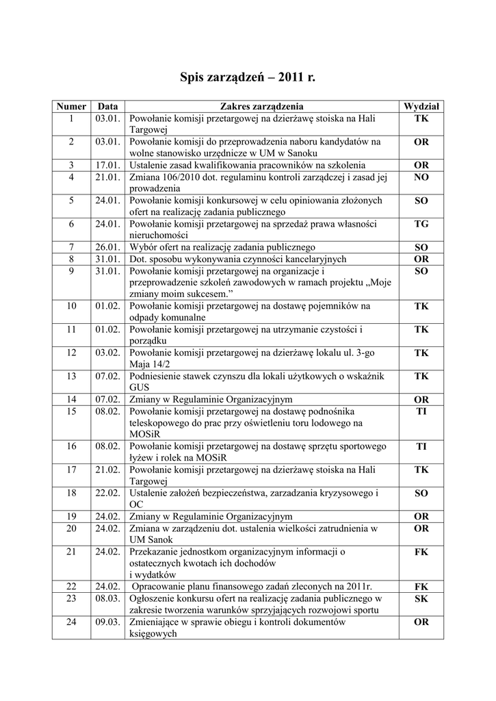 Spis zarządzeń – 2011 r. Numer Data Zakres zarządzenia 1 03.01. Powołanie komisji przetargowej na dzierżawę stoiska na Hali Targowej 2 03.01. Powołanie komisji do przeprowadzenia naboru kandydatów na wolne stanowisko urzędnicze w UM w Sanoku 3 17.01. Ustalenie zasad kwalifikowania pracowników na szkolenia 4 21.01. Zmiana 106/2010 dot. regulaminu kontroli zarządczej i zasad jej prowadzenia 5 24.01. Powołanie komisji konkursowej w celu opiniowania złożonych ofert na realizację zadania publicznego 6 24.01. Powołanie komisji przetargowej na sprzedaż prawa własności nieruchomości 7 26.01. Wybór ofert na realizację zadania publicznego 8 31.01. Dot. sposobu wykonywania czynności kancelaryjnych 9 31.01. Powołanie komisji przetargowej na organizacje i przeprowadzenie szkoleń zawodowych w ramach projektu „Moje zmiany moim sukcesem.” 10 01.02. Powołanie komisji przetargowej na dostawę pojemników na odpady komunalne 11 01.02. Powołanie komisji przetargowej na utrzymanie czystości i porządku 12 03.02. Powołanie komisji przetargowej na dzierżawę lokalu ul. 3-go Maja 14/2 13 07.02. Podniesienie stawek czynszu dla lokali użytkowych o wskaźnik GUS 14 07.02. Zmiany w Regulaminie Organizacyjnym 15 08.02. Powołanie komisji przetargowej na dostawę podnośnika teleskopowego do prac przy oświetleniu toru lodowego na MOSiR 16 08.02. Powołanie komisji przetargowej na dostawę sprzętu sportowego łyżew i rolek na MOSiR 17 21.02. Powołanie komisji przetargowej na dzierżawę stoiska na Hali Targowej 18 22.02. Ustalenie założeń bezpieczeństwa, zarzadzania kryzysowego i OC 19 24.02. Zmiany w Regulaminie Organizacyjnym 20 24.02. Zmiana w zarządzeniu dot. ustalenia wielkości zatrudnienia w UM Sanok 21 24.02. Przekazanie jednostkom organizacyjnym informacji o ostatecznych kwotach ich dochodów i wydatków 22 24.02. Opracowanie planu finansowego zadań zleconych na 2011r. 23 08.03. Ogłoszenie konkursu ofert na realizację zadania publicznego w zakresie tworzenia warunków sprzyjających rozwojowi sportu 24 09.03. Zmieniające w sprawie obiegu i kontroli dokumentów księgowych Wydział TK OR OR NO SO TG SO OR SO TK TK TK TK OR TI TI TK SO OR OR FK FK SK OR 25 26 27 28 29 30 31 32 33 34 35 36 37 38 39 40 41 42 43 44 45 46 47 48 49 50 51 10.03. Powołanie komisji przetargowej na dzierżawę stoiska na Hali Targowej 11.03. Zmiana 59/2009 dot. powołania Miejskiej Komisji Urbanistyczno- Architektonicznej 15.03. Kodeks Etyki 15.03. Zmieniające dot. ustalenia Polityki Jakości 16.03. Powołanie komisji przetargowej na budowę sieci wodociągowej ul. Chrobrego, Szewska i Gajowa 16.03. Powołanie komisji przetargowej na budowę sieci kanalizacji deszczowej ul. Joselewicza 21.03. Powołanie komisji przetargowej na sprzedaż prawa własności nieruchomości 21.03. Powołanie komisji przetargowej na dostawę podnośnika teleskopowego do prac przy oświetleniu toru lodowego na MOSiR 23.03. Powołanie komisji przetargowej na dzierżawę lokalu ul. Jagiellońskiej 9 22.03. Powołanie zastępcy Burmistrza Miasta 25.03. Przedłożenie Radzie Miasta sprawozdania z wykonania budżetu za rok 2010 31.03. Zmieniające uchwałę budżetową 25.03. Powołanie komisji przetargowej na wdrożenie projektu „Przeciwdziałanie Wykluczeniu Cyfrowemu…” 01.04. Powołanie komisji przetargowej na dzierżawę stoiska na Hali Targowej 01.04. Powołanie komisji przetargowej na budowę oświetlenia ul. Wilcza, Sowia 04.04. Powołanie komisji przetargowej na remont trybun toru lodowego na MOSiR 04.04. Powołanie komisji przetargowej na adaptację bazy socjalnej toru lodowego na MOSiR 07.04. Przeprowadzenie obowiązkowej deratyzacji na terenie m. Sanoka 07.04. Ustalenie stawek czynszu za dzierżawę gruntu 08.04. Powołanie komisji przetargowej na sprzedaż prawa własności nieruchomości 13.04. Ogłoszenie konkursu ofert na realizację zadań publicznych w 2011r. 14.04. Ogłoszenie konkursu ofert na realizację zadań publicznych w 2011r. 14.04. Ogłoszenie konkursu ofert na realizację zadania publicznego 14.04. Powołanie Zespołu Interdyscyplinarnego d.s. przeciwdziałania Przemocy w Rodzinie 18.04. Powołanie komisji przetargowej na dzierżawę lokalu ul. Kościuszki 15 20.04. Wprowadzenie Regulaminu Audytu Wewnętrznego 20.04. Powołanie komisji konkursowej w celu opiniowania ofert na realizację zadania publicznego w zakresie tworzenia warunków sprzyjających rozwojowi sportu TK TG OR OR TI TI TG TI TK OR FK FK NZ TK TI TI TI TK TG TG SO SO SO SO TK OR SK 52 53 54 55 56 57 58 59 60 60/1 61 62 63 64 65 66 67 68 69 70 71 72 73 74 75 76 77 78 79 21.04. Powołanie komisji przetargowej na dzierżawę stoiska na Hali Targowej 28.04. Powołanie komisji przetargowej na przebudowę Zielonego Rynku 29.04. Zmieniające uchwałę budżetową 29.04. Wprowadzenie Polityki Bezpieczeństwa zbioru PMEFS 2007 29.04. Ocena i wybór ofert na realizację zadania publicznego w zakresie tworzenia warunków sprzyjających rozwojowi sportu 09.05. Powołanie komisji przetargowej na dzierżawę lokalu ul. Kościuszki 12 10.05. Powołanie komisji konkursowej w celu opiniowania złożonych ofert na realizację zadań publicznych 10.05. Powołanie komisji konkursowej w celu opiniowania złożonych ofert na realizację zadań publicznych 12.05. Zmieniające 140/2010 dot. opracowania szczegółowych zasad ustalenia wysokości stypendium szkolnego 16.05. Powołanie Komisji Rekrutacyjnej do projektu „Przeciwdziałanie wykluczeniu cyfrowemu…” 18.05. Wybór ofert na realizację zadań publicznych 19.05. Powołanie komisji przetargowej na remont trybun na torze lodowym 19.05. Wprowadzenie „Planu ochrony informacji niejawnych w UM” 20.05. Wybór ofert na realizację zadań publicznych 20.05. Wybór ofert na realizację zadań publicznych 24.05. Powołanie komisji przetargowej na dostawę energii elektrycznej 25.05. Powołanie komisji przetargowej na wyłonienie wykonawcy doradztwa zawodowego i warsztatów aktywizacj