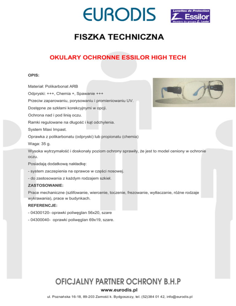 OKULARY OCHRONNE ESSILOR HIGH TECH OPIS: Materiał: Polikarbonat ARB Odpryski: +++, Chemia +, Spawanie +++ Przeciw zaparowaniu, porysowaniu i promieniowaniu UV. Dostępne ze szkłami korekcyjnymi w opcji. Ochrona nad i pod linią oczu. Ramki regulowane na długość i kąt odchylenia. System Maxi Impast. Oprawka z polikarbonatu (odpryski) lub propionatu (chemia) Waga: 35 g. Wysoka wytrzymałość i doskonały poziom ochrony sprawiły, że jest to model ceniony w ochronie oczu. Posiadają dodatkową nakładkę: - system zaczepienia na oprawce w części nosowej. - do zastosowania z każdym rodzajem szkieł. ZASTOSOWANIE: Prace mechaniczne (szlifowanie, wiercenie, toczenie, frezowanie, wytłaczanie, różne rodzaje wykrawania), prace w budynkach. REFERENCJE: - 04300120- oprawki poliwęglan 56x20, szare - 04300040- oprawki poliwęglan 69x19, szare.