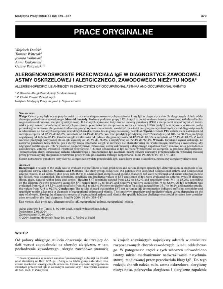 Medycyna Pracy 2004; 55 (5): 379 —387 379 PRACE ORYGINALNE Wojciech Dudek1 Tomasz Wittczak2 Jolanta Walusiak2 Anna Krakowiak2 Cezary Pałczyński1,2 ALERGENOWOSWOISTE PRZECIWCIAŁA IgE W DIAGNOSTYCE ZAWODOWEJ ASTMY OSKRZELOWEJ I ALERGICZNEGO, ZAWODOWEGO NIEŻYTU NOSA* ALLERGEN-SPECIFIC IgE ANTIBODY IN DIAGNOSTICS OF OCCUPATIONAL ASTHMA AND OCCUPATIONAL RHINITIS 1 Z Ośrodka Alergii Zawodowej i Środowiskowej Z Kliniki Chorób Zawodowych Instytutu Medycyny Pracy im. prof. J. Nofera w Łodzi 2 STRESZCZENIE Wstęp: Celem pracy była ocena przydatności oznaczania alergenowoswoistych przeciwciał klasy IgE w diagnostyce chorób alergicznych układu oddechowego pochodzenia zawodowego. Materiał i metody. Badaniu poddano grupę 152 chorych z podejrzeniem choroby zawodowej układu oddechowego (astma oskrzelowa, alergiczny nieżyt nosa). U badanych wykonano testy skórne metodą punktową (PTS) z alergenami zawodowymi ich środowiska pracy, oznaczono obecność swoistych przeciwciał przeciwko tym alergenom w surowicy metodą ELISA (as-IgE) oraz wykonano swoiste próby prowokacyjne wziewne alergenami środowiska pracy. Wyznaczono czułość, swoistość i wartości predykcyjne wymienionych metod diagnostycznych w odniesieniu do badanych alergenów zawodowych (mąka, zboża, lateks gumy naturalnej, bawełna). Wyniki. Czułość PTS wahała się w zależności od rodzaju alergenu od 22,2% do 68,2%, swoistość od 74,1% do 88,2%. Wartości predykcji pozytywnej dla PTS wahały się od 30% do 68,2% a predykcji negatywnej od 74% do 82,4%. Czułość as-IgE w zależności od rodzaju alergenu wynosiła od 42,8% do 83,3%, a swoistość od 57,1% do 81,5%. Z kolei wartości predykcji pozytywnej dla as-IgE wyniosły od 35,7% do 76,2%, a negatywnej od 72,4% do 92,3%. Wnioski. Uzyskane wyniki wskazują, że zarówno punktowe testy skórne, jak i identyfikacja obecności as-IgE w surowicy nie charakteryzują się wystarczającą czułością i swoistością, aby odgrywać rozstrzygającą rolę w procesie diagnostycznym zawodowej astmy oskrzelowej i alergicznego zapalenia błony śluzowej nosa pochodzenia zawodowego. Czułość, swoistość i wartości predykcyjne PTS oraz oznaczania as-IgE są różne w zależności od alergenu. W procesie diagnostyczno-orzeczniczym alergii zawodowej układu oddechowego o mechanizmie IgE-zależnym należy zawsze rozważyć przeprowadzenie wziewnej swoistej próby prowokacyjnej alergenami środowiska pracy w celu postawienia trafnego rozpoznania. Med. Pr. 2004; 55 (5): 379—387 Słowa kluczowe: punktowe testy skórne, alergenowo swoiste przeciwciała IgE, zawodowa astma oskrzelowa, zawodowy alergiczny nieżyt nosa ABSTRACT Background: The aim of the study was to evaluate the usefulness of skin prick tests and serum allergen-specific IgE determination in diagnosis of occupational airway allergies. Materials and Methods: The study group comprised 152 patients with suspected occupational asthma and occupational allergic rhinitis. In all subjects, skin prick tests (SPT) to occupational allergens and specific challenge test were performed, and serum allergen-specific IgE (as-IgE) was determined. The sensitivity, specificity and predictive values of SPT and serum as-IgE were evaluated for different types of allergens (flour, grain, natural rubber latex and cotton). Results: SPT sensitivity ranged from 22.2 to 68.2%, and specificity from 74.1 to 88.2%, depending on the allergen. Positive predictive values for SPT ranged from 30 to 68.2% and negative predictive values from 74 to 82.4%. As-IgE sensitivity was evaluated from 42.8 to 83.3%, and specificity from 57.1 to 81.5%. Positive predictive values for as-IgE ranged from 35.7 to 76.2% and negative predictive values from 72.4 to 92.3%. Conclusions: The results showed that neither SPT nor serum as-IgE determination indicated sufficient sensitivity and specificity to play a key role in diagnosis of occupational asthma and rhinitis. The sensitivity, specificity and predictive values varied depending on the type of allergen. During the diagnostic process of occupational asthma and rhinitis the specific inhalant challenge test should be taken into consideration to confirm the final diagnosis. Med Pr 2004; 55 (5): 379—387 Key words: skin prick test, allergen-specific IgE, occupational asthma, occupational rhinitis Adres autorów: Św. Teresy 8, 90-950 Łódź, e-mail: [email protected] Nadesłano: 2.09.2004 Zatwierdzono: 30.09.2004 © 2004, Instytut Medycyny Pracy im. prof. J. Nofera w Łodzi WSTĘP Od połowy ubiegłego stulecia obserwuje się trwający do dziś wzrost zapadalności na choroby alergiczne, w tym pochodzenia zawodowego. Alergie zawodowe stanowią * Praca wykonana w ramach zadania finansowanego z dotacji na działalność statutową nr IMP 12.2. pt. „Alergia na lateks gumy naturalnej; znaczenie markerów serologicznych uczulenia. Ocena częstości występowania swoistych przeciwciał IgE w surowicy u dawców krwi”. Kierownik zadania: dr hab. med. C. Pałczyński. w krajach rozwiniętych największy odsetek w strukturze rozpoznawanych chorób zawodowych układu oddechowego. W patogenezie części z tych schorzeń udowodniono istotny udział mechanizmów nadwrażliwości natychmiastowej, mediowanej przez przeciwciała klasy IgE. Do tego rodzaju chorób należą m.in. astma oskrzelowa, alergiczny nieżyt nosa, pokrzywka alergiczna i alergiczne zapalenie Pracownicy przetwórni spożywczej Comestible factory workers Sadownicy growers tapicerzy upholsterers Obuwnicy Shoe makers Młynarze Millers Stolarze Carpenters Salowe Hospital cleaners Laboranci Laboratory staff Brakarze Sorters Tkacze Weavers Szwaczki Sewers Rolnicy Farmers Pielęgniarki Nurses Piekarze Bakers Struktura zawodowa Job structure 1 1 lateks gumy naturalnej (Allergopharma, Niemcy) Natural rubber latex (Allergopharma, Germany) sierści zwierząt hodowlanych (krowa, świnia, owca, koń, koza, królik), chrom, tkaniny (bawełna, wełna, kapok, len) (Stallerge