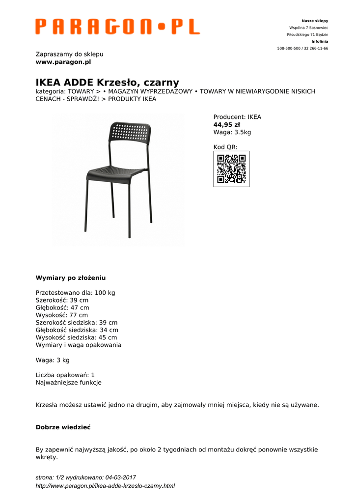 Nasze sklepy Wspólna 7 Sosnowiec Piłsudskiego 71 Będzin Infolinia 508-500-500 / 32 266-11-66 Zapraszamy do sklepu www.paragon.pl IKEA ADDE Krzesło, czarny kategoria: TOWARY > • MAGAZYN WYPRZEDAŻOWY • TOWARY W NIEWIARYGODNIE NISKICH CENACH - SPRAWDŹ! > PRODUKTY IKEA Producent: IKEA 44,95 zł Waga: 3.5kg Kod QR: Wymiary po złożeniu Przetestowano dla: 100 kg Szerokość: 39 cm Głębokość: 47 cm Wysokość: 77 cm Szerokość siedziska: 39 cm Głębokość siedziska: 34 cm Wysokość siedziska: 45 cm Wymiary i waga opakowania Waga: 3 kg Liczba opakowań: 1 Najważniejsze funkcje Krzesła możesz ustawić jedno na drugim, aby zajmowały mniej miejsca, kiedy nie są używane. Dobrze wiedzieć By zapewnić najwyższą jakość, po około 2 tygodniach od montażu dokręć ponownie wszystkie wkręty. strona: 1/2 wydrukowano: 04-03-2017 http://www.paragon.pl/ikea-adde-krzeslo-czarny.html Instrukcje dotyczące bezpieczeństwa Przecierać miękką tkaniną zwilżoną łagodnym środkiem do zmywania. Wycierać czystą suchą tkaniną Opis produktu Rama nóg/ Szyna krzyżakowa: stal, Epoksydowa/poliestrowa powłoka proszkowa Siedzisko/ Tylne oparcie: tworzywo polipropylenowe strona: 2/2 wydrukowano: 04-03-2017 http://www.paragon.pl/ikea-adde-krzeslo-czarny.html