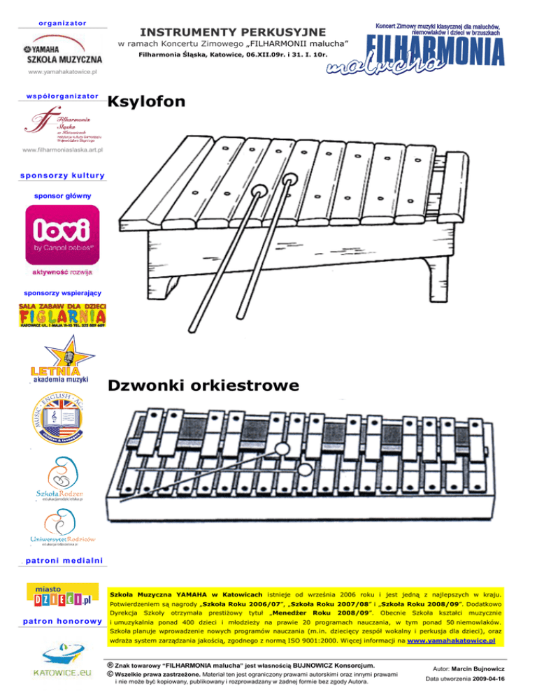 organizator INSTRUMENTY PERKUSYJNE w ramach Koncertu Zimowego „FILHARMONII malucha” Filharmonia Śląska, Katowice, 06.XII.09r. i 31. I. 10r. www.yamahakatowice.pl współorganiz ator Ksylofon www.filharmoniaslaska.art.pl sponsorzy kultury sponsor główny sponsorzy wspierający Dzwonki orkiestrowe pat roni m edi al ni Szkoła Muzyczna YAMAHA w Katowicach istnieje od września 2006 roku i jest jedną z najlepszych w kraju. Potwierdzeniem są nagrody „Szkoła Roku 2006/07”, „Szkoła Roku 2007/08” i „Szkoła Roku 2008/09”. Dodatkowo Dyrekcja pat ron honor owy Szkoły otrzymała prestiżowy tytuł „Menedżer Roku 2008/09”. Obecnie Szkoła kształci muzycznie i umuzykalnia ponad 400 dzieci i młodzieży na prawie 20 programach nauczania, w tym ponad 50 niemowlaków. Szkoła planuje wprowadzenie nowych programów nauczania (m.in. dziecięcy zespół wokalny i perkusja dla dzieci), oraz wdraża system zarządzania jakością, zgodnego z normą ISO 9001:2000. Więcej informacji na www.yamahakatowice.pl ® Znak towarowy “FILHARMONIA malucha” jest własnością BUJNOWICZ Konsorcjum. © Wszelkie prawa zastrzeżone. Materiał ten jest ograniczony prawami autorskimi oraz innymi prawami i nie może być kopiowany, publikowany i rozprowadzany w żadnej formie bez zgody Autora. Autor: Marcin Bujnowicz Data utworzenia 2009-04-16 organizator INSTRUMENTY PERKUSYJNE w ramach Koncertu Zimowego „FILHARMONII malucha” Filharmonia Śląska, Katowice, 06.XII.09r. i 31. I. 10r. www.yamahakatowice.pl współorganiz ator Bęben wielki www.filharmoniaslaska.art.pl sponsorzy kultury sponsor główny sponsorzy wspierający Kotły symfoniczne pat roni m edi al ni pat ron honor owy Plik: „kolPerkusyjneZima” Strona 2 z 2 Autor: Marcin Bujnowicz, dn. 2009-04-16 organizator INSTRUMENTY PERKUSYJNE w ramach Koncertu Zimowego „FILHARMONII malucha” Filharmonia Śląska, Katowice, 06.XII.09r. i 31. I. 10r. www.yamahakatowice.pl współorganiz ator Trójkąty www.filharmoniaslaska.art.pl sponsorzy kultury sponsor główny Werbel sponsorzy wspierający Bongosy pat roni m edi al ni pat ron honor owy Plik: „kolPerkusyjneZima” Strona 3 z 3 Autor: Marcin Bujnowicz, dn. 2009-04-16 organizator INSTRUMENTY PERKUSYJNE w ramach Koncertu Zimowego „FILHARMONII malucha” Filharmonia Śląska, Katowice, 06.XII.09r. i 31. I. 10r. www.yamahakatowice.pl współorganiz ator Zestaw perkusyjny www.filharmoniaslaska.art.pl sponsorzy kultury sponsor główny sponsorzy wspierający Bęben pat roni m edi al ni pat ron honor owy Plik: „kolPerkusyjneZima” Strona 4 z 4 Autor: Marcin Bujnowicz, dn. 2009-04-16