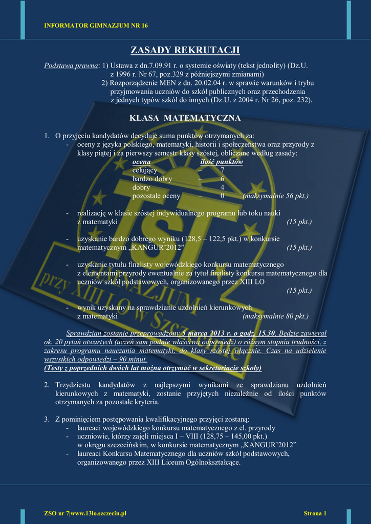 INFORMATOR GIMNAZJUM NR 16 ZASADY REKRUTACJI Podstawa prawna: 1) Ustawa z dn.7.09.91 r. o systemie oświaty (tekst jednolity) (Dz.U. z 1996 r. Nr 67, poz.329 z późniejszymi zmianami) 2) Rozporządzenie MEN z dn. 20.02.04 r. w sprawie warunków i trybu przyjmowania uczniów do szkół publicznych oraz przechodzenia z jednych typów szkół do innych (Dz.U. z 2004 r. Nr 26, poz. 232). KLASA MATEMATYCZNA 1. O przyjęciu kandydatów decyduje suma punktów otrzymanych za: - oceny z języka polskiego, matematyki, historii i społeczeństwa oraz przyrody z klasy piątej i za pierwszy semestr klasy szóstej, obliczane według zasady: ocena ilość punktów celujący – 7 bardzo dobry – 6 dobry – 4 pozostałe oceny – 0 (maksymalnie 56 pkt.) - realizację w klasie szóstej indywidualnego programu lub toku nauki z matematyki (15 pkt.) - uzyskanie bardzo dobrego wyniku (128,5 – 122,5 pkt.) w konkursie matematycznym „KANGUR’2012” (15 pkt.) - uzyskanie tytułu finalisty wojewódzkiego konkursu matematycznego z elementami przyrody ewentualnie za tytuł finalisty konkursu matematycznego dla uczniów szkół podstawowych, organizowanego przez XIII LO (15 pkt.) - wynik uzyskany na sprawdzianie uzdolnień kierunkowych z matematyki (maksymalnie 80 pkt.) Sprawdzian zostanie przeprowadzony 5 marca 2013 r. o godz. 15.30. Będzie zawierał ok. 20 pytań otwartych (uczeń sam podaje właściwą odpowiedź) o różnym stopniu trudności, z zakresu programu nauczania matematyki, do klasy szóstej włącznie. Czas na udzielenie wszystkich odpowiedzi – 90 minut. (Testy z poprzednich dwóch lat można otrzymać w sekretariacie szkoły) 2. Trzydziestu kandydatów z najlepszymi wynikami ze sprawdzianu uzdolnień kierunkowych z matematyki, zostanie przyjętych niezależnie od ilości punktów otrzymanych za pozostałe kryteria. 3. Z pominięciem postępowania kwalifikacyjnego przyjęci zostaną: - laureaci wojewódzkiego konkursu matematycznego z el. przyrody - uczniowie, którzy zajęli miejsca I – VIII (128,75 – 145,00 pkt.) w okręgu szczecińskim, w konkursie matematycznym „KANGUR’2012” - laureaci Konkursu Matematycznego dla uczniów szkół podstawowych, organizowanego przez XIII Liceum Ogólnokształcące. ZSO nr 7|www.13lo.szczecin.pl Strona 1 INFORMATOR GIMNAZJUM NR 16 KLASA OGÓLNA 1. O przyjęciu kandydatów decyduje suma punktów otrzymanych za: - oceny z języka polskiego, matematyki, historii i społeczeństwa oraz przyrody z klasy piątej i za pierwszy semestr klasy szóstej, obliczane według zasady: ocena ilość punktów celujący - 7 bardzo dobry - 6 dobry - 4 pozostałe oceny - 0 (maksymalnie 56 pkt.) - realizację, w klasie szóstej, indywidualnego programu lub toku nauki, z dowolnego przedmiotu (20 pkt.) - uzyskanie tytułu finalisty wojewódzkiego konkursu przedmiotowego dla uczniów szkół podstawowych ewentualnie uzyskanie tytułu finalisty Konkursu Humanistycznego, Historycznego, Przyrodniczego lub Matematycznego organizowanego przez XIII LO (25 pkt.) - stypendium Krajowego Funduszu na rzecz Dzieci - otrzymanie w roku szkolnym 2011/2012 Nagrody Prezydenta Miasta Szczecina (15 pkt.) - wynik uzyskany na sprawdzianie wiedzy ogólnej (maksymalnie 200 pkt.) (25 pkt.) Sprawdzian zostanie przeprowadzony 7 marca 2013 r. o godz. 15.30. Będzie miał formę testu złożonego z zadań zamkniętych jednokrotnego wyboru oraz zadań otwartych rozszerzonej i krótkiej odpowiedzi o różnym stopniu trudności, z zakresu podstawy programowej szkoły podstawowej. Czas na udzielenie wszystkich odpowiedzi – 90 minut. (Testy z poprzednich dwóch lat można otrzymać w sekretariacie szkoły) 2. Z pominięciem postępowania kwalifikacyjnego przyjęci zostaną laureaci wojewódzkich konkursów przedmiotowych dla uczniów szkół podstawowych oraz laureaci Konkursu Humanistycznego, Historycznego, Przyrodniczego, Matematycznego lub Języka angielskiego organizowanego przez XIII LO. Informacje dodatkowe: W razie rezygnacji, przed 3.07.2013 r. osoby zakwalifikowanej do danej klasy, w jej miejsce zostanie przyjęty kandydat z listy rezerwowej, zgodnie z kolejnością ustaloną w wyniku postępowania kwalifikacyjnego ZSO nr 7|www.13lo.szczecin.pl Strona 2