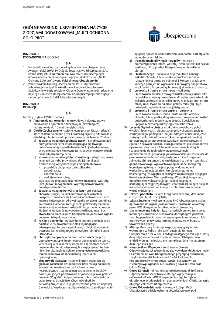 UI/OWU/111/10-2015/H OGÓLNE WARUNKI UBEZPIECZENIA NA ŻYCIE Z OPCJAMI DODATKOWYMI „MULTI OCHRONA SOLO PRO” ROZDZIAŁ 1 POSTANOWIENIA OGÓLNE § 1. 1. 2. Na podstawie niniejszych ogólnych warunków ubezpieczenia, zwanych dalej OWU, PKO Życie Towarzystwo Ubezpieczeń S.A., zwana dalej PKO Ubezpieczenia, zawiera z Ubezpieczającym umowę ubezpieczenia na życie z opcjami dodatkowymi „Multi Ochrona Solo pro”, zwaną dalej Umową Ubezpieczenia. Przez zawarcie Umowy Ubezpieczenia PKO Ubezpieczenia zobowiązuje się spełnić określone w Umowie Ubezpieczenia Świadczenie w razie zajścia w Okresie Odpowiedzialności zdarzenia objętego Zakresem Ubezpieczenia, a Ubezpieczający zobowiązuje się do opłacania Składek Ubezpieczeniowych. ROZDZIAŁ 2 DEFINICJE § 2. Terminy użyte w OWU oznaczają: 1) Amatorskie nurkowanie – niezawodowe i niewyczynowe nurkowanie z aparatem oddechowym (akwalungiem) maksymalnie do 10 metrów głębokości; 2) Ciężkie Zachorowanie – zajście jednego z poniższych zdarzeń, które zostało orzeczone przez Lekarza Specjalistę odpowiedniej dziedziny a także zostało potwierdzone przez Lekarza Zaufania: a) zaawansowana niewydolność nerek – schyłkowa postać niewydolności nerek charakteryzująca się trwałym i nieodwracalnym upośledzeniem funkcji obydwu nerek, w wyniku którego konieczne jest stosowanie przewlekłych dializ lub przeszczep nerki; b) zaawansowana niewydolność wątroby – schyłkowy okres schorzeń wątroby prowadzący do jej marskości z obecnością wszystkich wymienionych objawów: przewlekle utrzymująca się żółtaczka, wodobrzusze, encefalopatia, nadciśnienie wrotne; wyklucza się przypadki alkoholowej marskości wątroby i schyłkowej niewydolności wątroby spowodowanej nadużywaniem leków; c) zaawansowany nowotwór złośliwy - guz złośliwy charakteryzujący się niekontrolowanym wzrostem i rozprzestrzenianiem się komórek nowotworowych oraz inwazją i niszczeniem zdrowej tkanki; pojęciem tym objęte są również białaczka, za wyjątkiem przewlekłej białaczki limfatycznej, nowotwory układu limfatycznego i choroba Hodgkina; obecność nowotworu złośliwego musi być stwierdzona przez Lekarza Specjalistę na podstawie wyniku badania histopatologicznego; d) rozległe oparzenia – oparzenia III stopnia obejmujące co najmniej 20% powierzchni ciała i wymagające intensywnego leczenia szpitalnego; rozległość oparzenia oceniana jest według reguły dziewiątek lub tabeli Lunda i Brondera; e) chirurgiczna operacja na naczyniach wieńcowych – operacja wszczepienia pomostów omijających do tętnicy wieńcowej w celu korekcji zwężenia lub niedrożności co najmniej dwu tętnic wieńcowych, z wyłączeniem technik nie chirurgicznych, takich jak angioplastyka przezskórna, terapia laserowa lub inne metody leczenia nie operacyjnego; f) długotrwała śpiączka – stan, w którym stwierdza się głębokie zaburzenia świadomości, brak reakcji na bodźce zewnętrzne, zniesienie wszystkich odruchów neurologicznych, wymagający zastosowania środków podtrzymujących podstawowe czynności życiowe przez co najmniej 96 godzin. Rozpoznanie musi być potwierdzone przez Lekarza Specjalistę. Obecność ubytków neurologicznych musi być potwierdzona przez co najmniej 3 miesiące. Wyklucza się odpowiedzialność za długotrwałą Obowiązuje od 21 października 2015 r. 3) 4) 5) 6) 7) 8) 9) 10) śpiączkę spowodowaną zatruciem alkoholem, narkotykami lub nadużyciem leków; g) transplantacja głównych narządów – operacja przeszczepu serca, płuca, wątroby, nerki, trzustki lub szpiku kostnego, którą przebył Ubezpieczony w charakterze biorcy; h) utrata kończyn – całkowita fizyczna utrata kończyn wskutek choroby lub wypadku; warunkiem uznania roszczenia jest utrata co najmniej 2 kończyn; w zakresie kończyn górnych na wysokości lub powyżej nadgarstków, w zakresie kończyn dolnych powyżej stawów skokowych; i) całkowita i trwała utrata mowy – całkowita i nieodwracalna utrata mowy wskutek resekcji krtani albo przewlekłej choroby prowadzącej do zniszczenia krtani lub wskutek uszkodzenia ośrodka mowy w mózgu; stan utraty mowy musi trwać co najmniej przez 6 miesięcy i być potwierdzony badaniami specjalistycznymi; j) całkowita i trwała utrata wzroku – całkowita i nieodwracalna obustronna utrata wzroku wskutek choroby lub wypadku; diagnoza powyższa powinna zostać potwierdzona klinicznie przez Lekarza Specjalistę po upływie 6 miesięcy od wystąpienia schorzenia; Leczenie Szpitalne dłuższe niż 4 dni – całodobowy pobyt w celach leczniczych, diagnostycznych, wykonania zabiegu chirurgicznego, podleganie innym rodzajom opieki medycznej służącym ochronie zdrowia w zakładzie opieki zdrowotnej uprawnionym do oferowania świadczeń opieki zdrowotnej zgodnie z prawem polskim, którego zadaniem jest całodobowa opieka nad chorymi i ich leczenie w warunkach stałych, i w specjalnie do tych celów przystosowanych pomieszczeniach, posiadającym odpowiednią infrastrukturę do przeprowadzenia badań diagnostycznych i wykonywania zabiegów chirurgicznych, zatrudniającym w pełnym wymiarze godzin zawodowy i wykwalifikowany personel medyczny; leczeniem szpitalnym nie jest: pobyt w domu opieki, w placówce zajmującej się chirurgią plastyczną lub kosmetyczną (za wyjątkiem zabiegów naprawczych będących likwidacją skutków Nieszczęśliwego Wypadku), hospicjum, ośrodku rekonwalescencyjnym, rehabilitacyjnym, sanatoryjnym, wypoczynkowym; leczeniem szpitalnym nie jest też leczenie alkoholizmu i innych uzależnień oraz leczenie w trybie dziennym; Lekarz Specjalista – lekarz, który posiada ważny dokument o uzyskaniu tytułu specjalisty; Lekarz Zaufania – wskazana przez PKO Ubezpieczenia osoba uprawniona do wykonywania zawodu lekarza lub wskazany przez PKO Ubezpieczenia zakład opieki zdrowotnej; Licencjonowane linie lotnicze – przedsiębiorstwo transportu lotniczego uprawnione, 