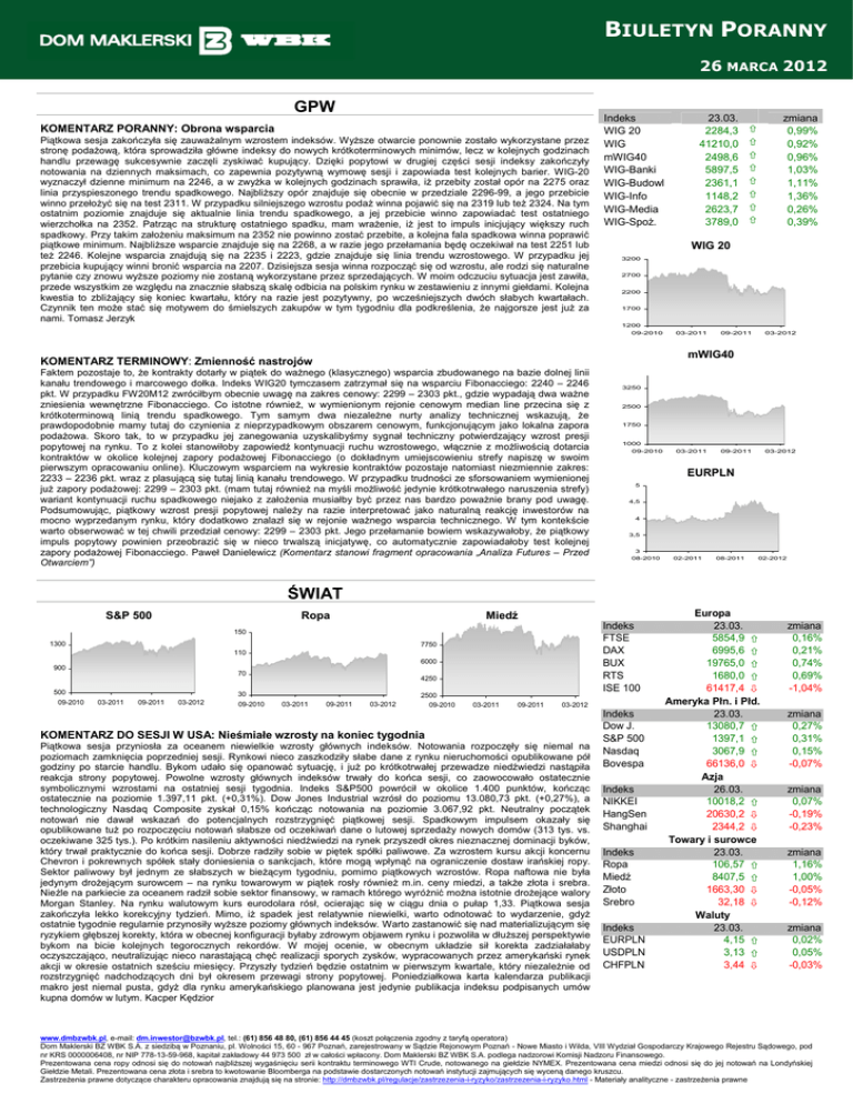 BIULETYN PORANNY o 26 MARCA 2012 GPW KOMENTARZ PORANNY: Obrona wsparcia Piątkowa sesja zakończyła się zauwaŜalnym wzrostem indeksów. WyŜsze otwarcie ponownie zostało wykorzystane przez stronę podaŜową, która sprowadziła główne indeksy do nowych krótkoterminowych minimów, lecz w kolejnych godzinach handlu przewagę sukcesywnie zaczęli zyskiwać kupujący. Dzięki popytowi w drugiej części sesji indeksy zakończyły notowania na dziennych maksimach, co zapewnia pozytywną wymowę sesji i zapowiada test kolejnych barier. WIG-20 wyznaczył dzienne minimum na 2246, a w zwyŜka w kolejnych godzinach sprawiła, iŜ przebity został opór na 2275 oraz linia przyspieszonego trendu spadkowego. NajbliŜszy opór znajduje się obecnie w przedziale 2296-99, a jego przebicie winno przełoŜyć się na test 2311. W przypadku silniejszego wzrostu podaŜ winna pojawić się na 2319 lub teŜ 2324. Na tym ostatnim poziomie znajduje się aktualnie linia trendu spadkowego, a jej przebicie winno zapowiadać test ostatniego wierzchołka na 2352. Patrząc na strukturę ostatniego spadku, mam wraŜenie, iŜ jest to impuls inicjujący większy ruch spadkowy. Przy takim załoŜeniu maksimum na 2352 nie powinno zostać przebite, a kolejna fala spadkowa winna poprawić piątkowe minimum. NajbliŜsze wsparcie znajduje się na 2268, a w razie jego przełamania będę oczekiwał na test 2251 lub teŜ 2246. Kolejne wsparcia znajdują się na 2235 i 2223, gdzie znajduje się linia trendu wzrostowego. W przypadku jej przebicia kupujący winni bronić wsparcia na 2207. Dzisiejsza sesja winna rozpocząć się od wzrostu, ale rodzi się naturalne pytanie czy znowu wyŜsze poziomy nie zostaną wykorzystane przez sprzedających. W moim odczuciu sytuacja jest zawiła, przede wszystkim ze względu na znacznie słabszą skalę odbicia na polskim rynku w zestawieniu z innymi giełdami. Kolejna kwestia to zbliŜający się koniec kwartału, który na razie jest pozytywny, po wcześniejszych dwóch słabych kwartałach. Czynnik ten moŜe stać się motywem do śmielszych zakupów w tym tygodniu dla podkreślenia, Ŝe najgorsze jest juŜ za nami. Tomasz Jerzyk Indeks WIG 20 WIG mWIG40 WIG-Banki WIG-Budowl WIG-Info WIG-Media WIG-SpoŜ. 23.03. 2284,3 41210,0 2498,6 5897,5 2361,1 1148,2 2623,7 3789,0 zmiana 0,99% 0,92% 0,96% 1,03% 1,11% 1,36% 0,26% 0,39% WIG 20 3200 2700 2200 1700 1200 09-2010 03-2011 09-2011 03-2012 mWIG40 KOMENTARZ TERMINOWY: Zmienność nastrojów Faktem pozostaje to, Ŝe kontrakty dotarły w piątek do waŜnego (klasycznego) wsparcia zbudowanego na bazie dolnej linii kanału trendowego i marcowego dołka. Indeks WIG20 tymczasem zatrzymał się na wsparciu Fibonacciego: 2240 – 2246 pkt. W przypadku FW20M12 zwróciłbym obecnie uwagę na zakres cenowy: 2299 – 2303 pkt., gdzie wypadają dwa waŜne zniesienia wewnętrzne Fibonacciego. Co istotne równieŜ, w wymienionym rejonie cenowym median line przecina się z krótkoterminową linią trendu spadkowego. Tym samym dwa niezaleŜne nurty analizy technicznej wskazują, Ŝe prawdopodobnie mamy tutaj do czynienia z nieprzypadkowym obszarem cenowym, funkcjonującym jako lokalna zapora podaŜowa. Skoro tak, to w przypadku jej zanegowania uzyskalibyśmy sygnał techniczny potwierdzający wzrost presji popytowej na rynku. To z kolei stanowiłoby zapowiedź kontynuacji ruchu wzrostowego, włącznie z moŜliwością dotarcia kontraktów w okolice kolejnej zapory podaŜowej Fibonacciego (o dokładnym umiejscowieniu strefy napiszę w swoim pierwszym opracowaniu online). Kluczowym wsparciem na wykresie kontraktów pozostaje natomiast niezmiennie zakres: 2233 – 2236 pkt. wraz z plasującą się tutaj linią kanału trendowego. W przypadku trudności ze sforsowaniem wymienionej juŜ zapory podaŜowej: 2299 – 2303 pkt. (mam tutaj równieŜ na myśli moŜliwość jedynie krótkotrwałego naruszenia strefy) wariant kontynuacji ruchu spadkowego niejako z załoŜenia musiałby być przez nas bardzo powaŜnie brany pod uwagę. Podsumowując, piątkowy wzrost presji popytowej naleŜy na razie interpretować jako naturalną reakcję inwestorów na mocno wyprzedanym rynku, który dodatkowo znalazł się w rejonie waŜnego wsparcia technicznego. W tym kontekście warto obserwować w tej chwili przedział cenowy: 2299 – 2303 pkt. Jego przełamanie bowiem wskazywałoby, Ŝe piątkowy impuls popytowy powinien przeobrazić się w nieco trwalszą inicjatywę, co automatycznie zapowiadałoby test kolejnej zapory podaŜowej Fibonacciego. Paweł Danielewicz (Komentarz stanowi fragment opracowania „Analiza Futures – Przed Otwarciem”) 3250 2500 1750 1000 09-2010 03-2011 09-2011 03-2012 EURPLN 5 4,5 4 3,5 3 08-2010 02-2011 08-2011 02-2012 ŚWIAT S&P 500 Ropa Miedź Indeks FTSE DAX BUX RTS ISE 100 150 1300 7750 110 6000 900 70 500 09-2010 4250 30 03-2011 09-2011 03-2012 09-2010 2500 03-2011 09-2011 03-2012 09-2010 03-2011 09-2011 03-2012 KOMENTARZ DO SESJI W USA: Nieśmiałe wzrosty na koniec tygodnia Piątkowa sesja przyniosła za oceanem niewielkie wzrosty głównych indeksów. Notowania rozpoczęły się niemal na poziomach zamknięcia poprzedniej sesji. Rynkowi nieco zaszkodziły słabe dane z rynku nieruchomości opublikowane pół godziny po starcie handlu. Bykom udało się opanować sytuację, i juŜ po krótkotrwałej przewadze niedźwiedzi nastąpiła reakcja strony popytowej. Powolne wzrosty głównych indeksów trwały do końca sesji, co zaowocowało ostatecznie symbolicznymi wzrostami na ostatniej sesji tygodnia. Indeks S&P500 powrócił w okolice 1.400 punktów, kończąc ostatecznie na poziomie 1.397,11 pkt. (+0,31%). Dow Jones Industrial wzrósł do poziomu 13.080,73 pkt. (+0,27%), a technologiczny Nasdaq Composite zyskał 0,15% kończąc notowania na poziomie 3.067,92 pkt. Neutralny początek notowań nie dawał wskazań do potencjalnych rozstrzygnięć piątkowej sesji. Spadkowym impulsem okazały się opublikowane tuŜ po rozpoczęciu notowań słabs